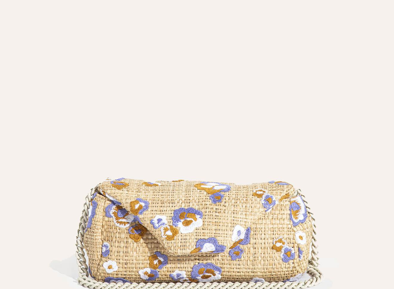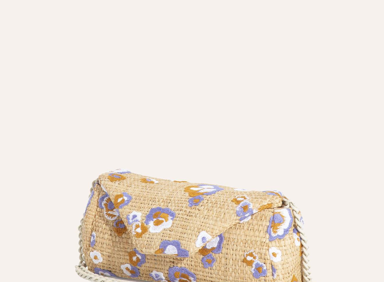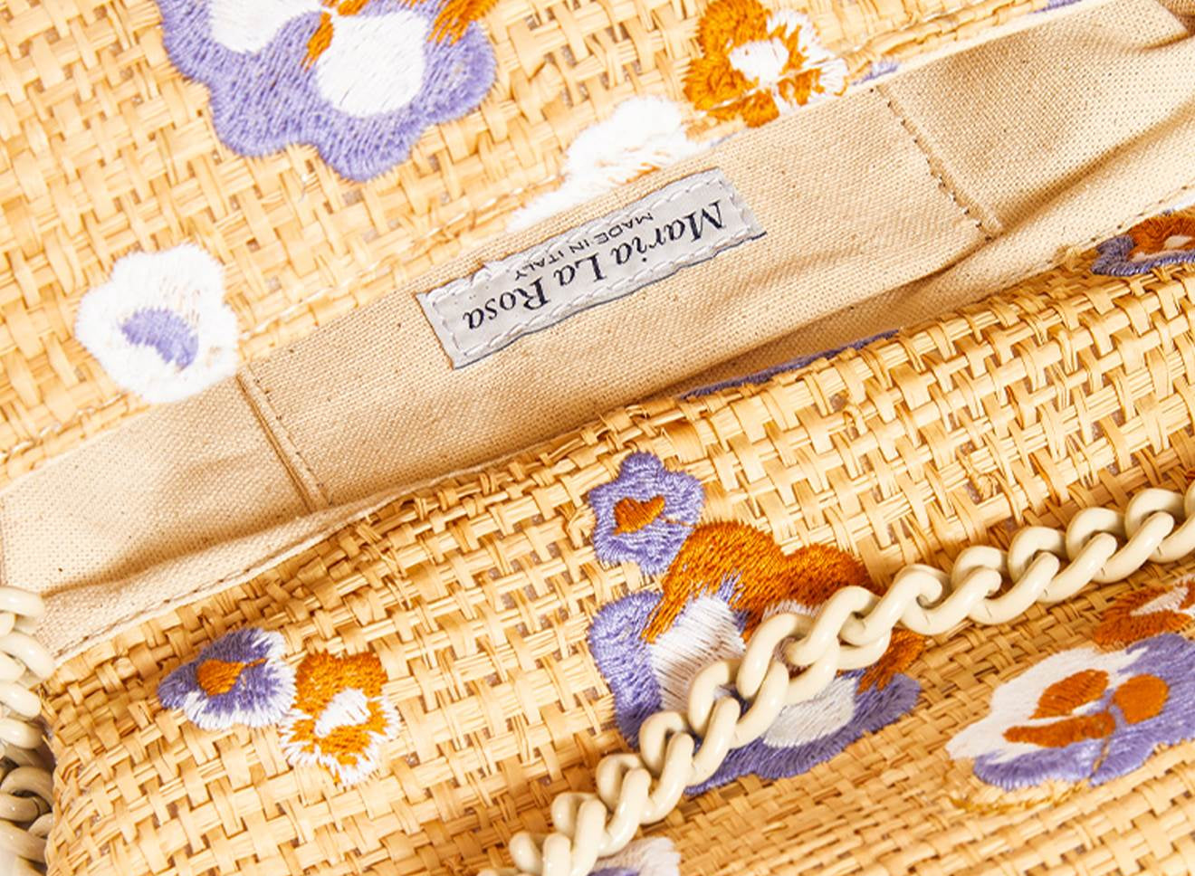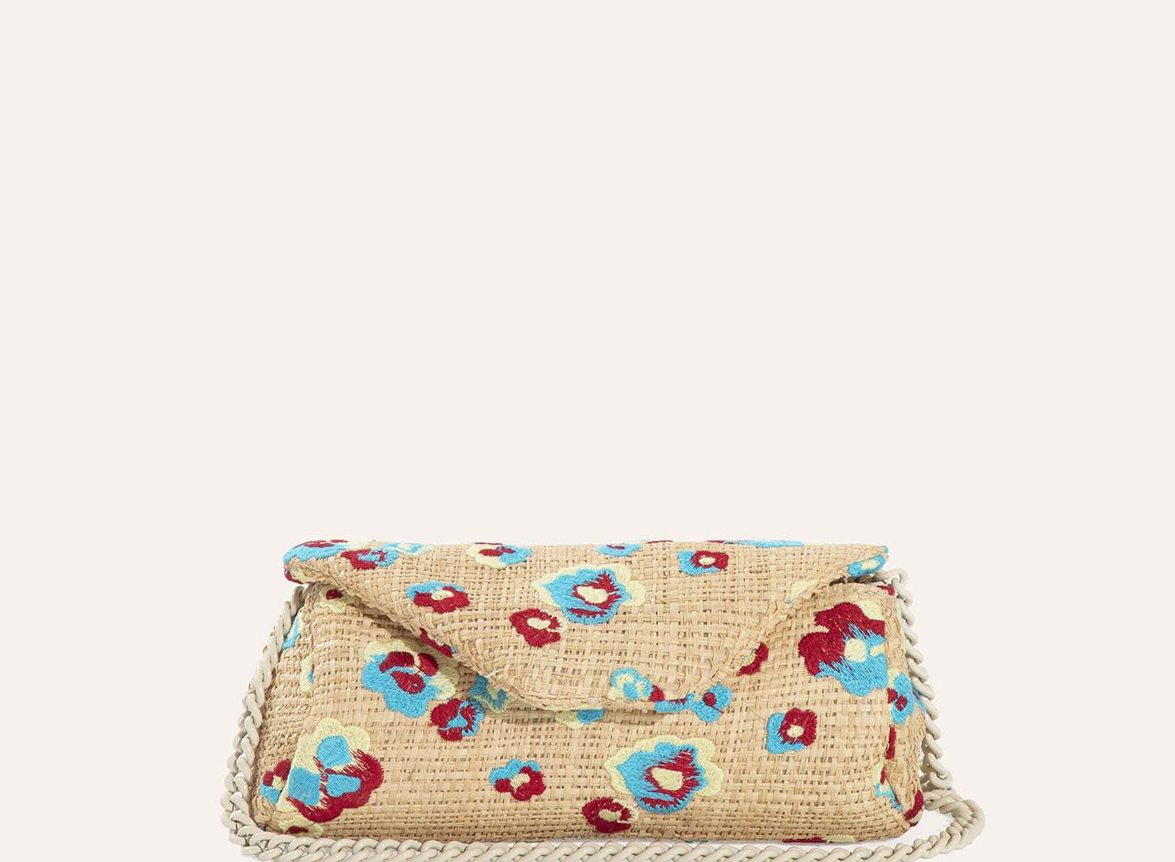 Borsa da donna a spalla, di piccole dimensioni, in rafia ricamata. La raffinata decorazione a fiori arricchisce un accessorio ideale per l’estate, spazioso e versatile. Interamente disegnata e prodotta in Italia.