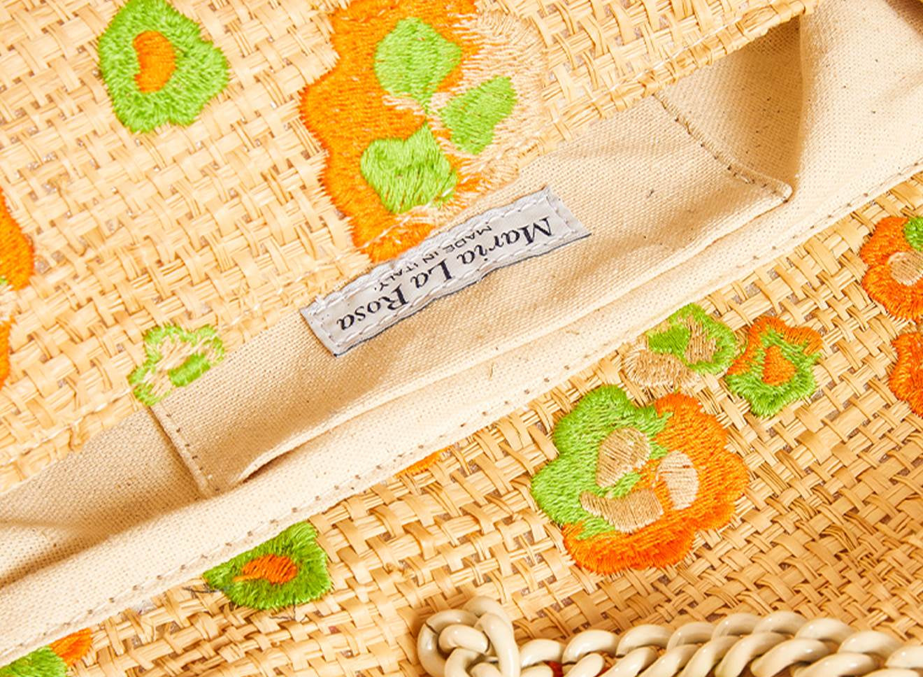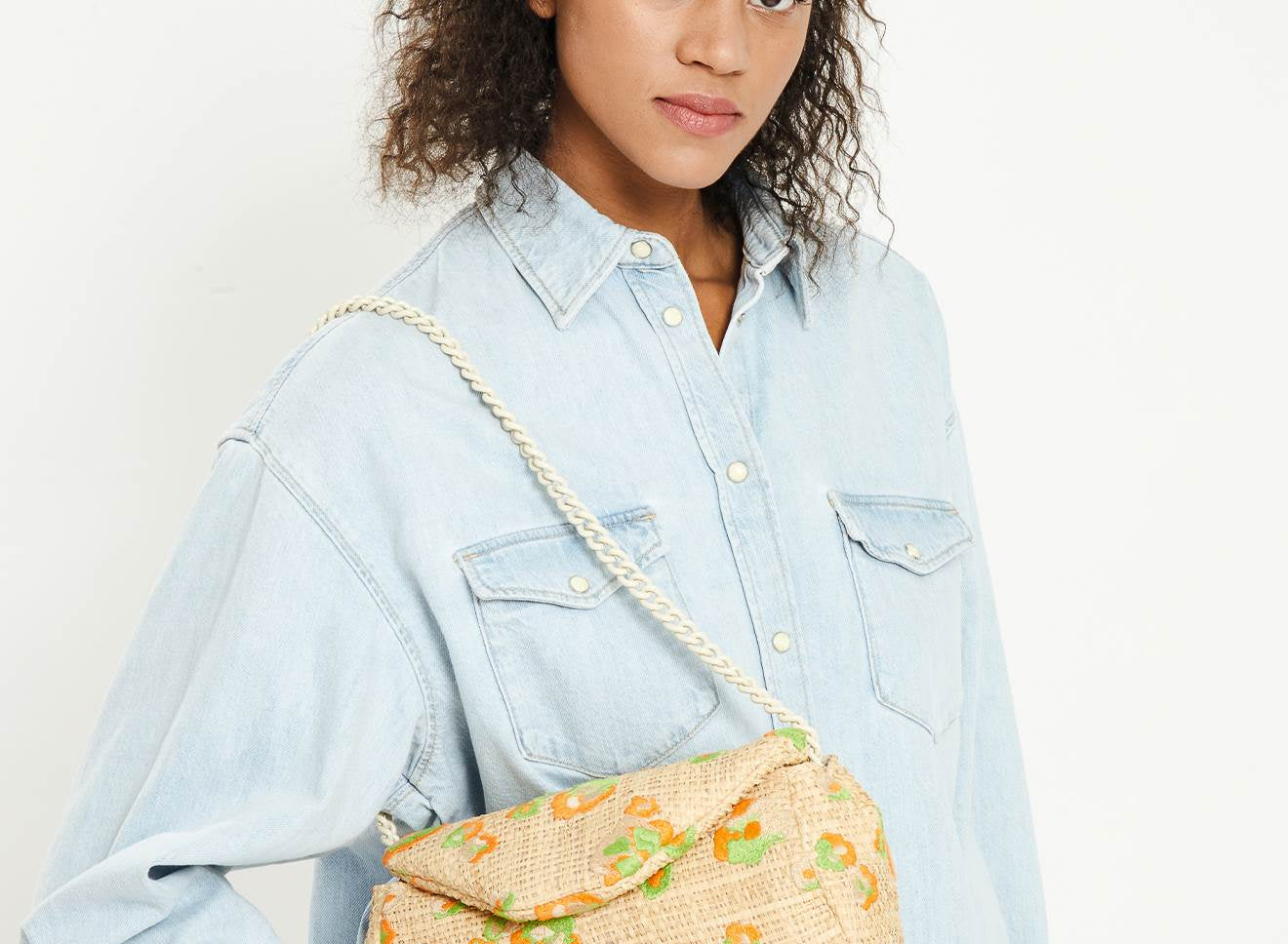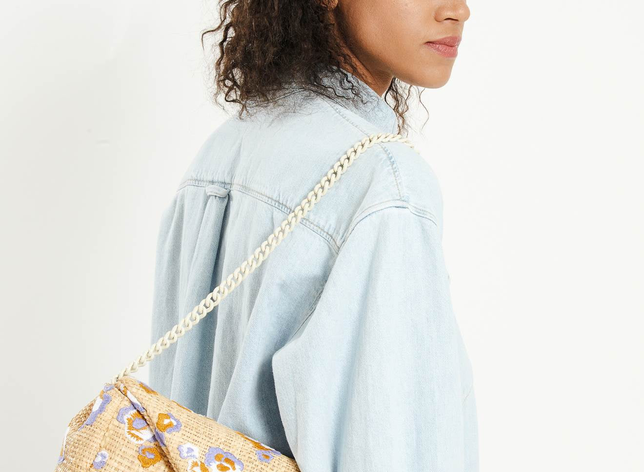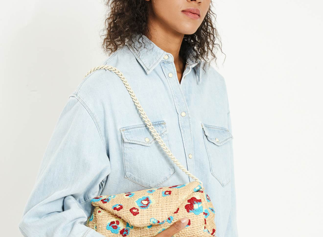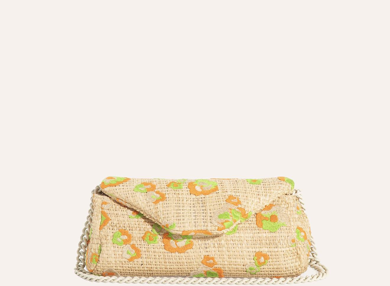 Borsa da donna a spalla, di piccole dimensioni, in rafia ricamata. La raffinata decorazione a fiori arricchisce un accessorio ideale per l’estate, spazioso e versatile. Interamente disegnata e prodotta in Italia.