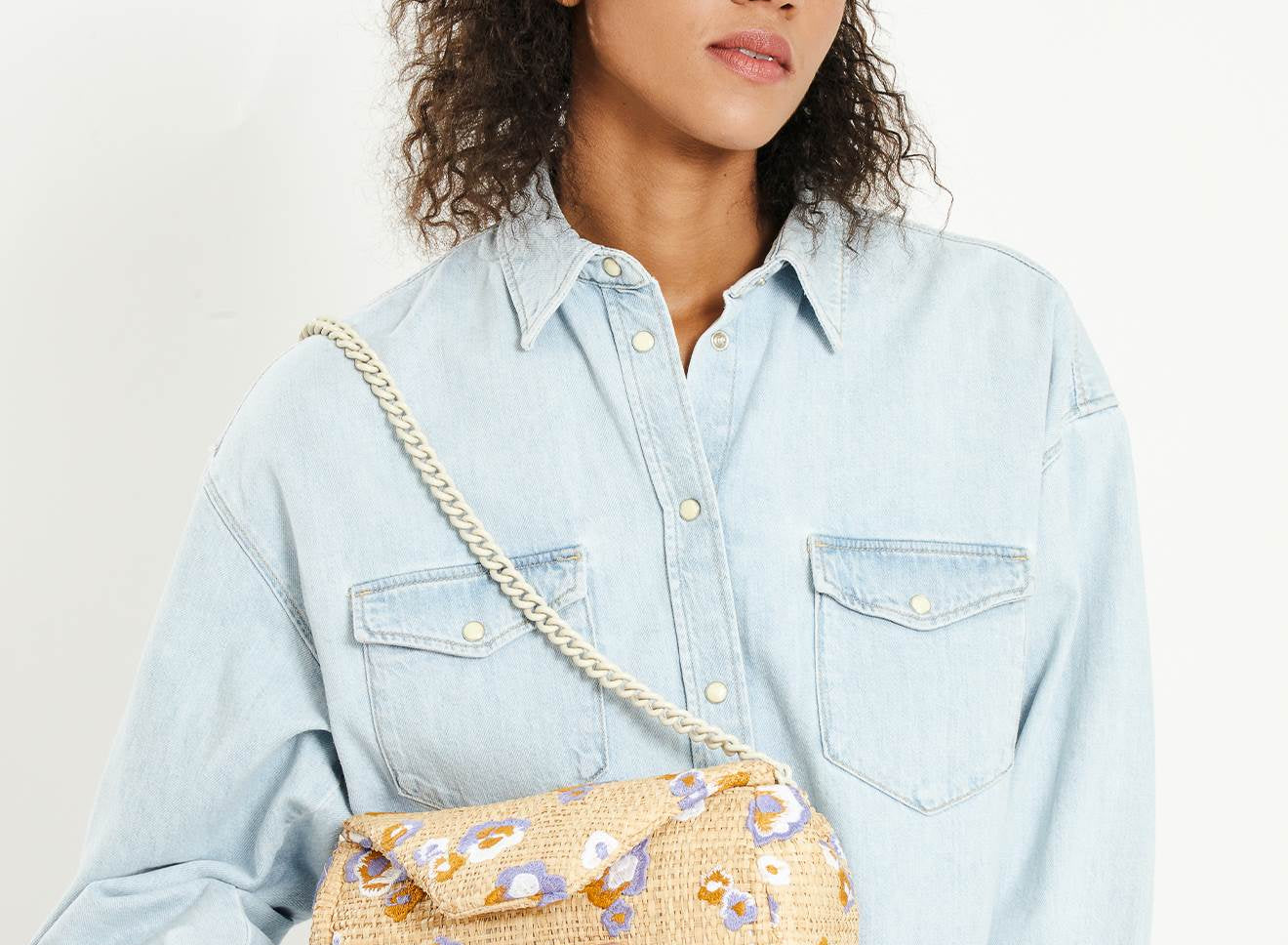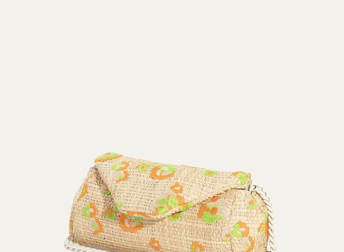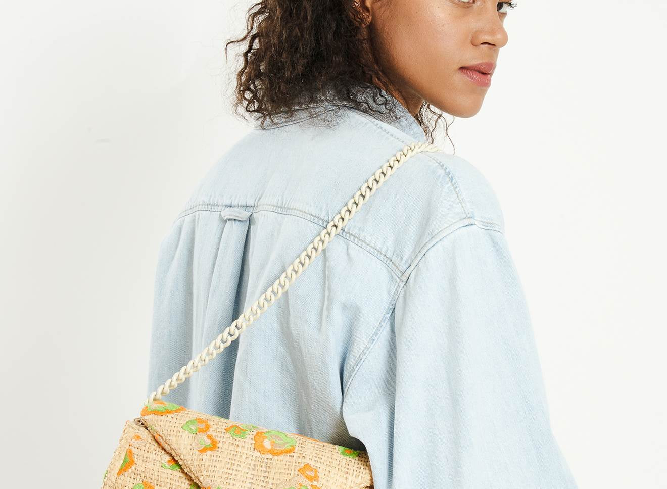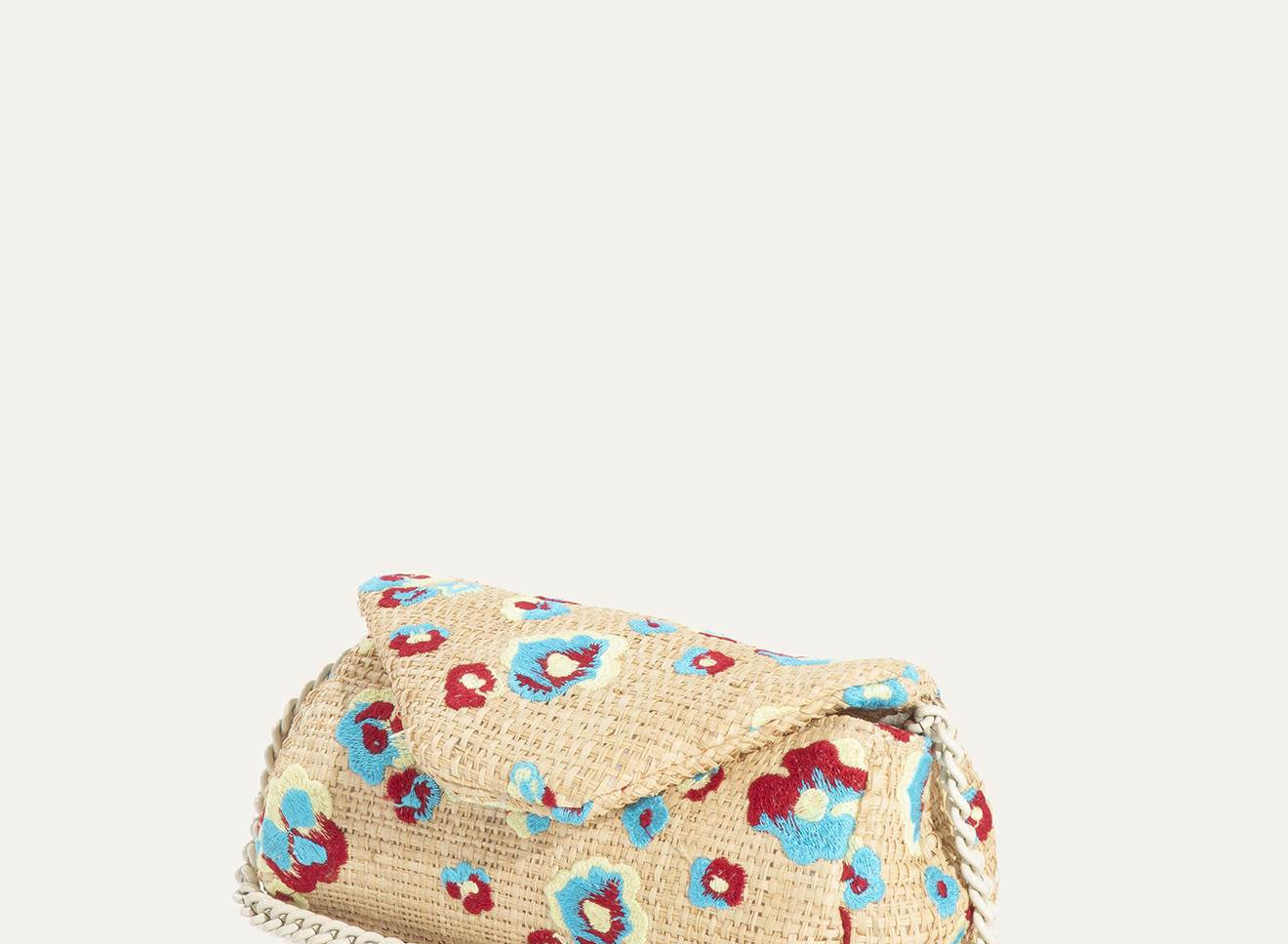Borsa da donna a spalla, di piccole dimensioni, in rafia ricamata. La raffinata decorazione a fiori arricchisce un accessorio ideale per l’estate, spazioso e versatile. Interamente disegnata e prodotta in Italia.