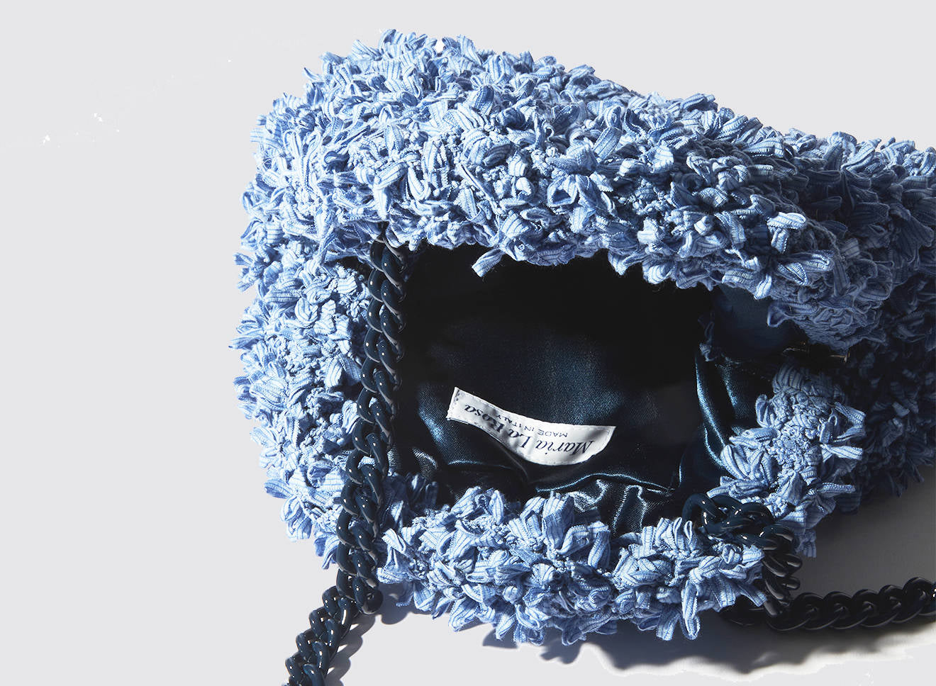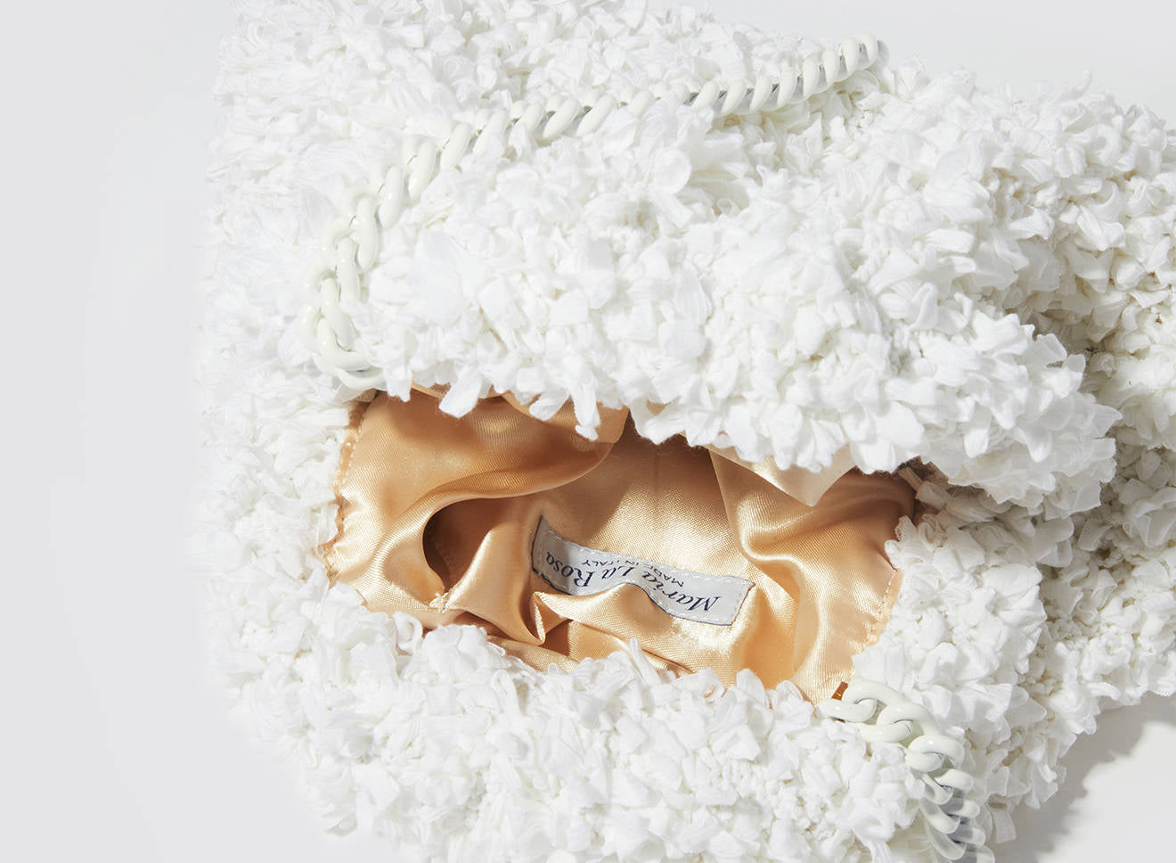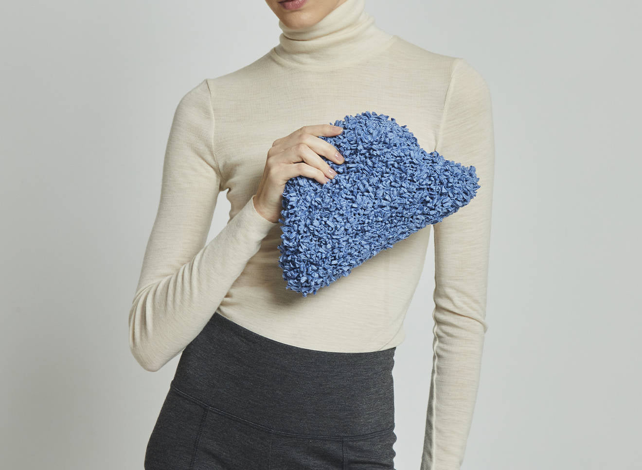 Dal design contemporaneo, questa clutch è realizzata con i preziosi filati fantasia di Vimar1991, che coniugano artigianalità e stile. Vimar1991 è un’azienda italiana specializzata in filati di alta qualità, scelti dai principali protagonisti del mondo del lusso. Interamente realizzati in Italia con fibre nobili e certificate, questi filati prendono vita grazie a un lungo processo produttivo, arricchito da tecniche artigianali che preservano un raffinato savoir-faire.