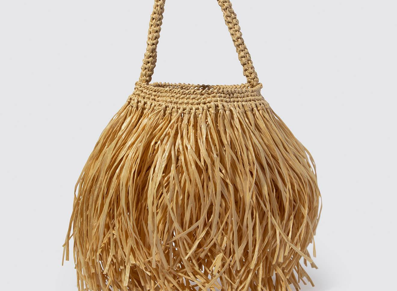 Secchiello di medie dimensioni in rafia, ricoperto da una nuvola di frange boho-chic, che aggiungono un tocco di freschezza e movimento, rendendolo ideale per spiagge, picnic e uscite in città.