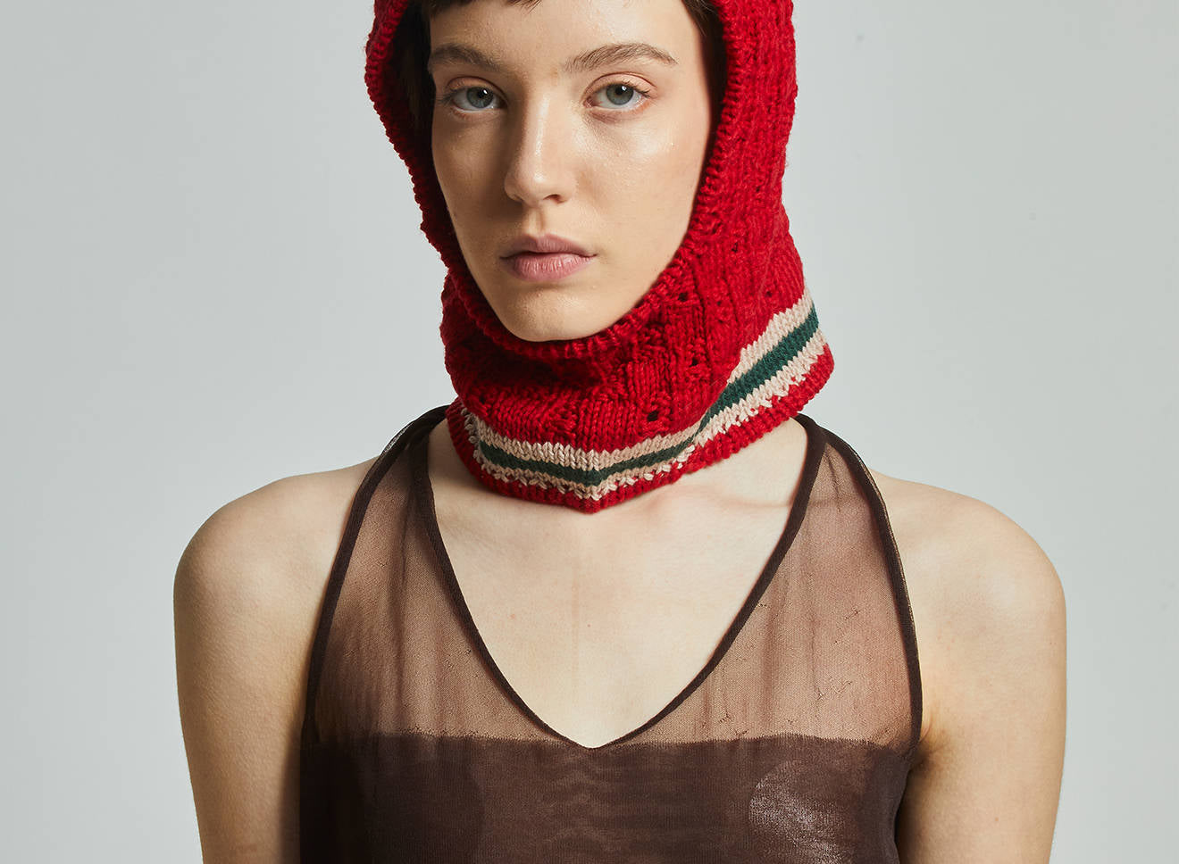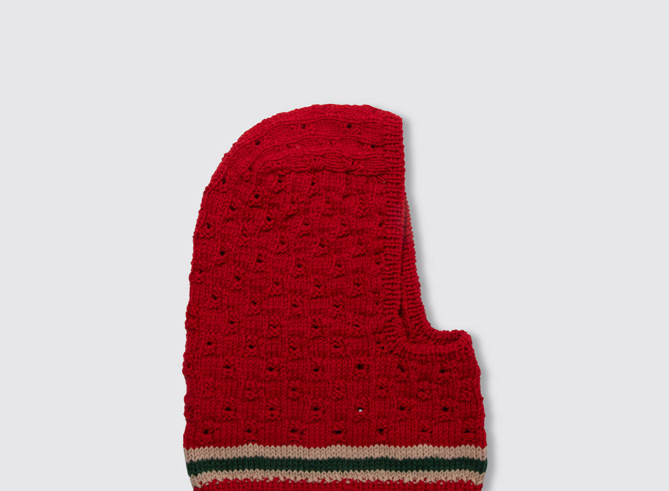 Balaclava in lana, interamente realizzato a mano con tecniche di lavorazione a maglia tradizionali.