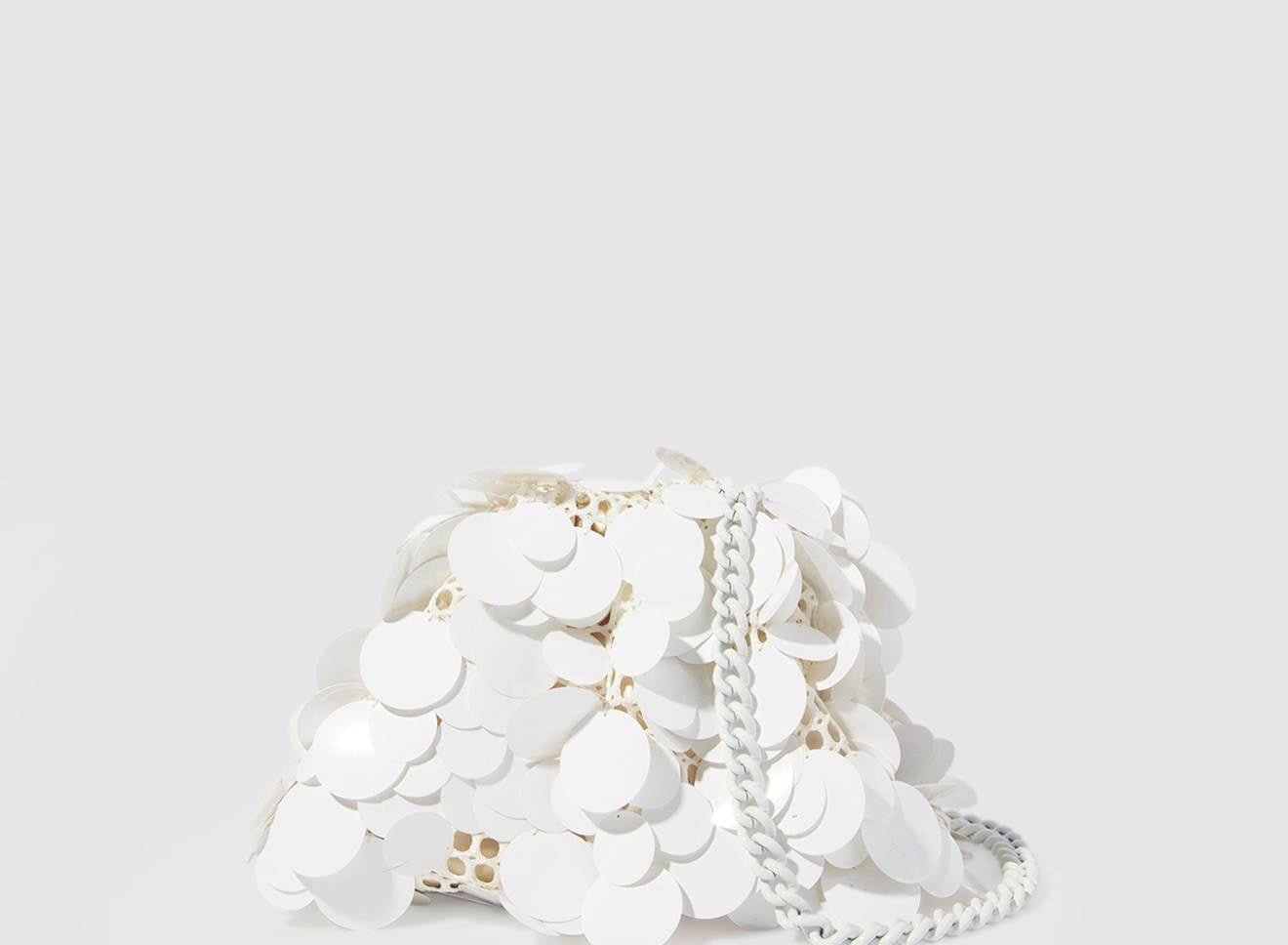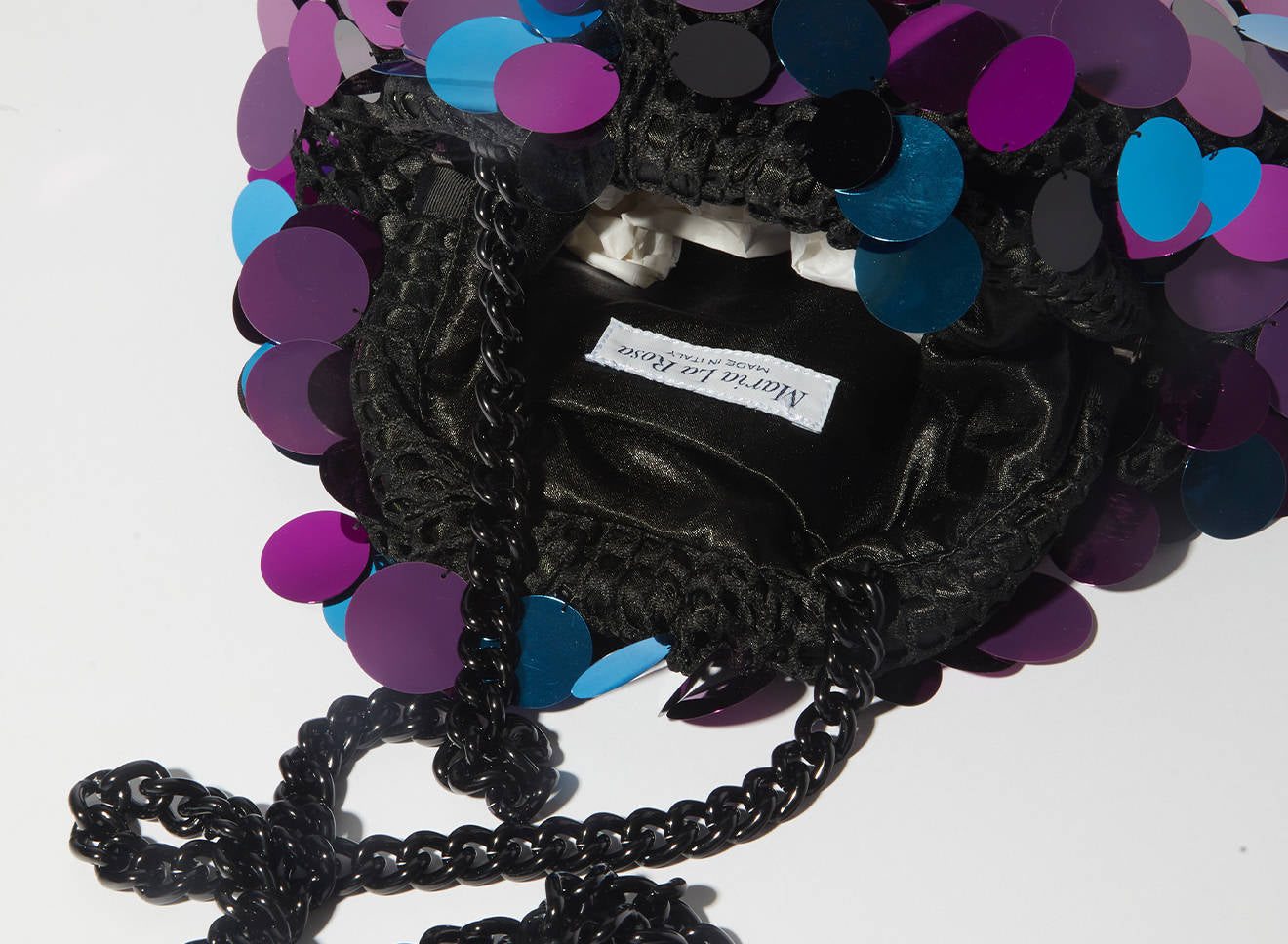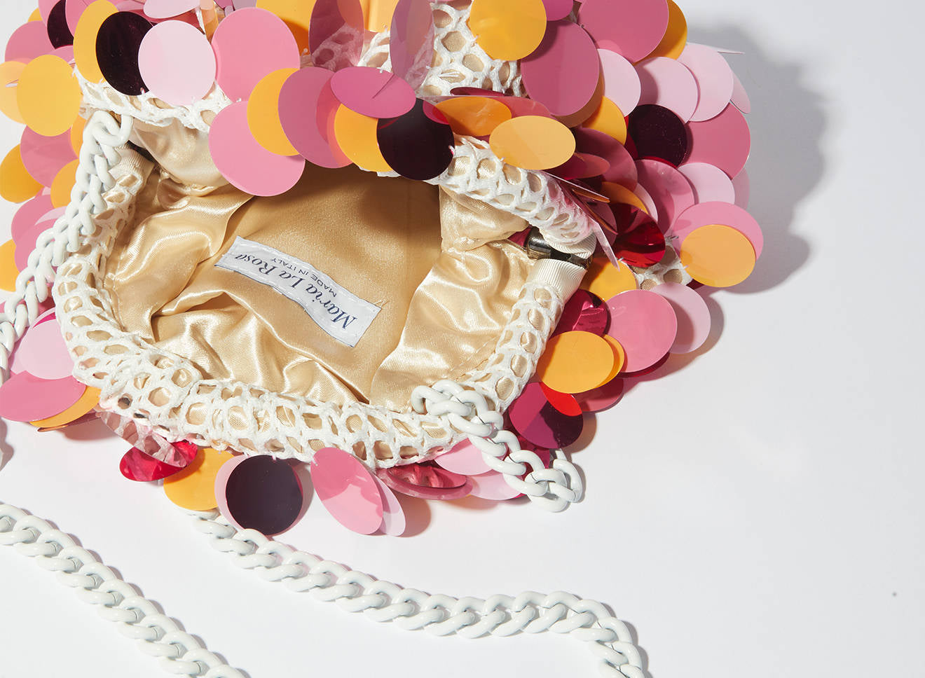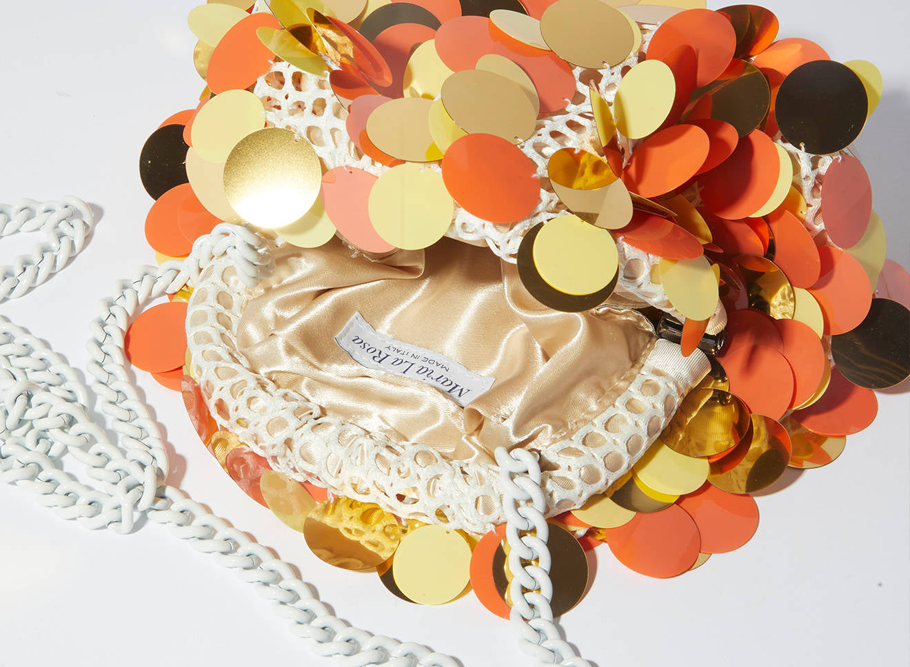 Clutch da donna di piccole dimensioni realizzata in tessuto ricamato a mano con maxi paillettes. Questo modello costituisce l’icon bag Maria La Rosa, perfetta per tutte le stagioni, emblema di una nuova eleganza metropolitana, che assicura capienza e funzionalità. Il tessuto in paillettes si fa notare per il suo design eccentrico e conferisce ai tuoi look un tocco di elegante vivacità. È dotata di catena abbinata per indossarla anche a tracolla.