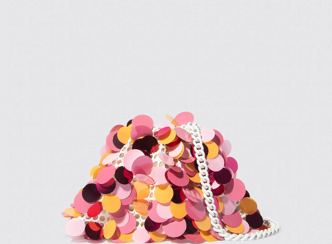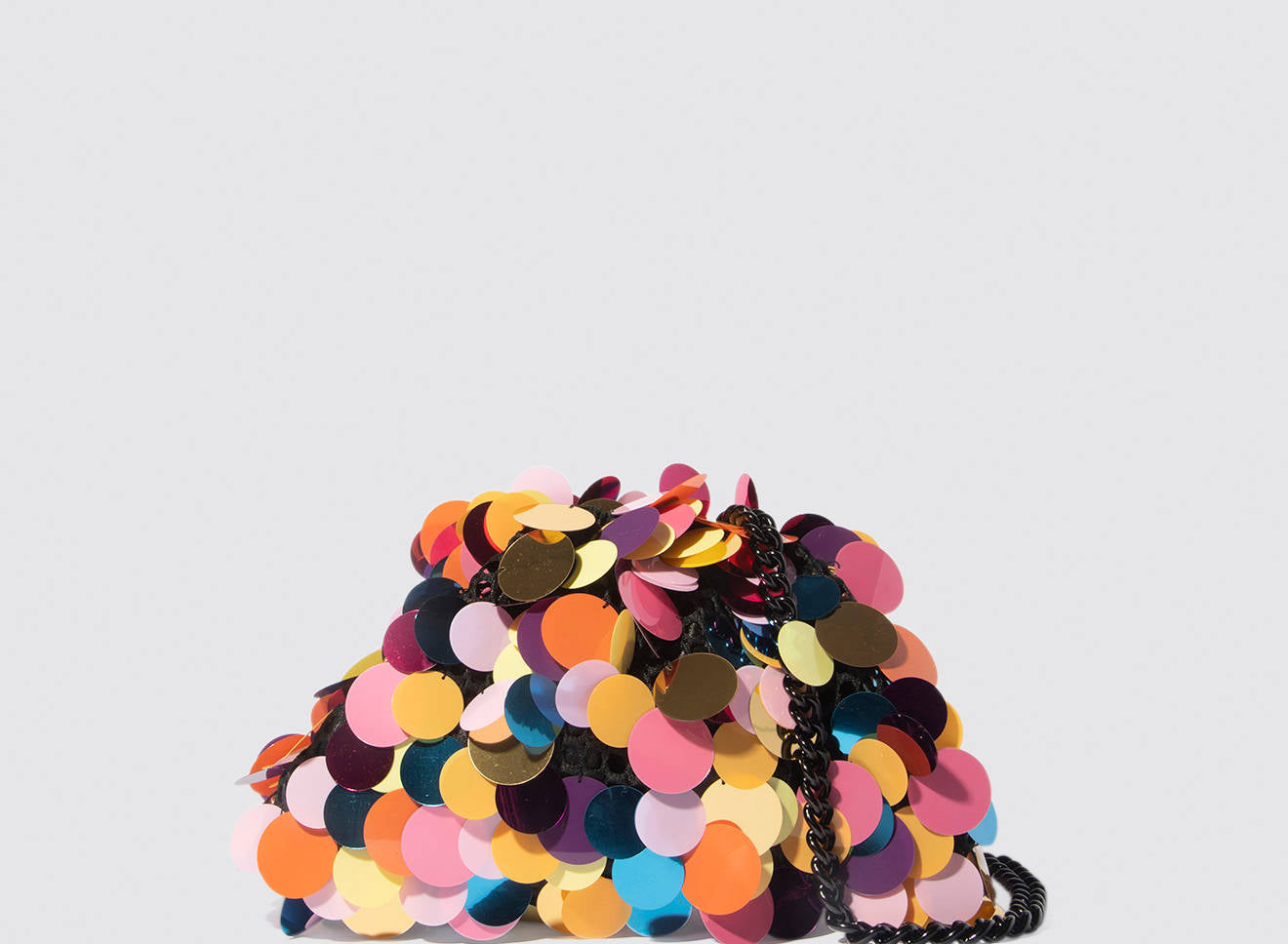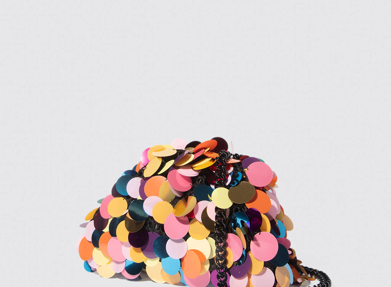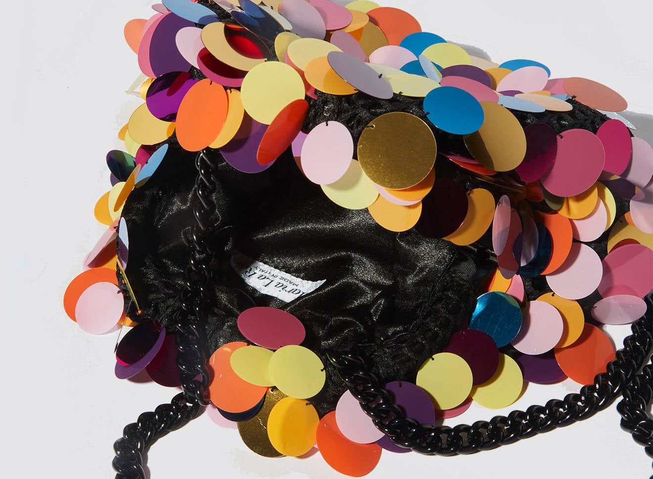 Clutch da donna di piccole dimensioni realizzata in tessuto ricamato a mano con maxi paillettes. Questo modello costituisce l’icon bag Maria La Rosa, perfetta per tutte le stagioni, emblema di una nuova eleganza metropolitana, che assicura capienza e funzionalità. Il tessuto in paillettes si fa notare per il suo design eccentrico e conferisce ai tuoi look un tocco di elegante vivacità. È dotata di catena abbinata per indossarla anche a tracolla.