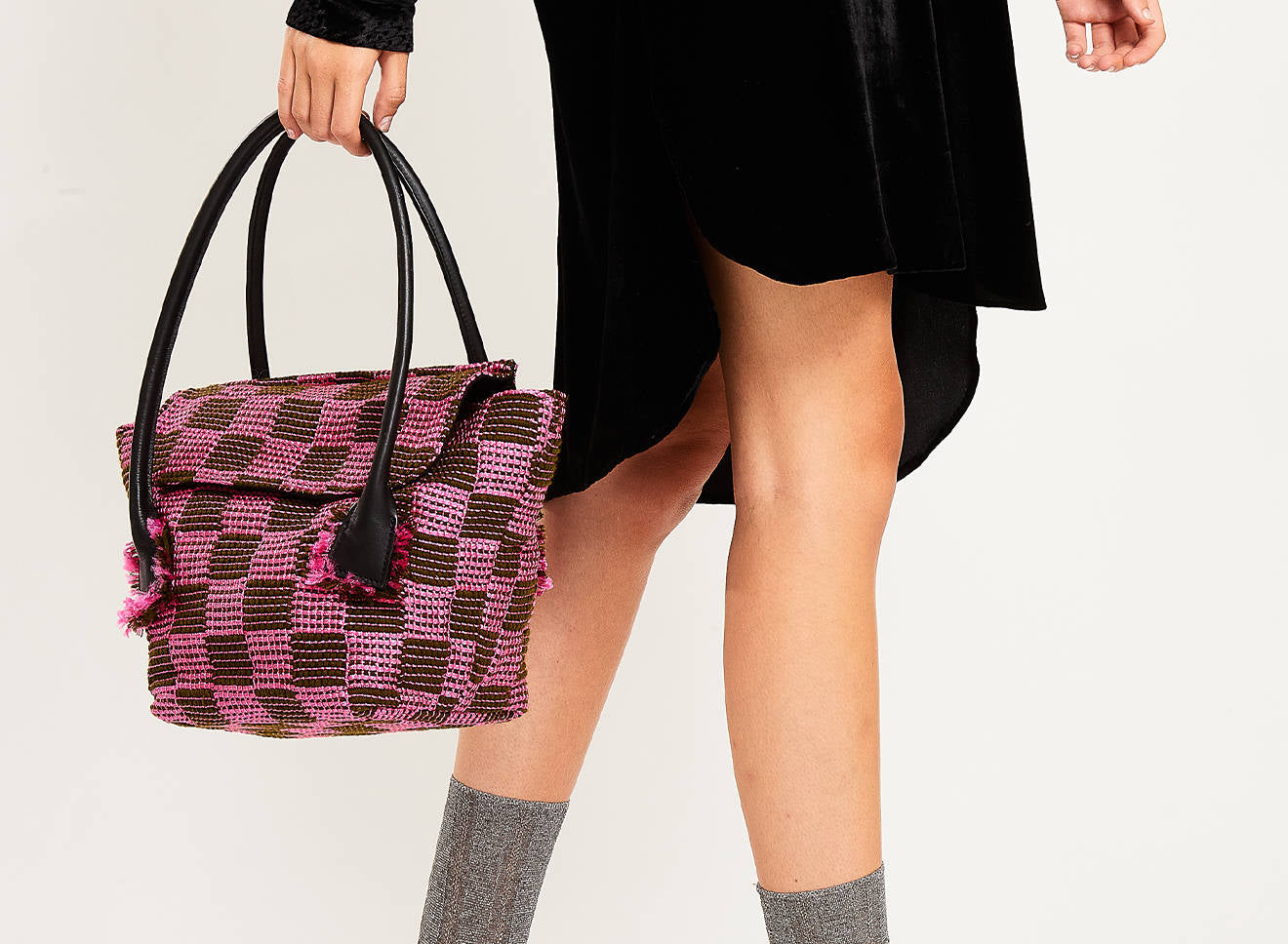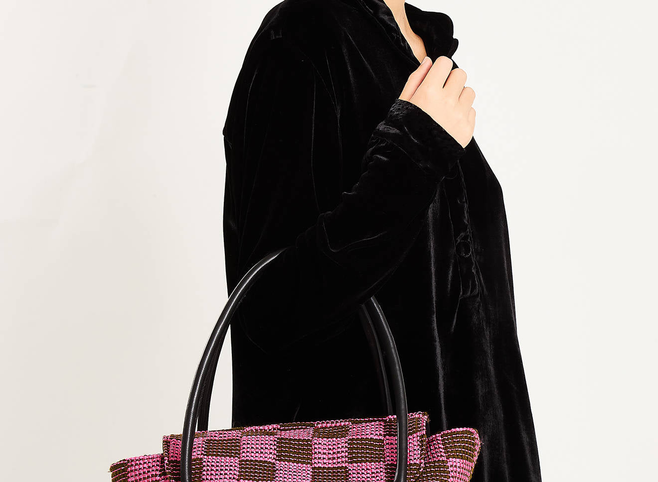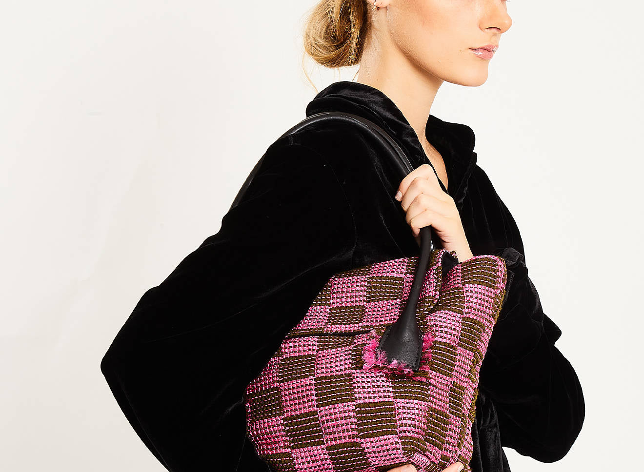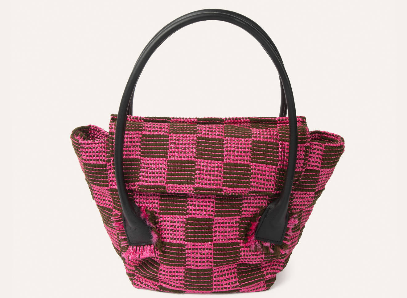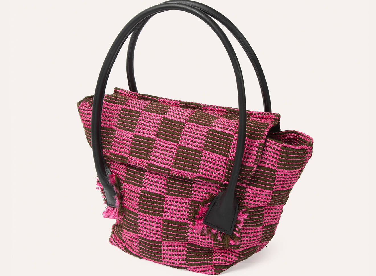 Borsa da donna di grandi dimensioni, in tessuto realizzato a mano su antichi telai, dotata di manici in pelle. Lo stile essenziale, e il tessuto caratterizzato da un motivo a scacchi, mettono in risalto la raffinatezza dell’intreccio.