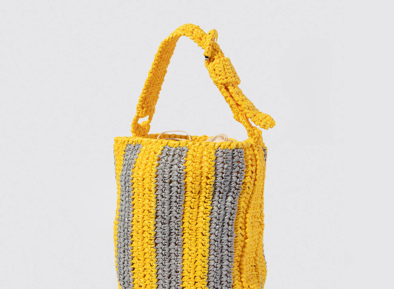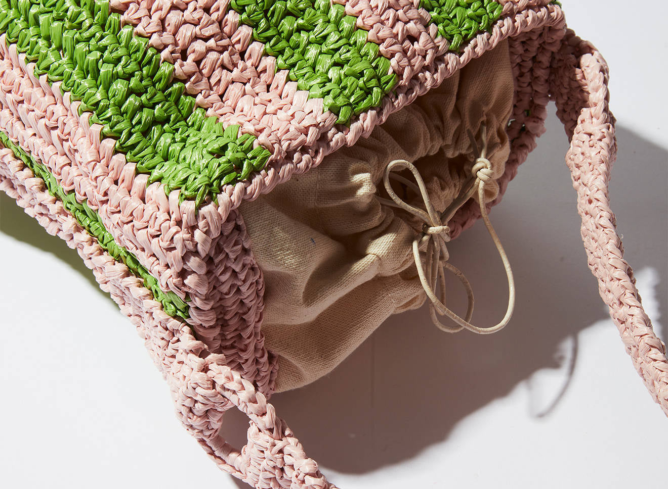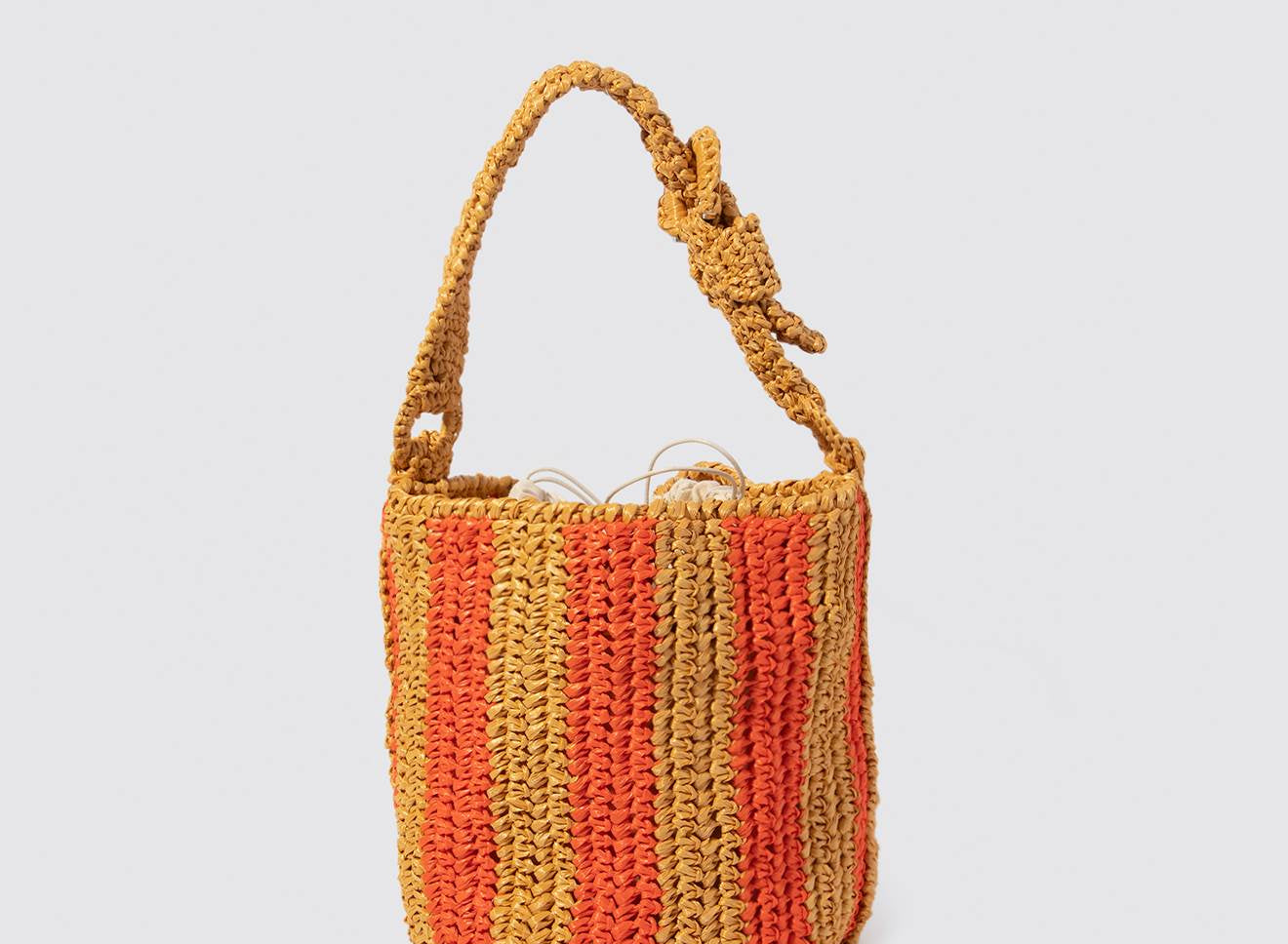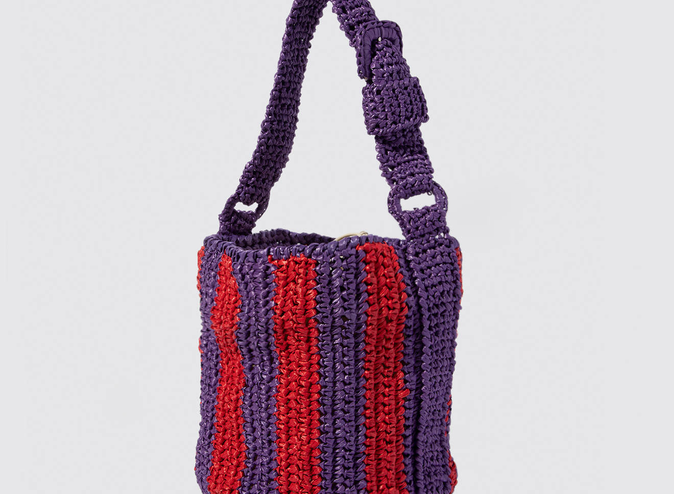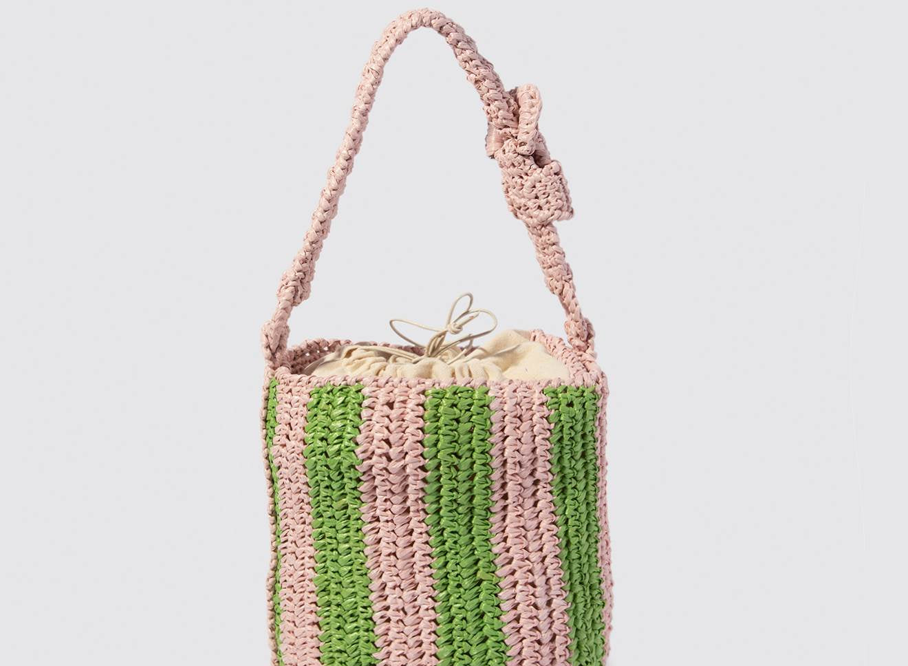 Borsa da donna di piccole dimensioni, in tessuto di rafia, realizzato a mano con tecnica crochet. È la risposta di Maria La Rosa alla tendenza sempreverde delle borse a secchiello. Perfetto per aggiungere un tocco di freschezza e stile al tuo look estivo. La sua forma minimale è arricchita da un motivo a righe in tonalità pastello, ideali per chi cerca praticità senza rinunciare alla moda.Interamente disegnata e prodotta in Italia.