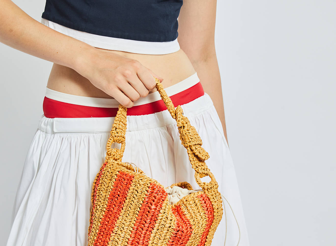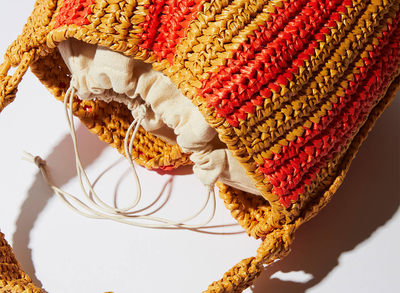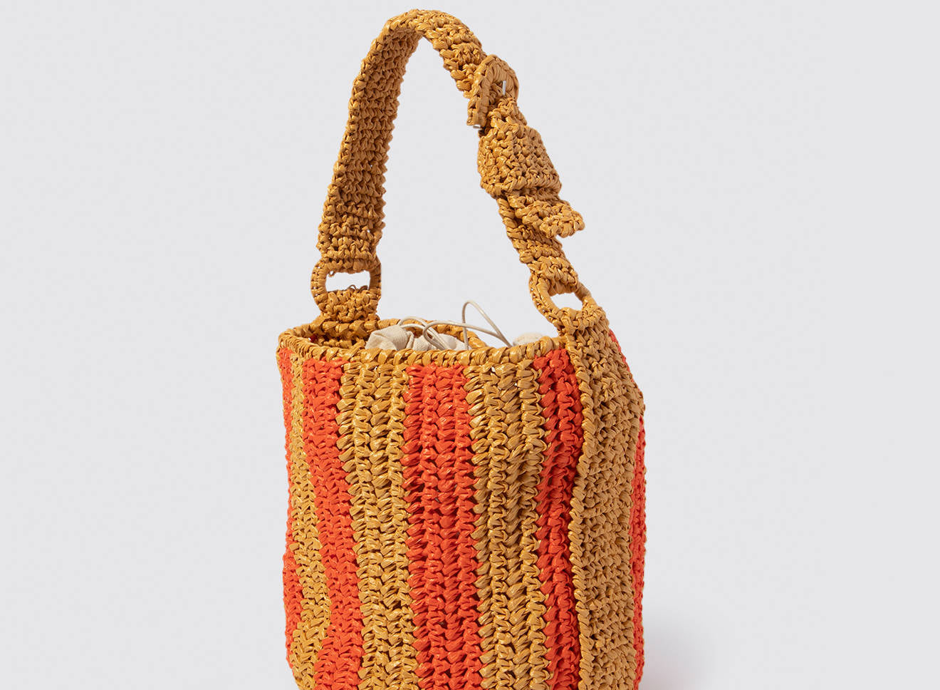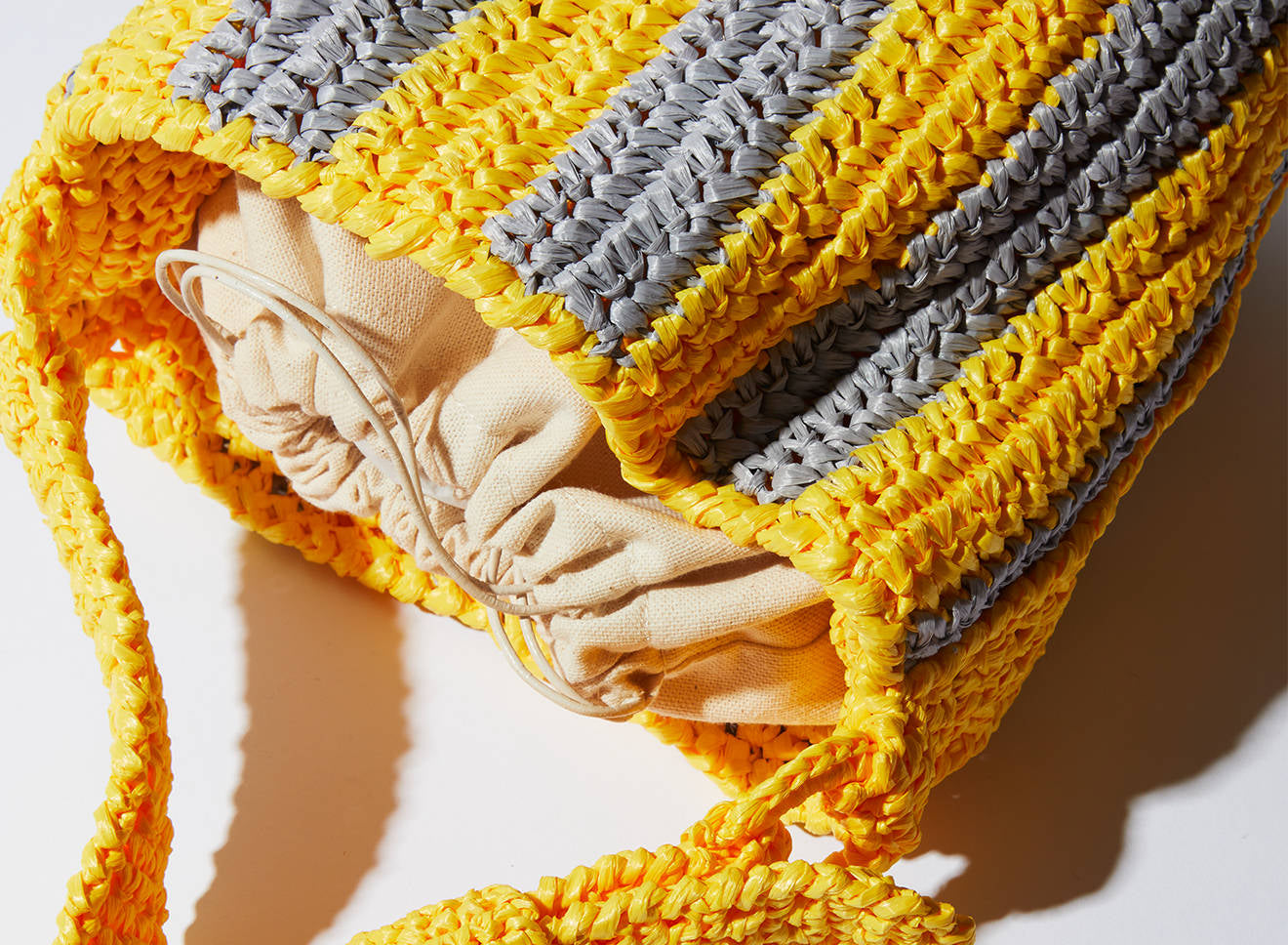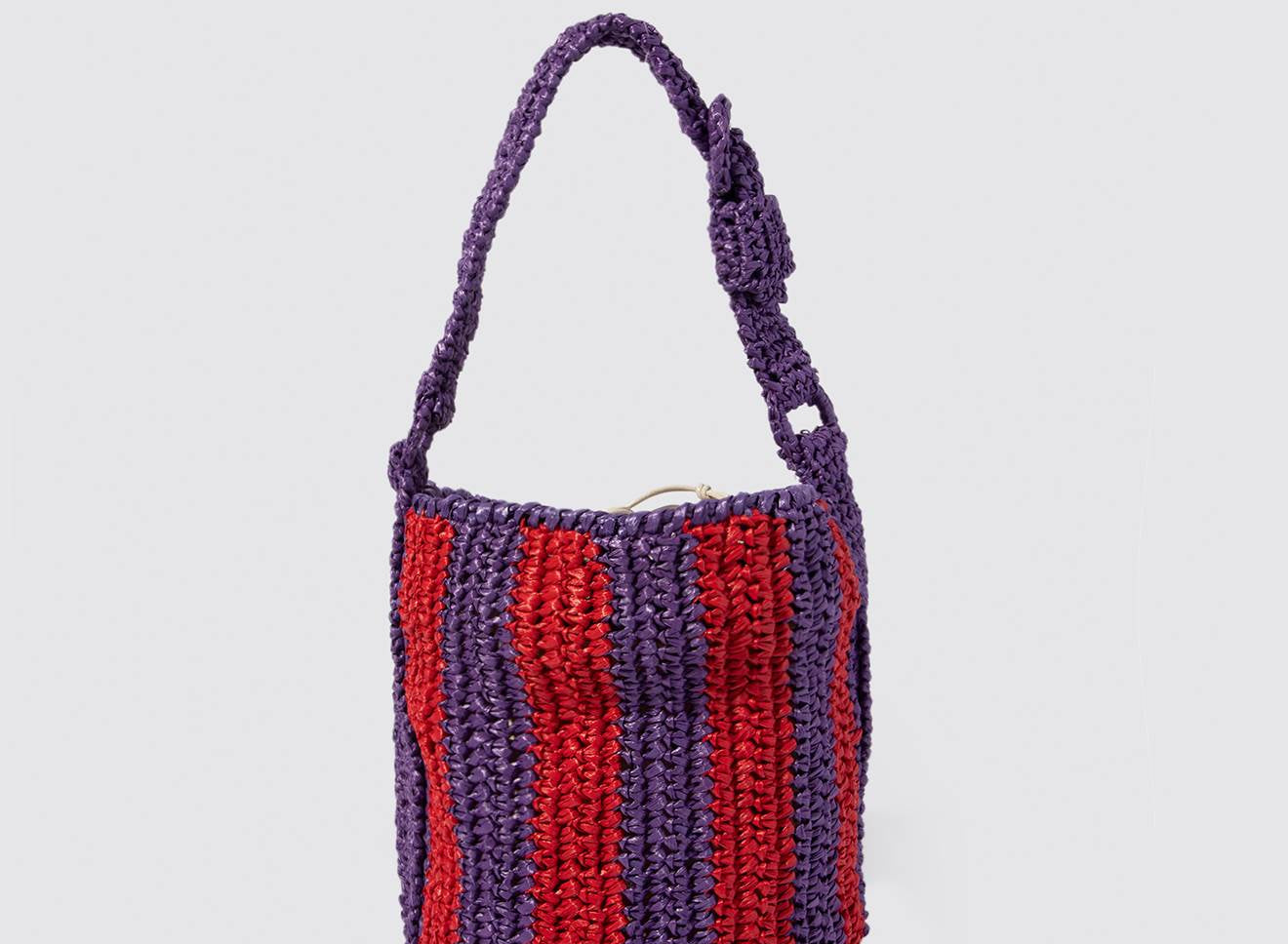 Borsa da donna di piccole dimensioni, in tessuto di rafia, realizzato a mano con tecnica crochet. È la risposta di Maria La Rosa alla tendenza sempreverde delle borse a secchiello. Perfetto per aggiungere un tocco di freschezza e stile al tuo look estivo. La sua forma minimale è arricchita da un motivo a righe in tonalità pastello, ideali per chi cerca praticità senza rinunciare alla moda.Interamente disegnata e prodotta in Italia.