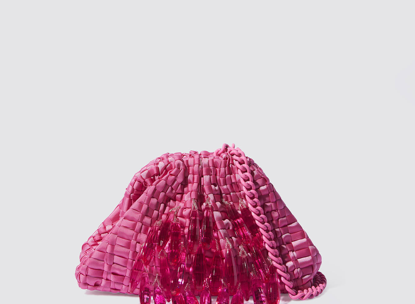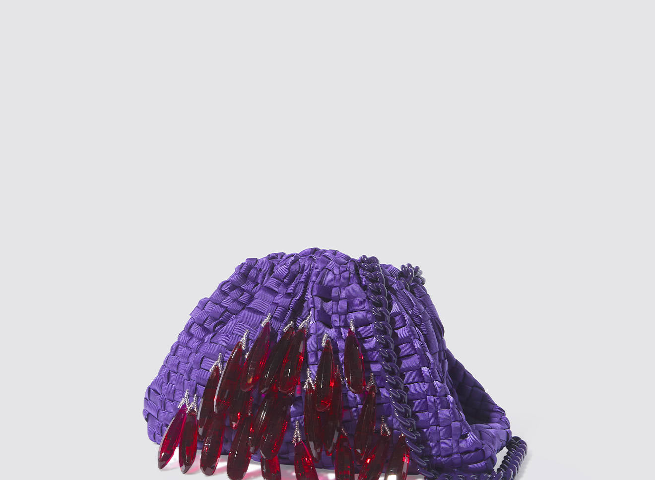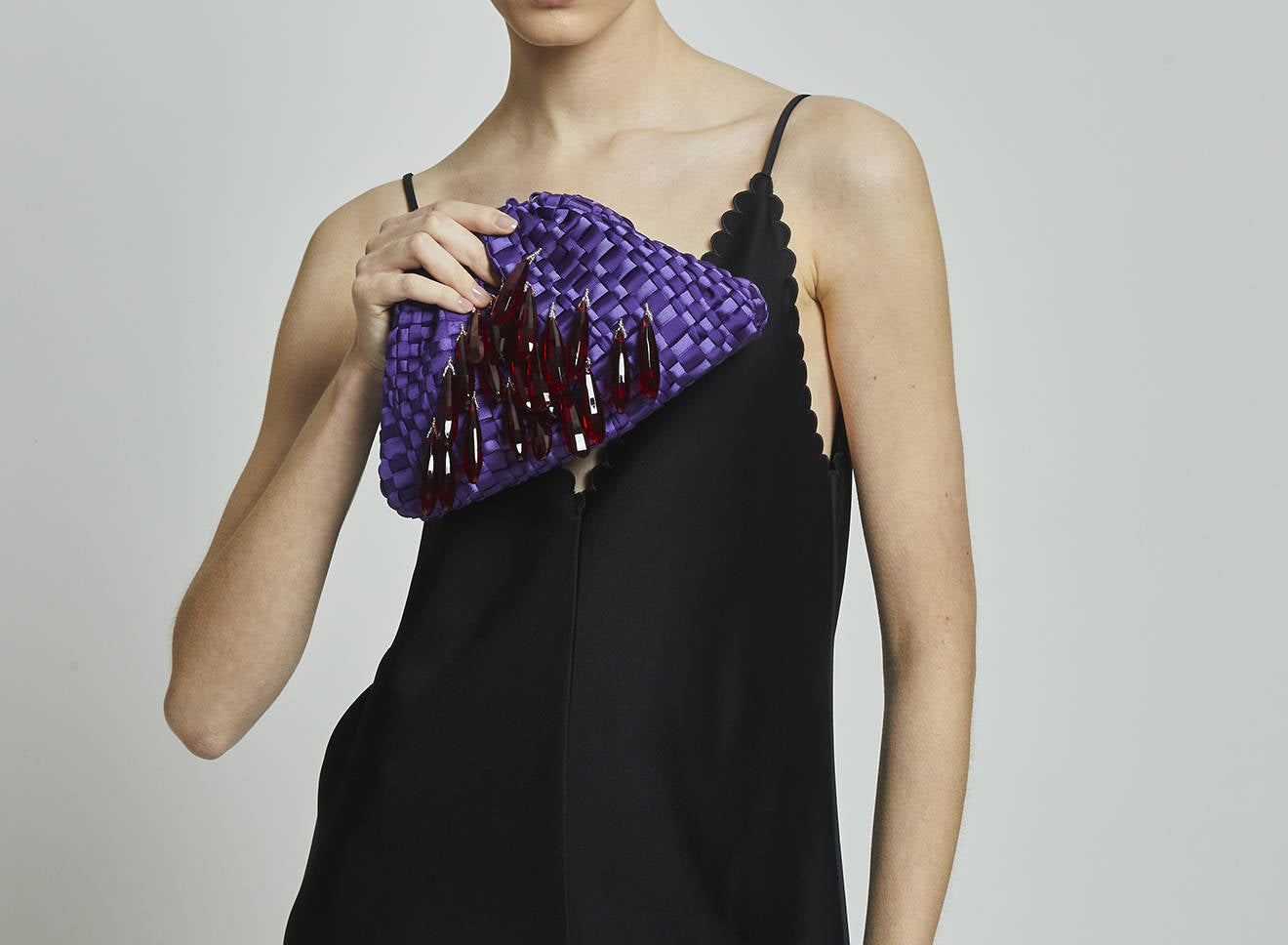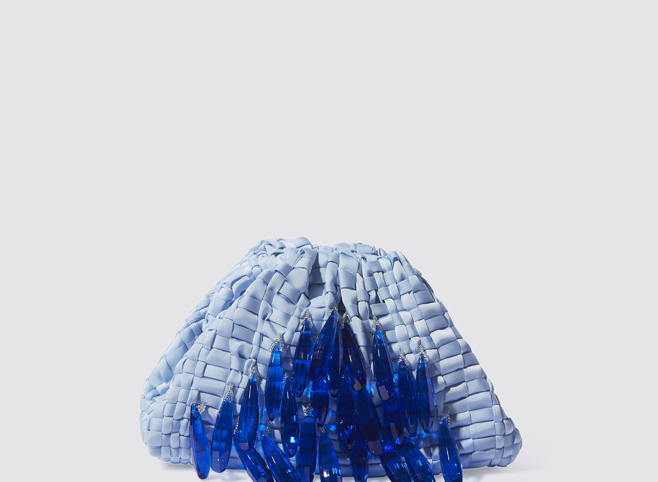 Clutch da donna di piccole dimensioni in tessuto di nastro intrecciato a mano su antichi telai. È arricchita da applicazioni gioiello in pietre allungate e luminose cucite a mano. È capiente quanto basta per portare con sé l'essenziale. Perfetta per tutte le stagioni, costituisce l’emblema di una nuova eleganza metropolitana. È dotata di catena ton sur ton per indossarla anche a tracolla.