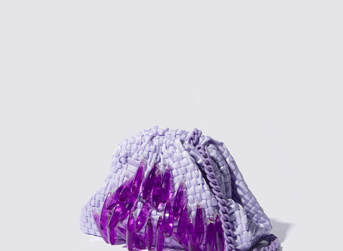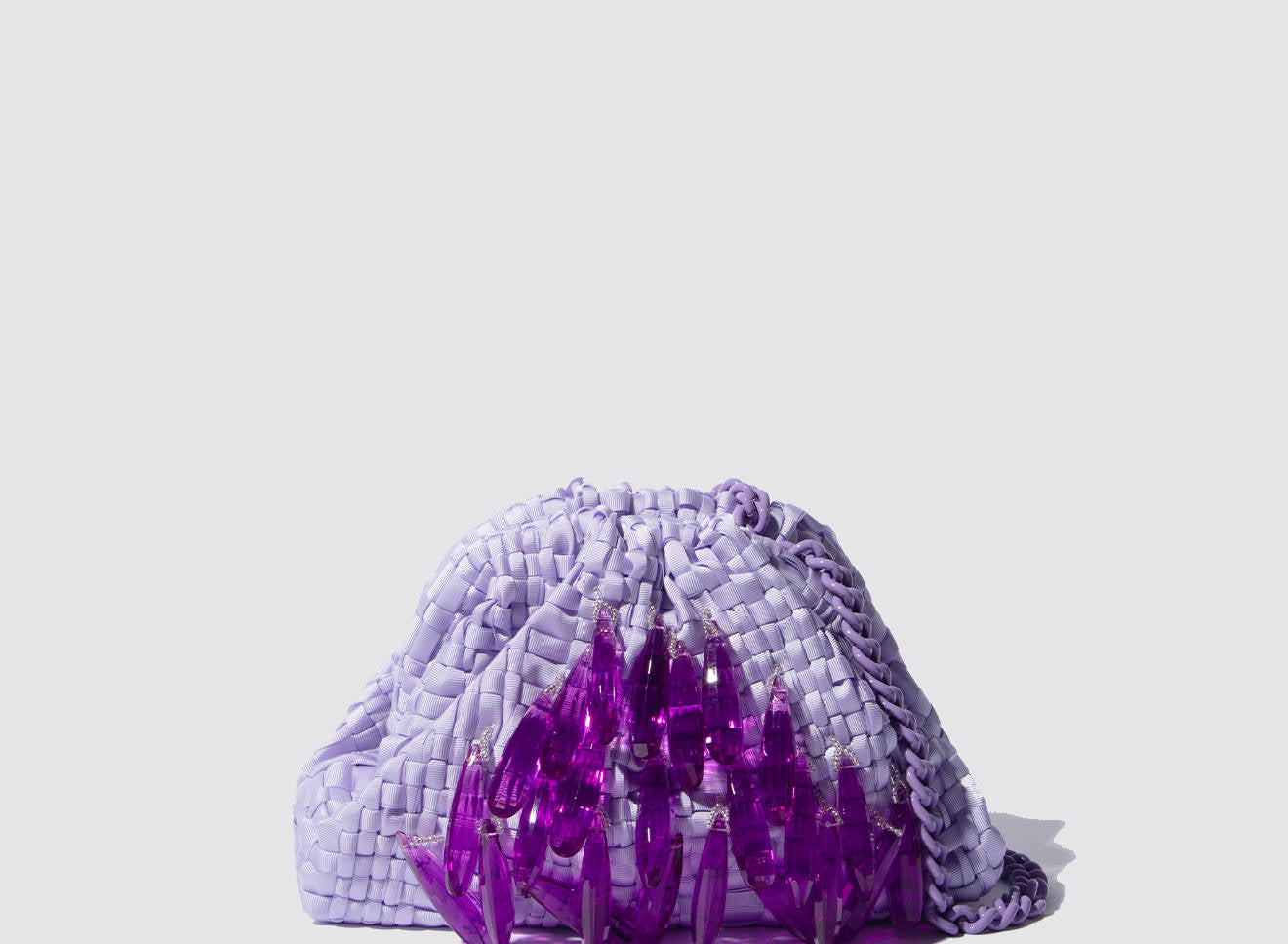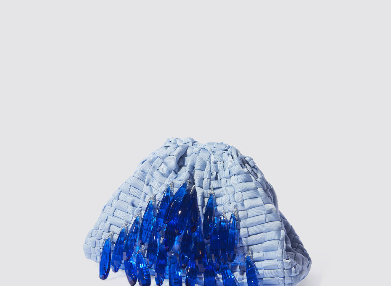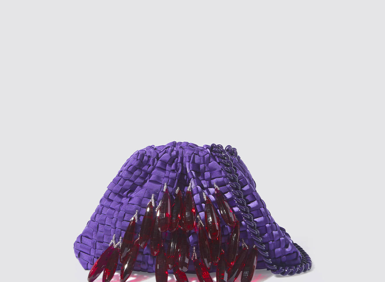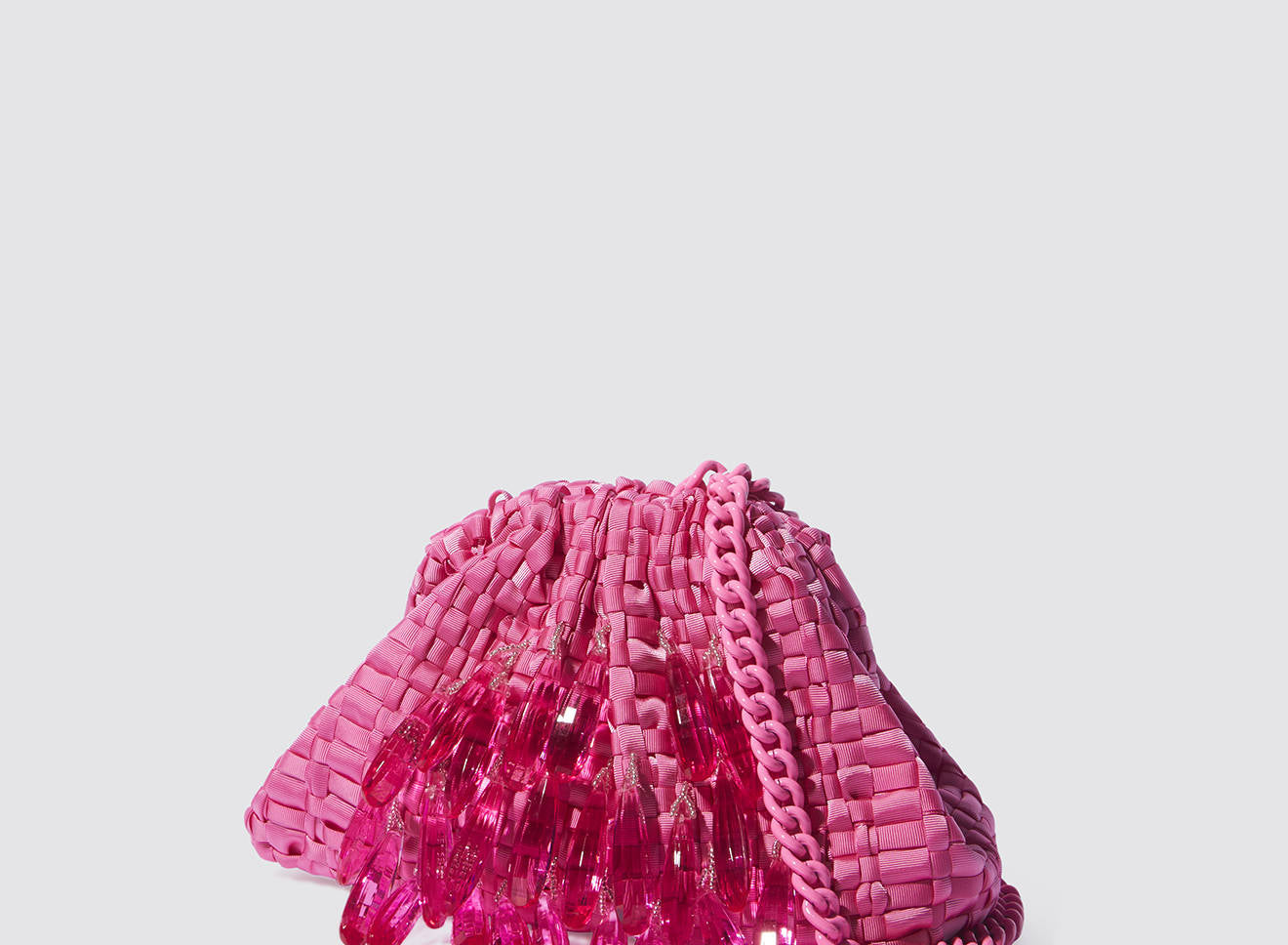 Clutch da donna di piccole dimensioni in tessuto di nastro intrecciato a mano su antichi telai. È arricchita da applicazioni gioiello in pietre allungate e luminose cucite a mano. È capiente quanto basta per portare con sé l'essenziale. Perfetta per tutte le stagioni, costituisce l’emblema di una nuova eleganza metropolitana. È dotata di catena ton sur ton per indossarla anche a tracolla.