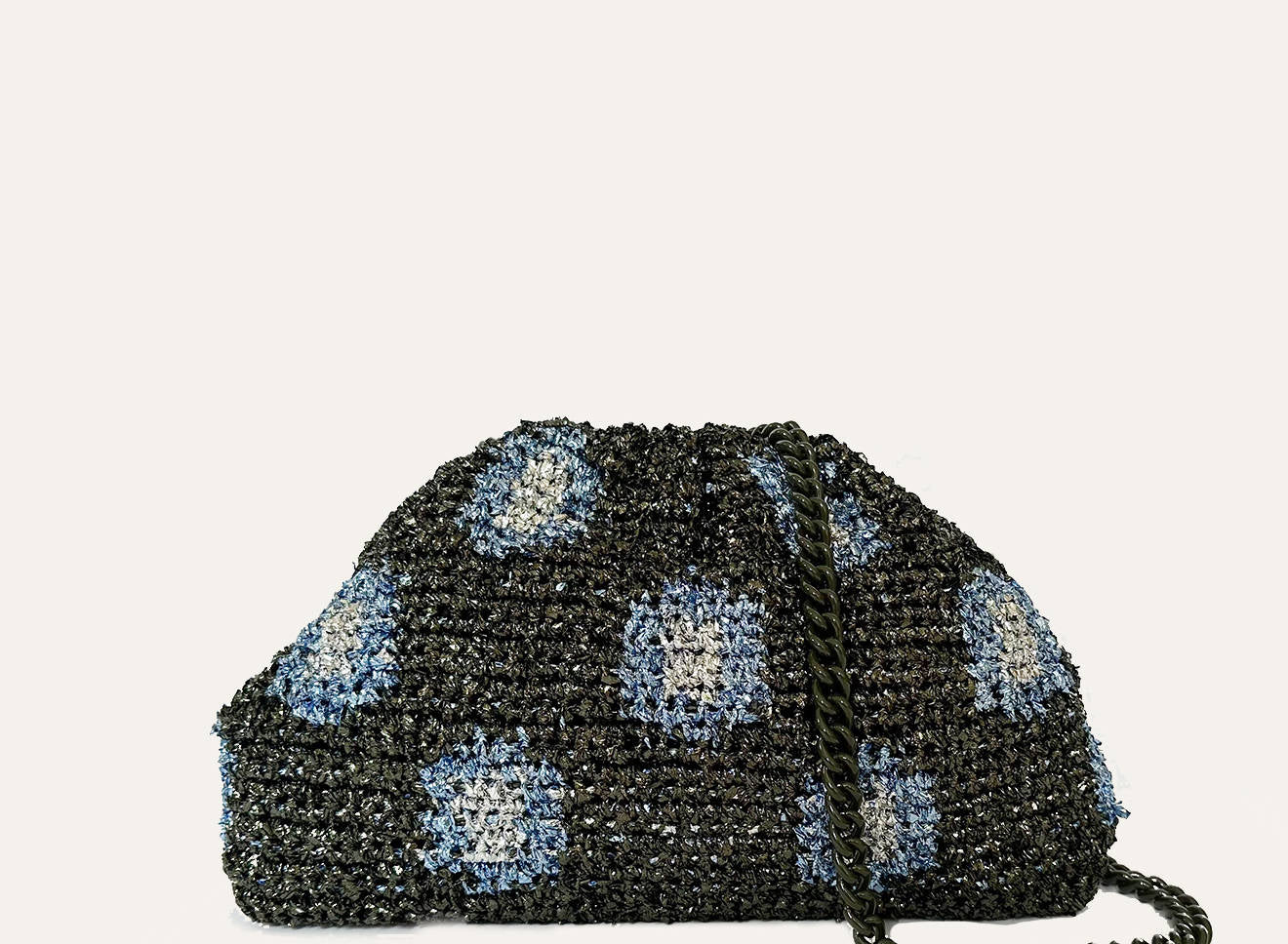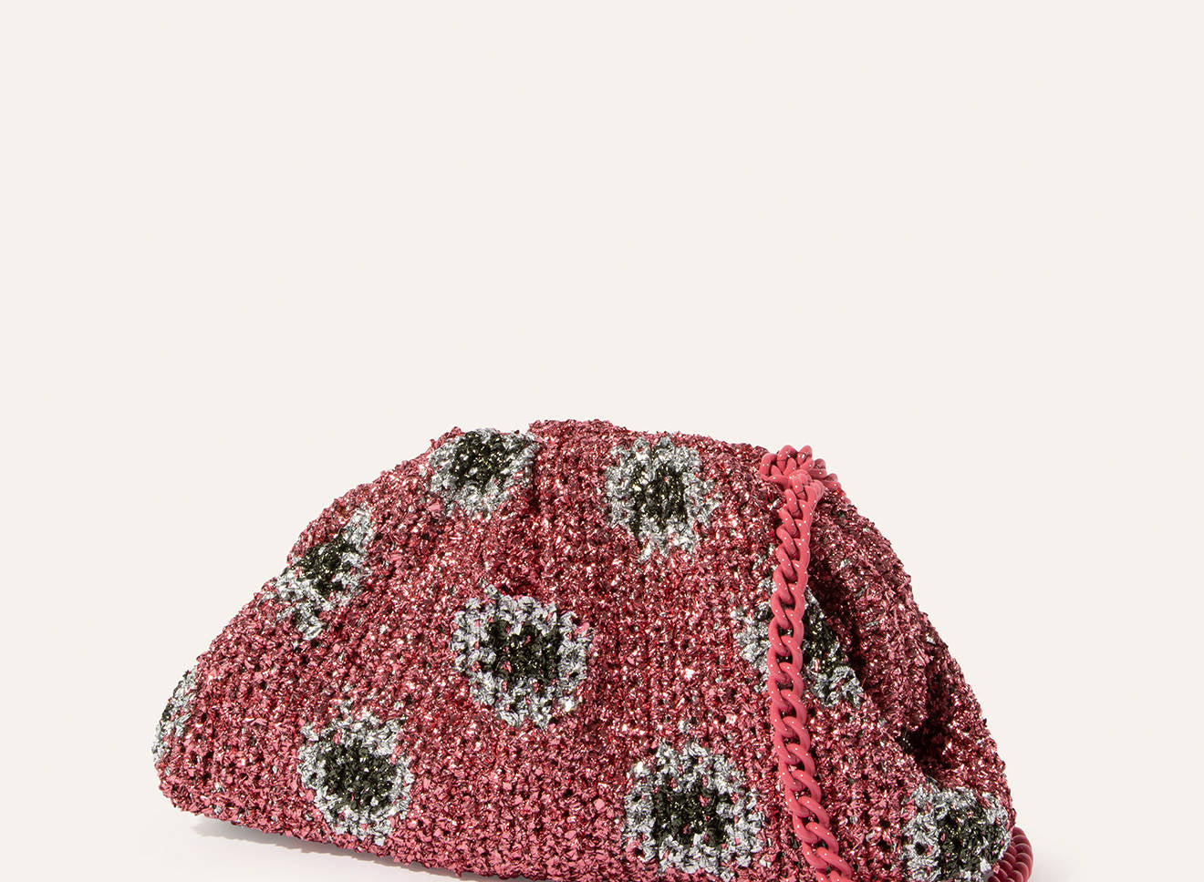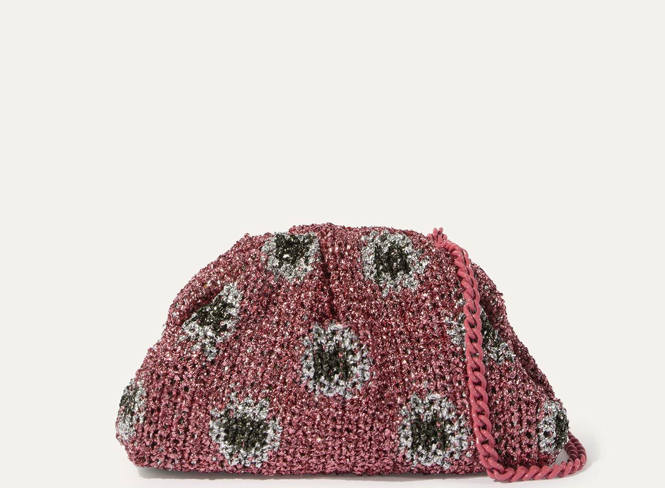 Clutch da donna di medie dimensioni, realizzata interamente a mano con la tecnica crochet. Questo modello costituisce una versione scintillante dell’icon bag Maria La Rosa, perfetta per occasioni speciali, emblema di una nuova eleganza metropolitana, che assicura capienza e funzionalità.