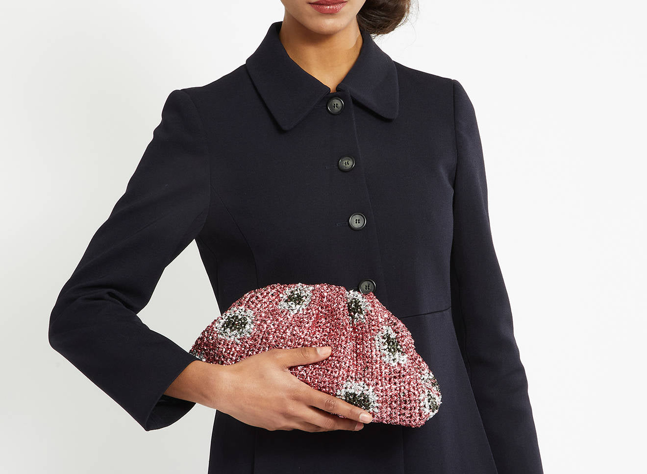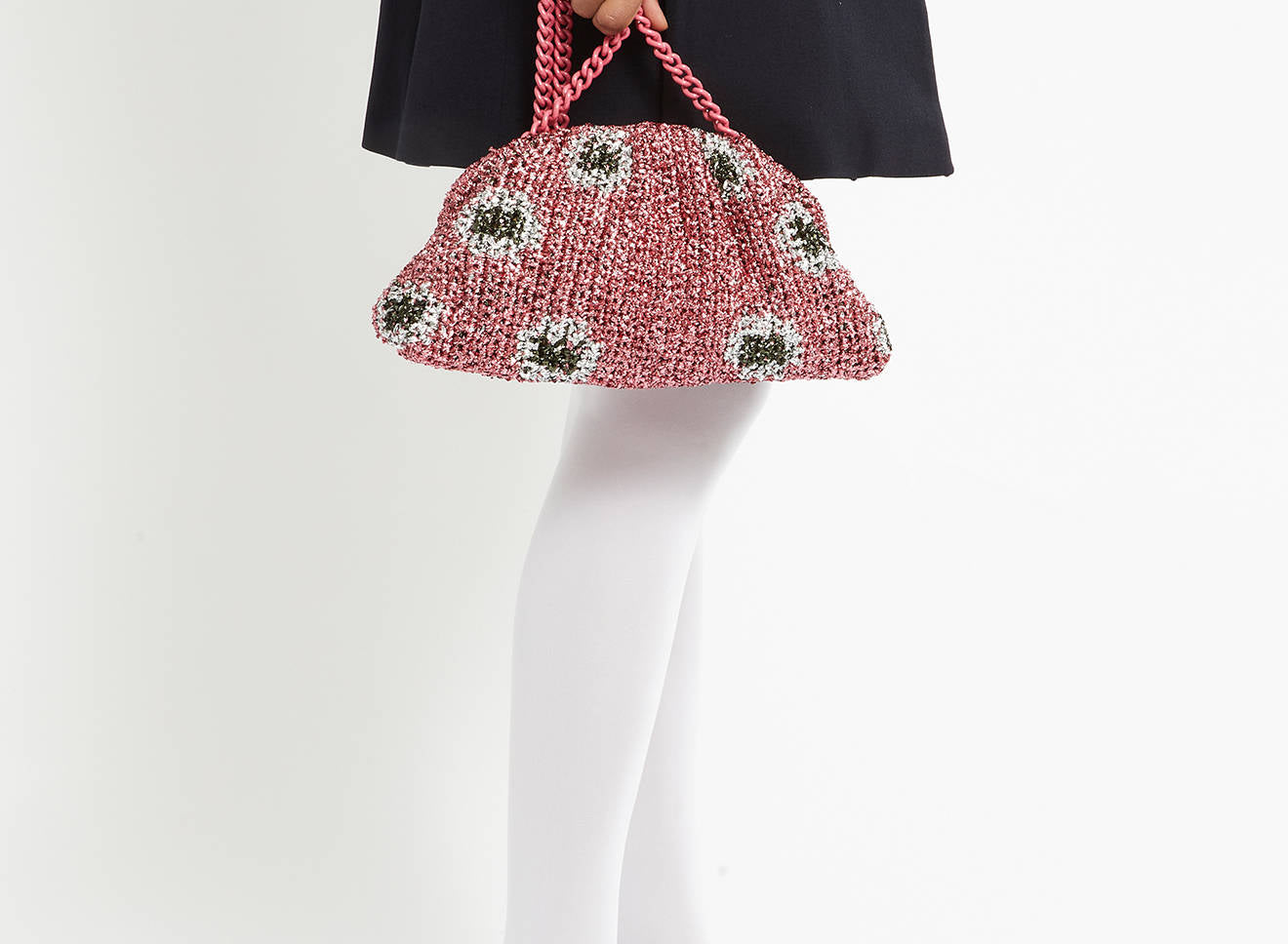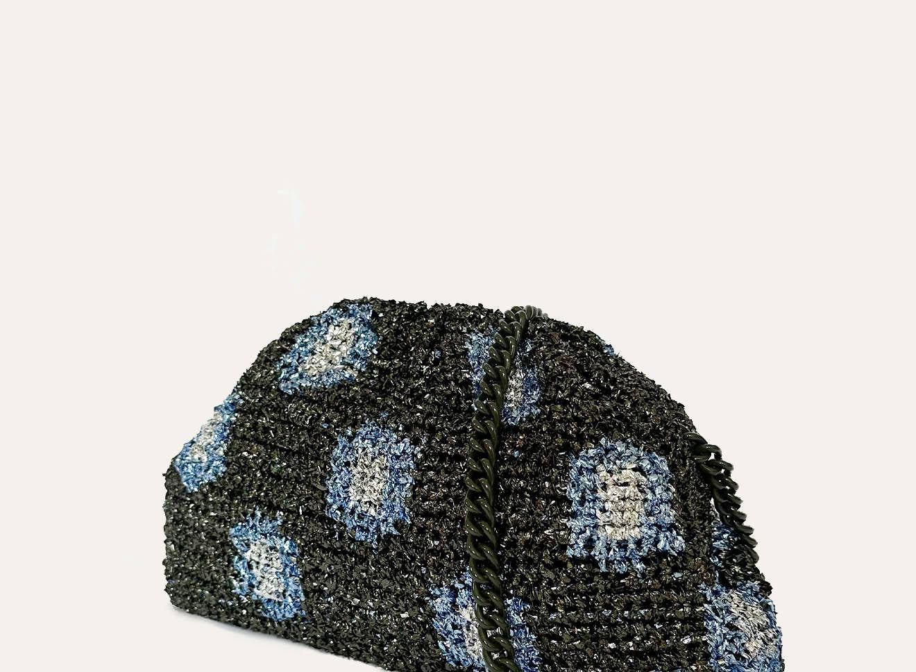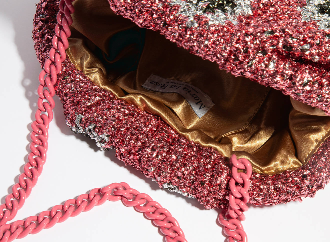 Clutch da donna di medie dimensioni, realizzata interamente a mano con la tecnica crochet. Questo modello costituisce una versione scintillante dell’icon bag Maria La Rosa, perfetta per occasioni speciali, emblema di una nuova eleganza metropolitana, che assicura capienza e funzionalità.