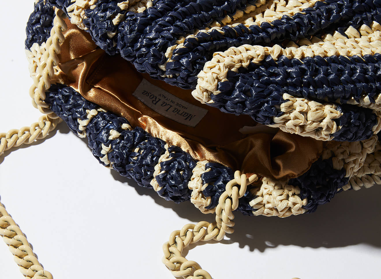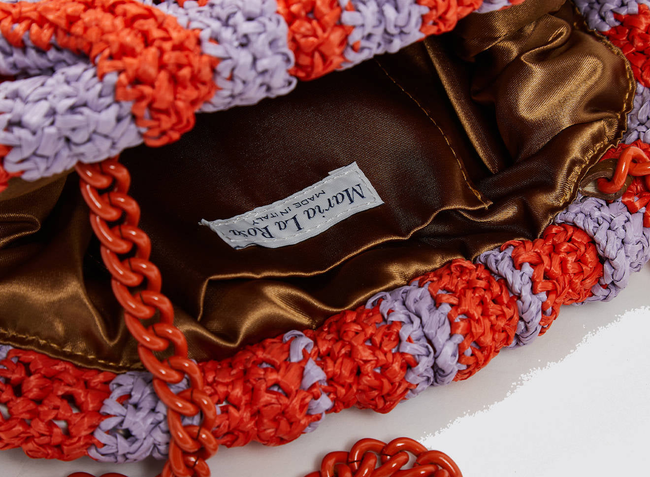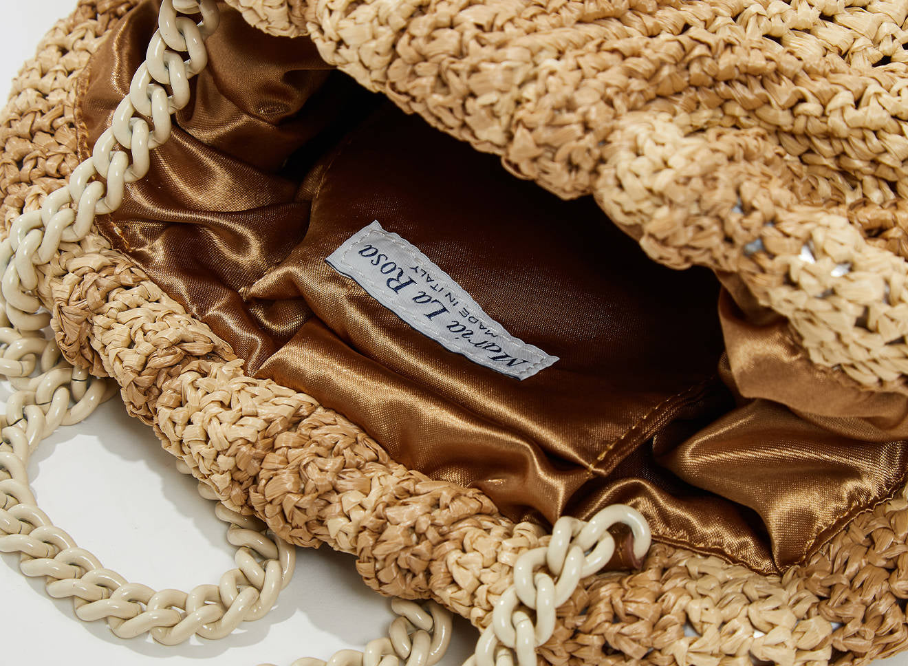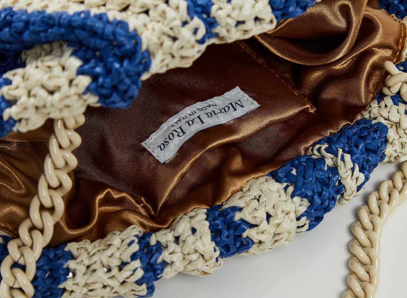 Clutch da donna di medie dimensioni in rafia, realizzata interamente a mano con la tecnica crochet. Questo modello costituisce l’icon bag Maria La Rosa, perfetta per tutte le occasioni, emblema di una nuova eleganza metropolitana, che assicura capienza e funzionalità.