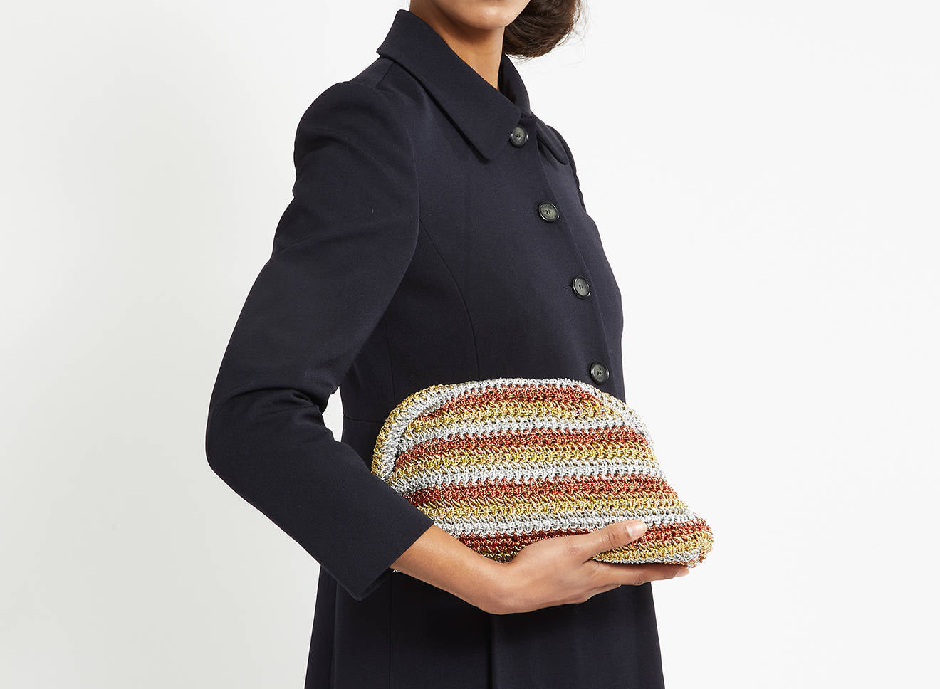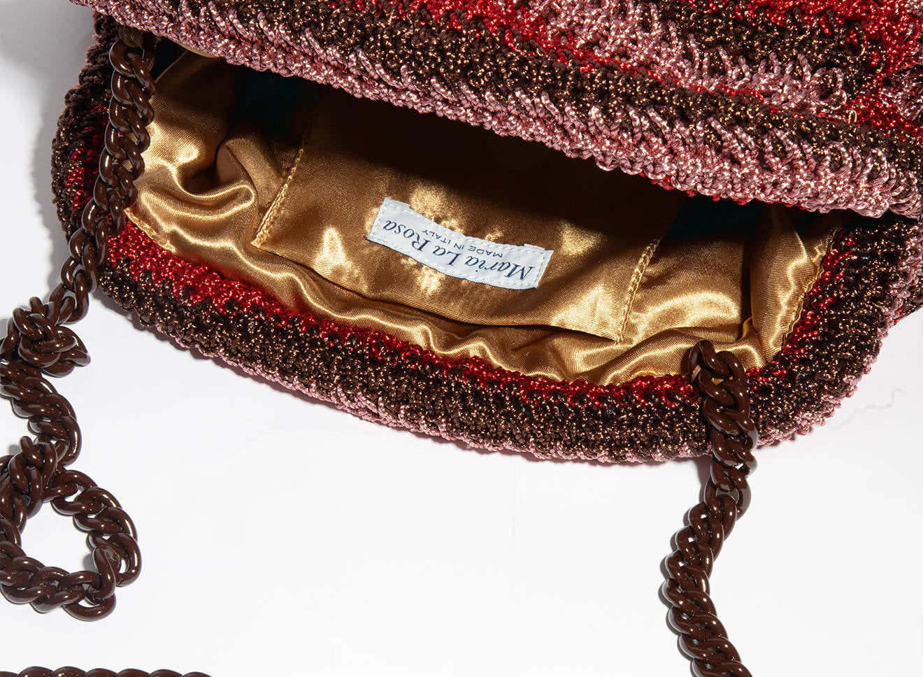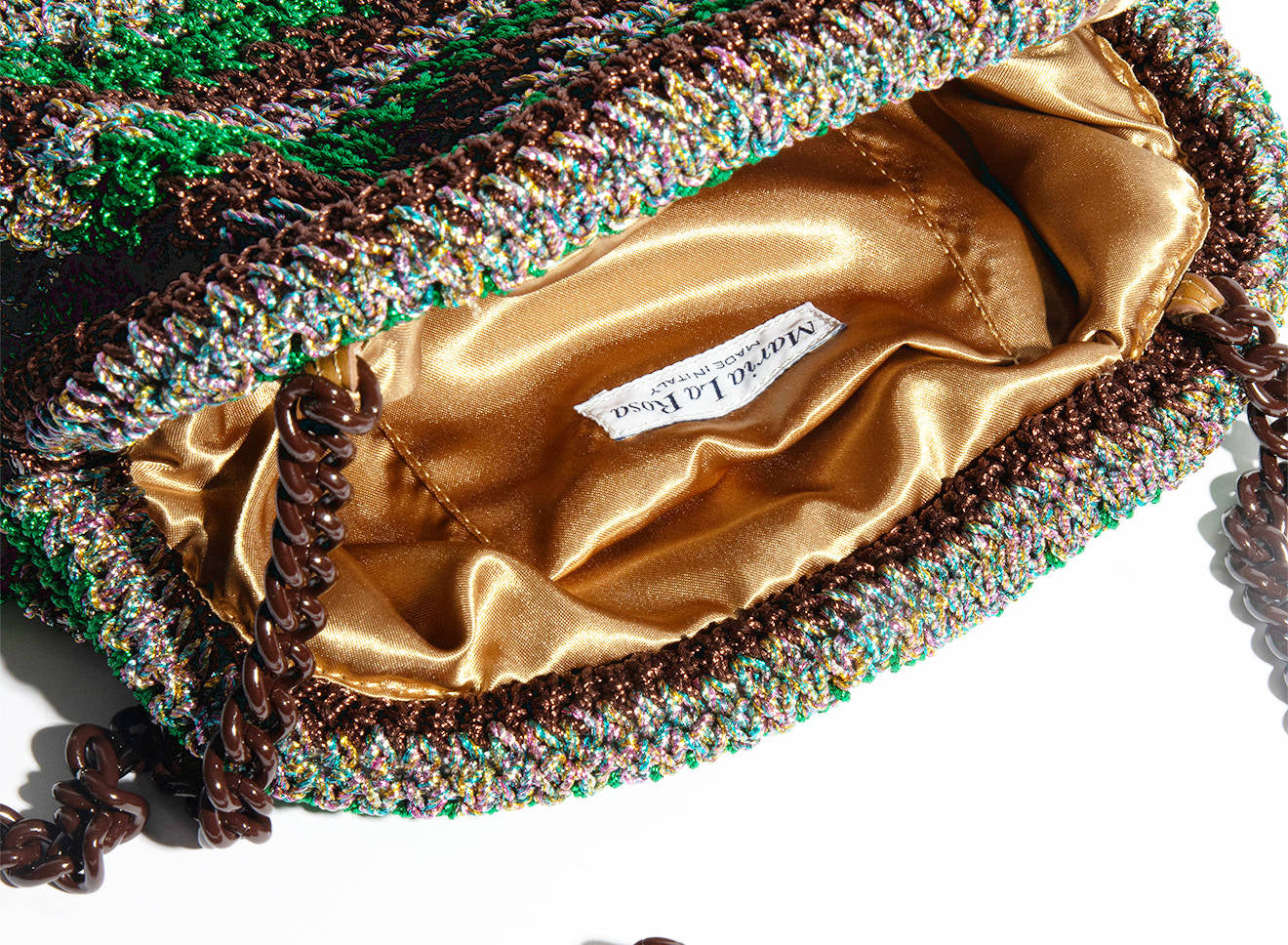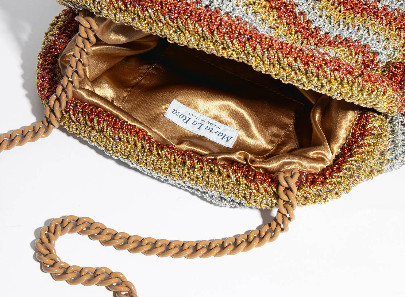 Clutch da donna di medie dimensioni in filato metallico, realizzata interamente a mano con la tecnica crochet. Questo modello costituisce l’icon bag Maria La Rosa, perfetta per tutte le stagioni, emblema di una nuova eleganza metropolitana, che assicura capienza e funzionalità. È dotata di catena ton sur ton per indossarla anche a tracolla e tre sono le varianti tra cui poter scegliere.