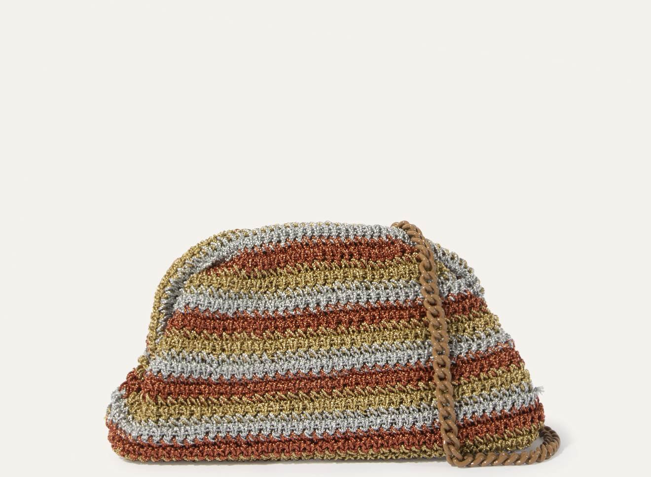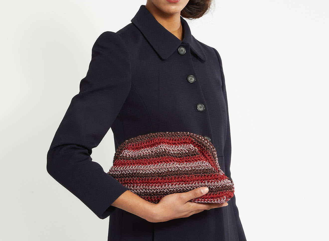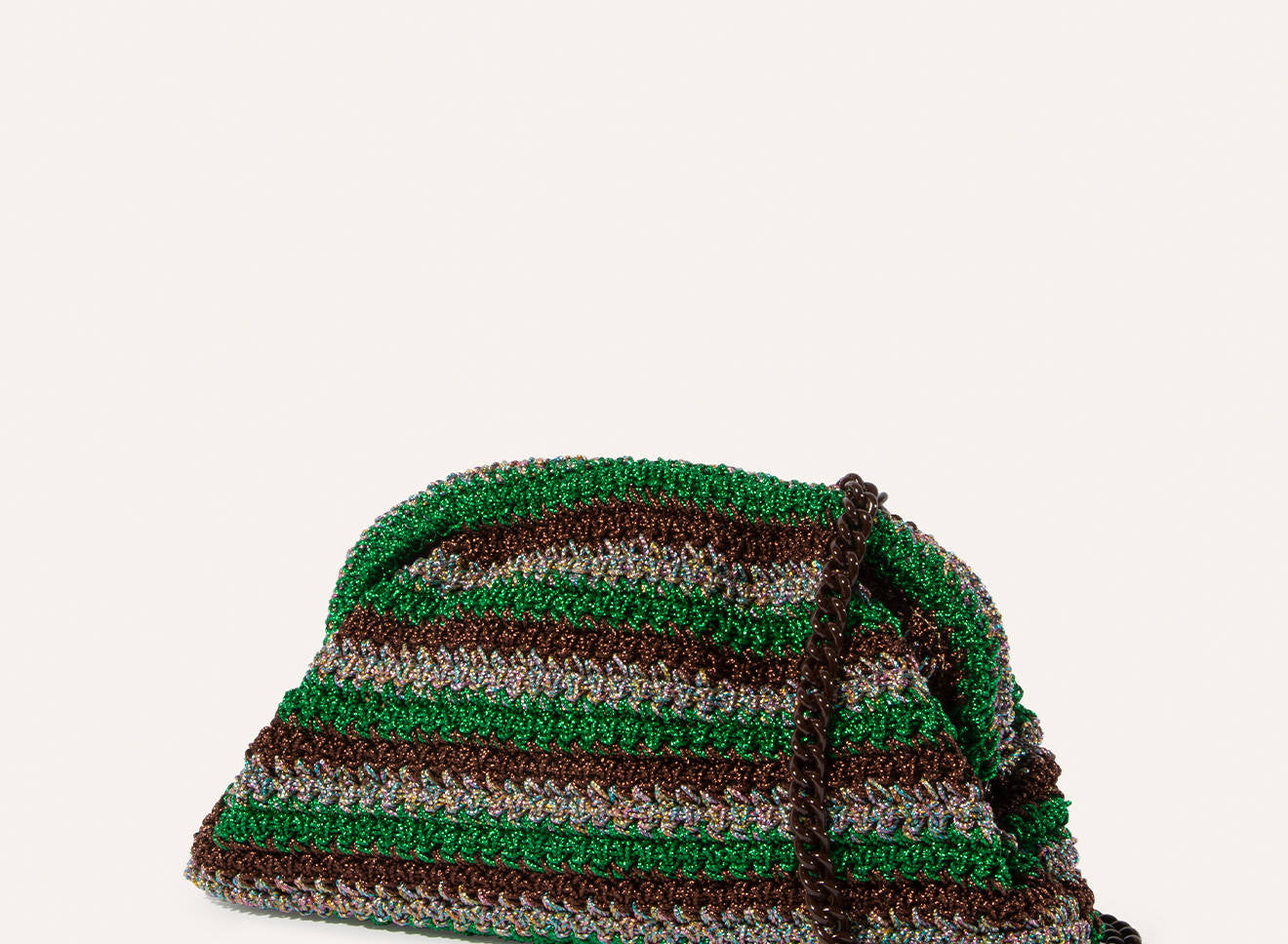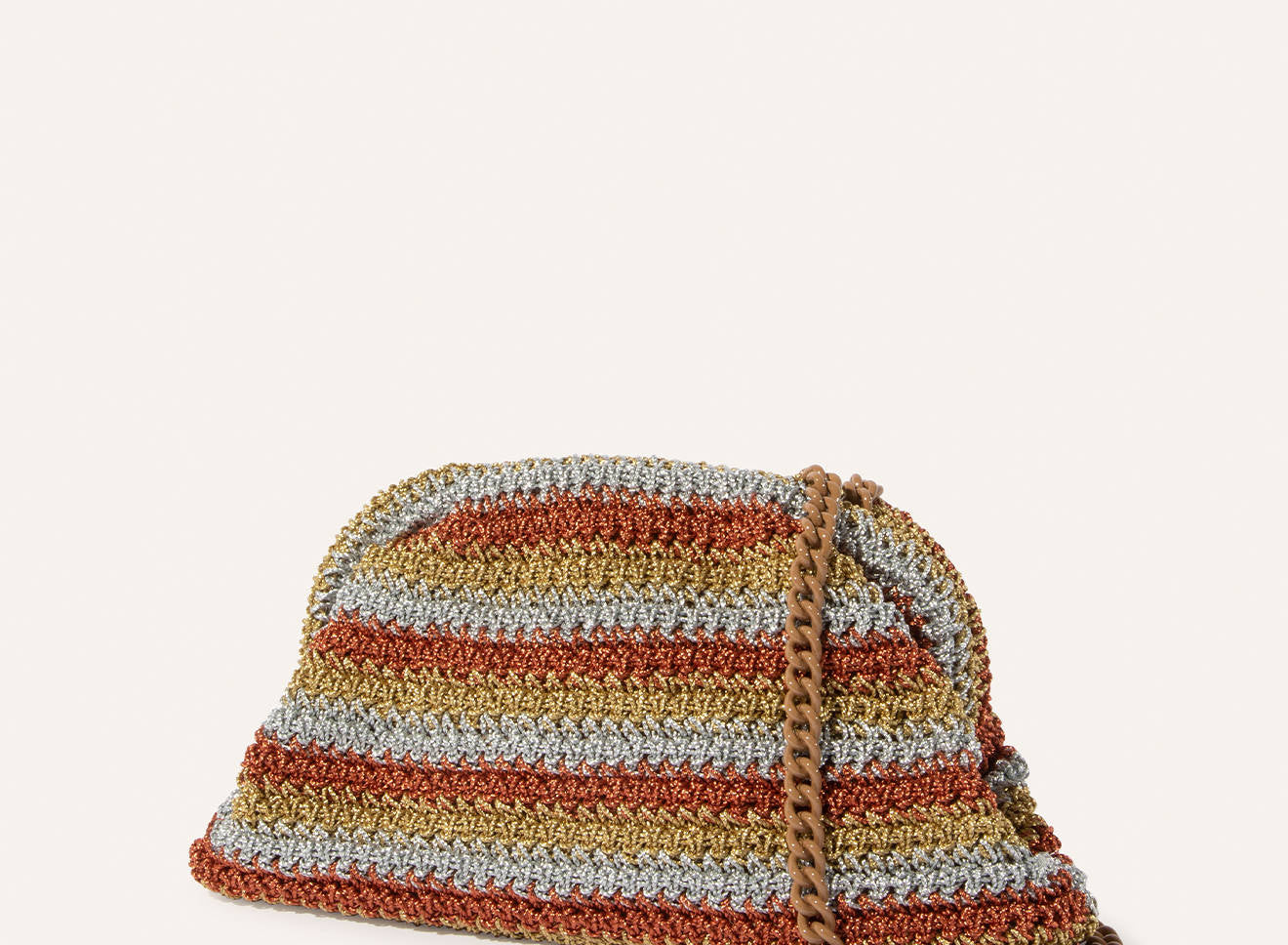 Clutch da donna di medie dimensioni in filato metallico, realizzata interamente a mano con la tecnica crochet. Questo modello costituisce l’icon bag Maria La Rosa, perfetta per tutte le stagioni, emblema di una nuova eleganza metropolitana, che assicura capienza e funzionalità. È dotata di catena ton sur ton per indossarla anche a tracolla e tre sono le varianti tra cui poter scegliere.