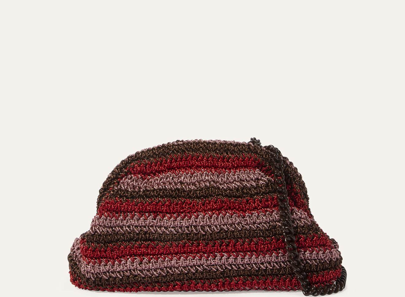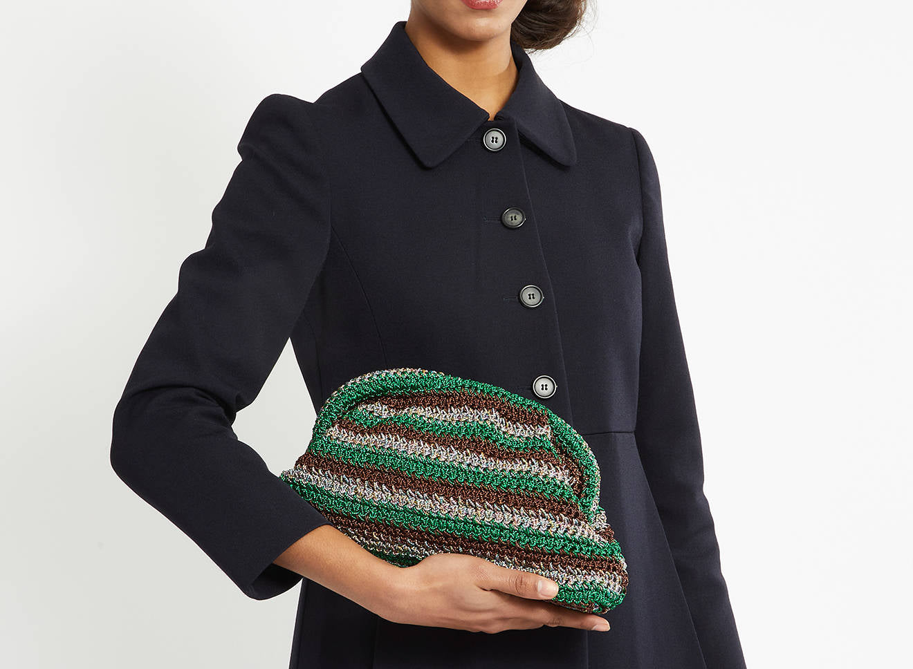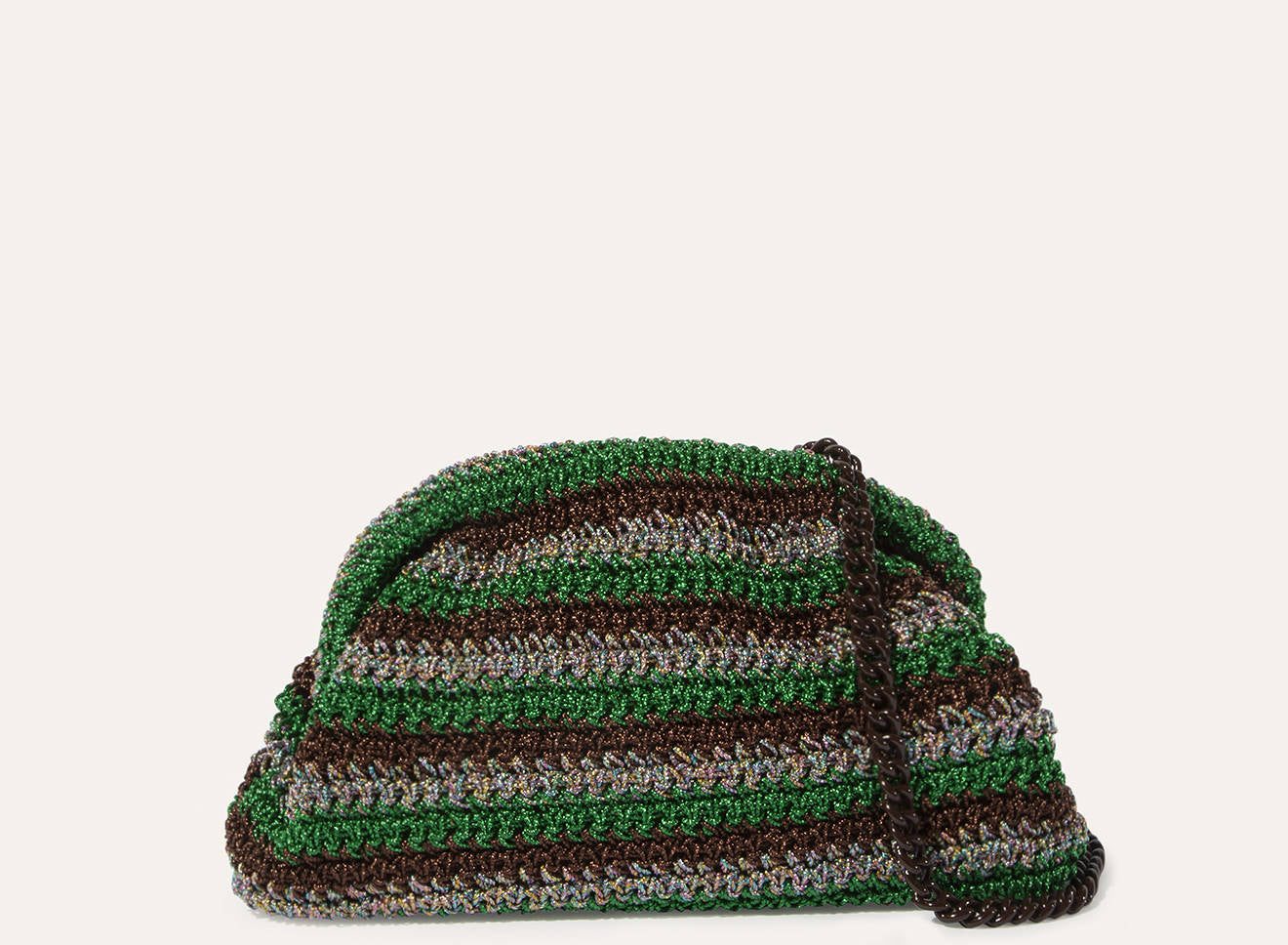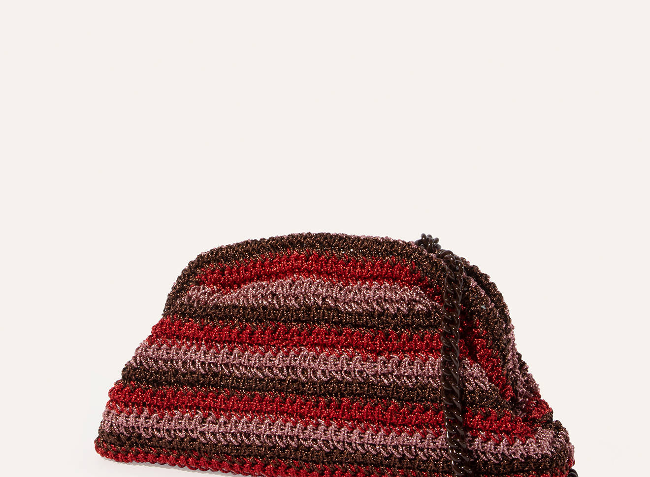 Clutch da donna di medie dimensioni in filato metallico, realizzata interamente a mano con la tecnica crochet. Questo modello costituisce l’icon bag Maria La Rosa, perfetta per tutte le stagioni, emblema di una nuova eleganza metropolitana, che assicura capienza e funzionalità. È dotata di catena ton sur ton per indossarla anche a tracolla e tre sono le varianti tra cui poter scegliere.