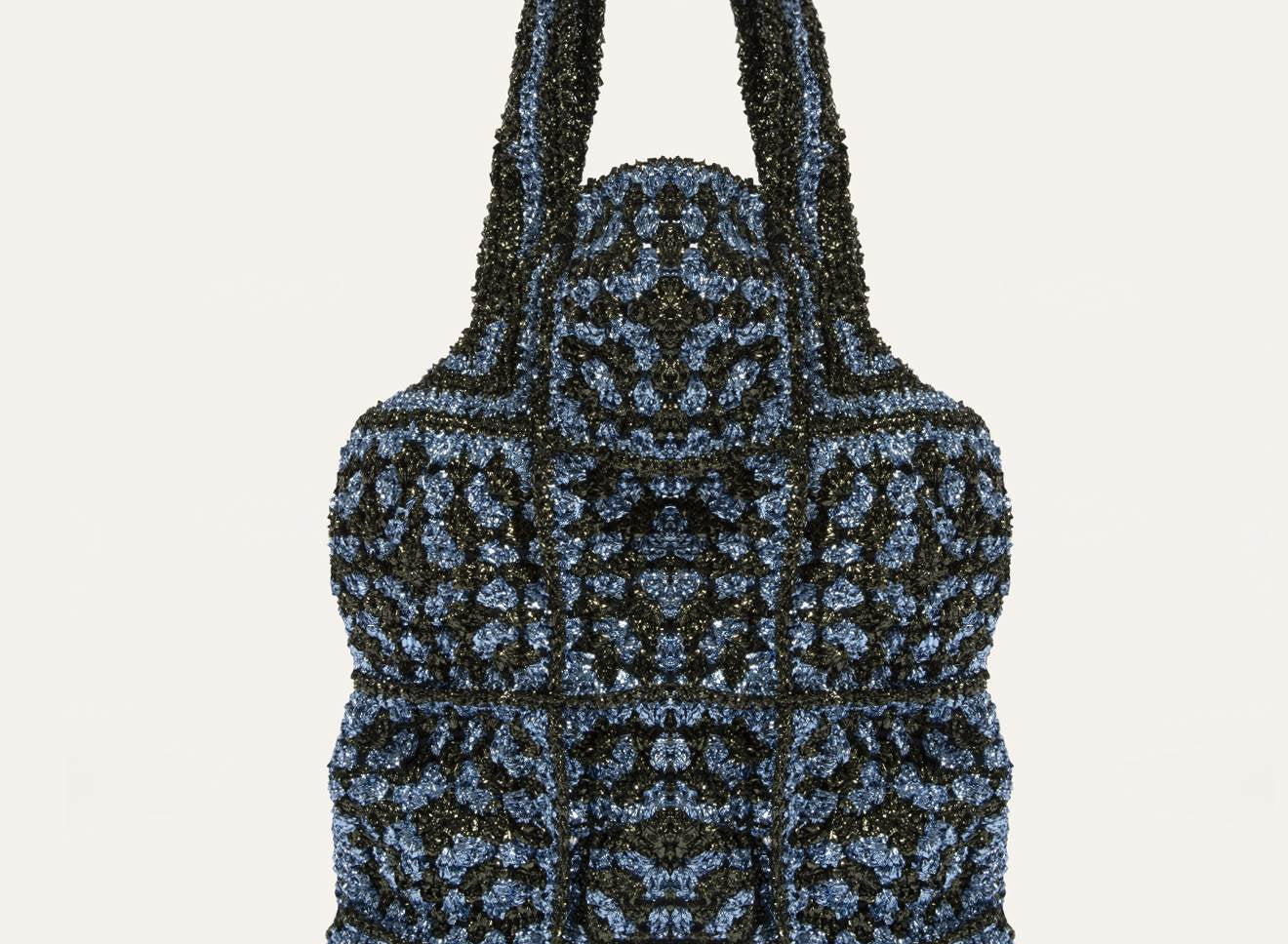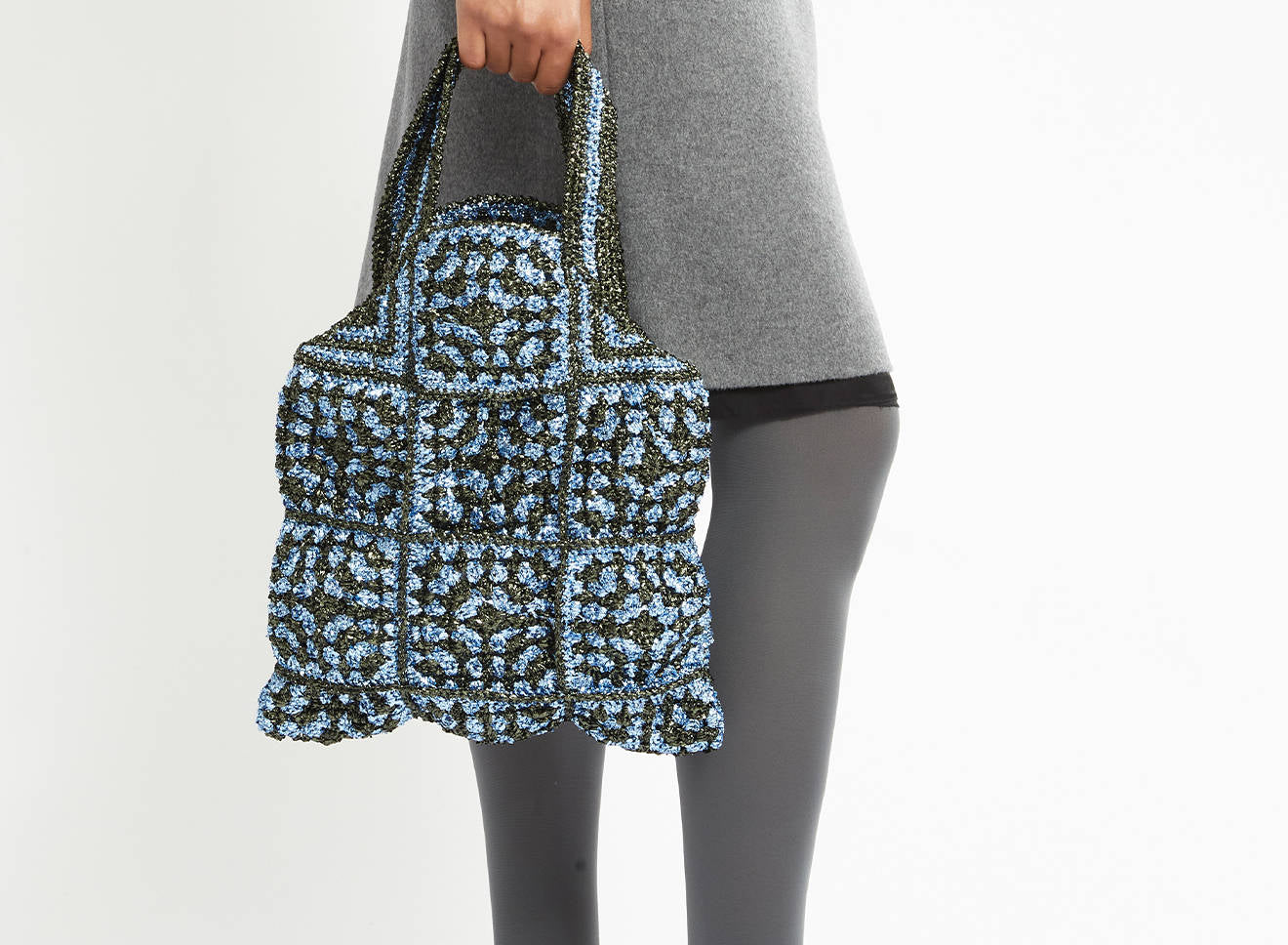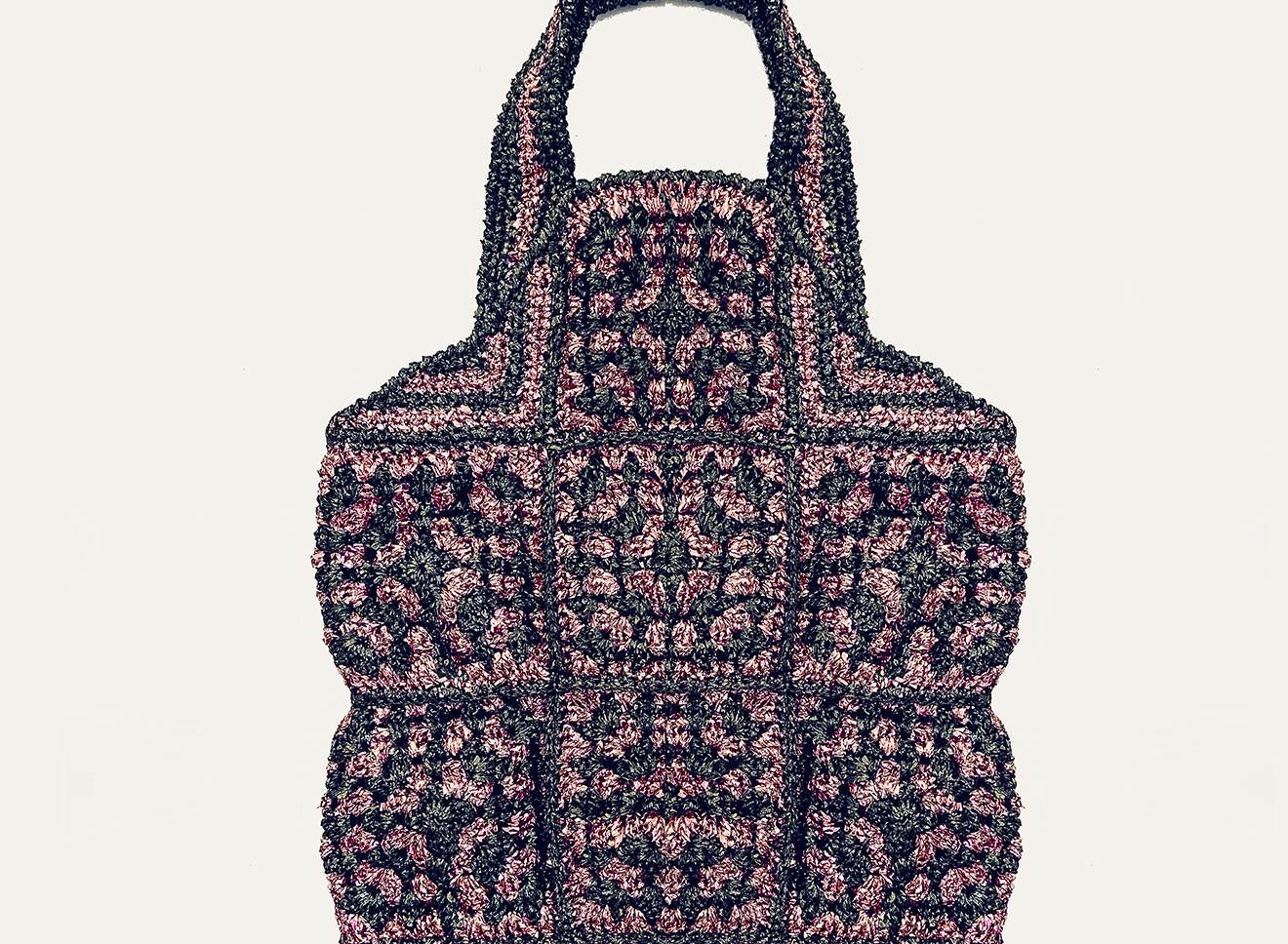 Borsa da donna a spalla in rafia di dimensioni medie, realizzata interamente a mano con la tecnica crochet.