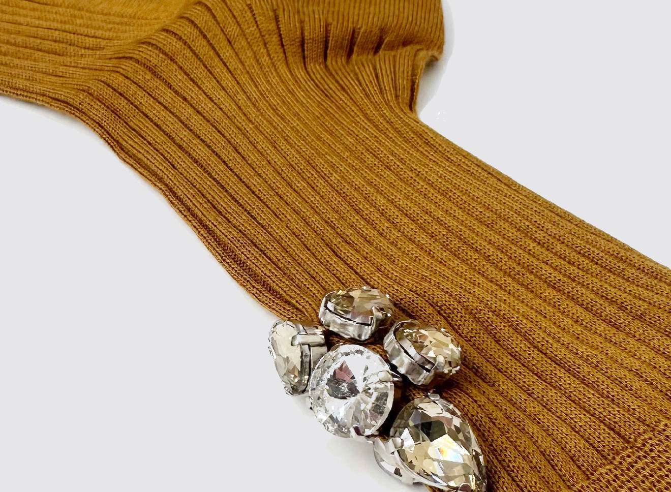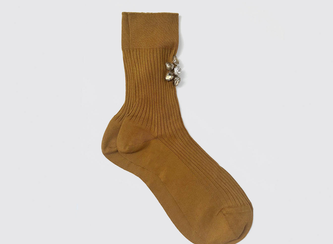 Calze in cotone organico con ricamo gioiello. Realizzate in morbido cotone organico, queste calze uniscono comfort naturale ed eleganza discreta. Il dettaglio gioiello applicato a mano con cristalli in tinta le trasforma in un accessorio raffinato e originale, perfetto per aggiungere carattere anche al look più semplice.