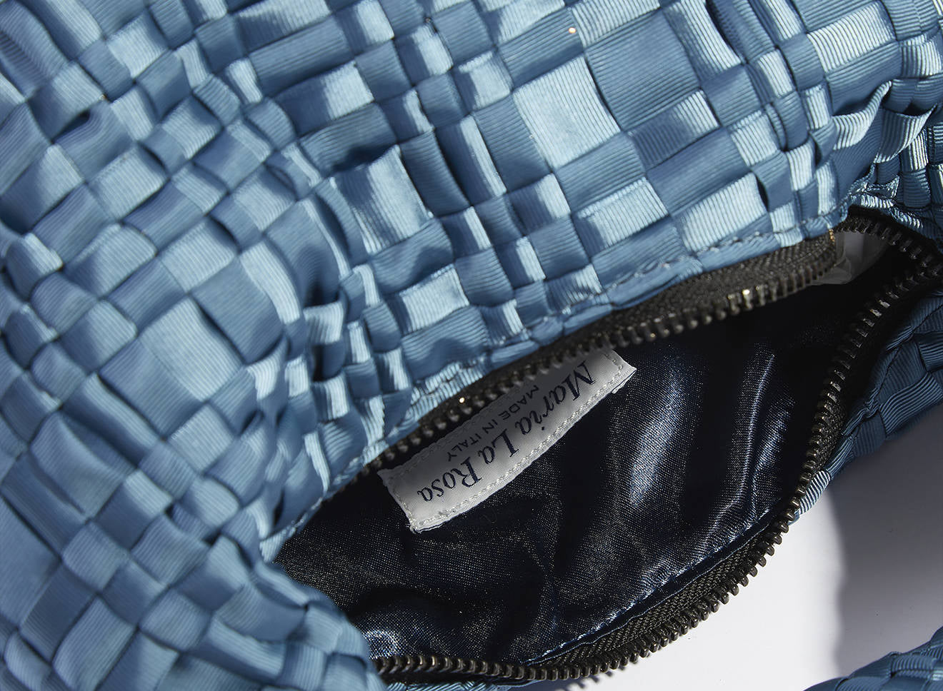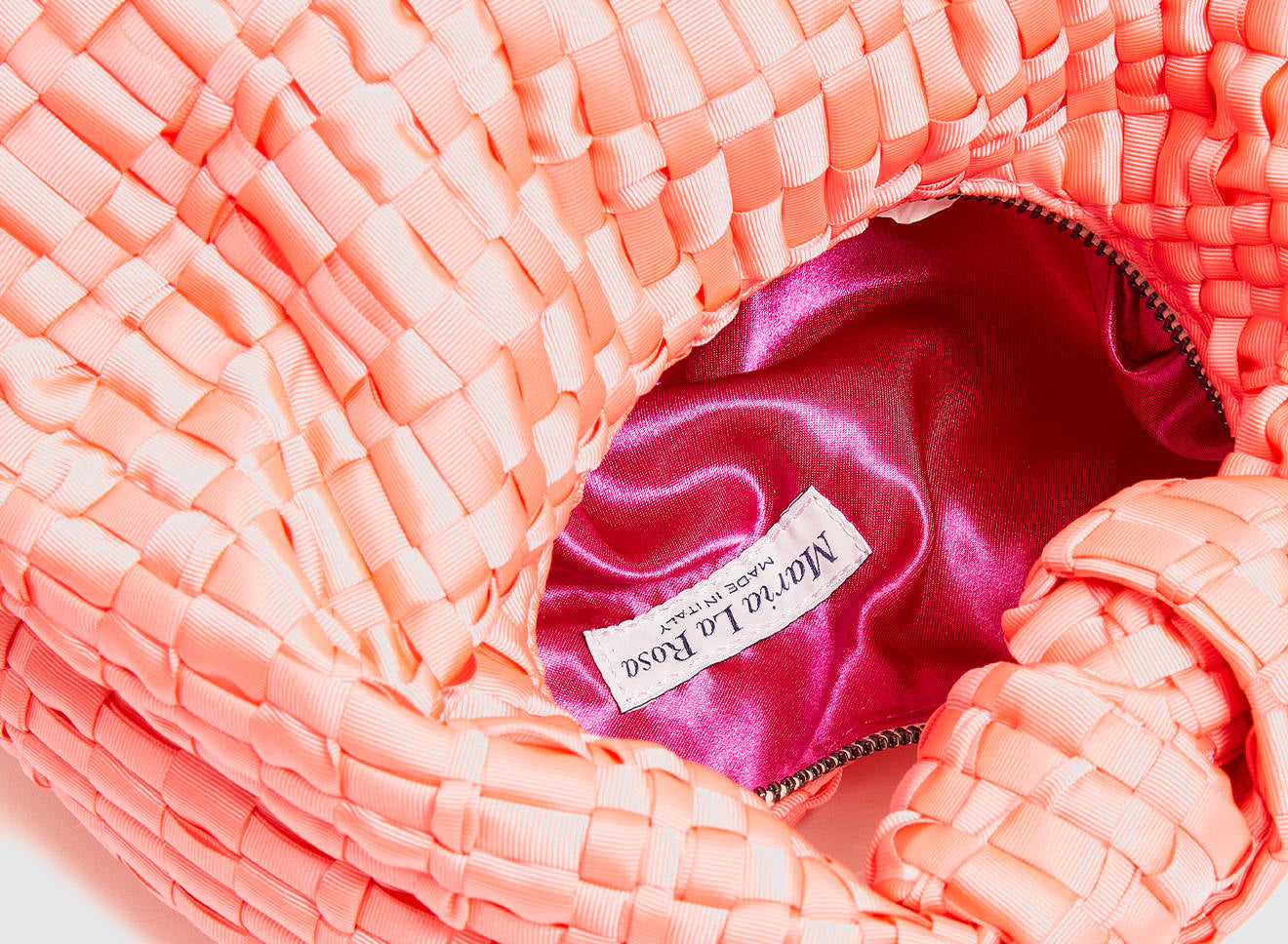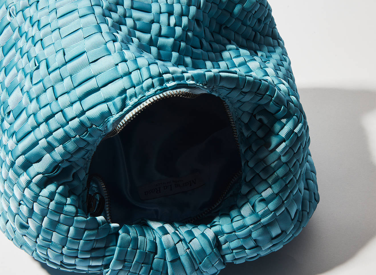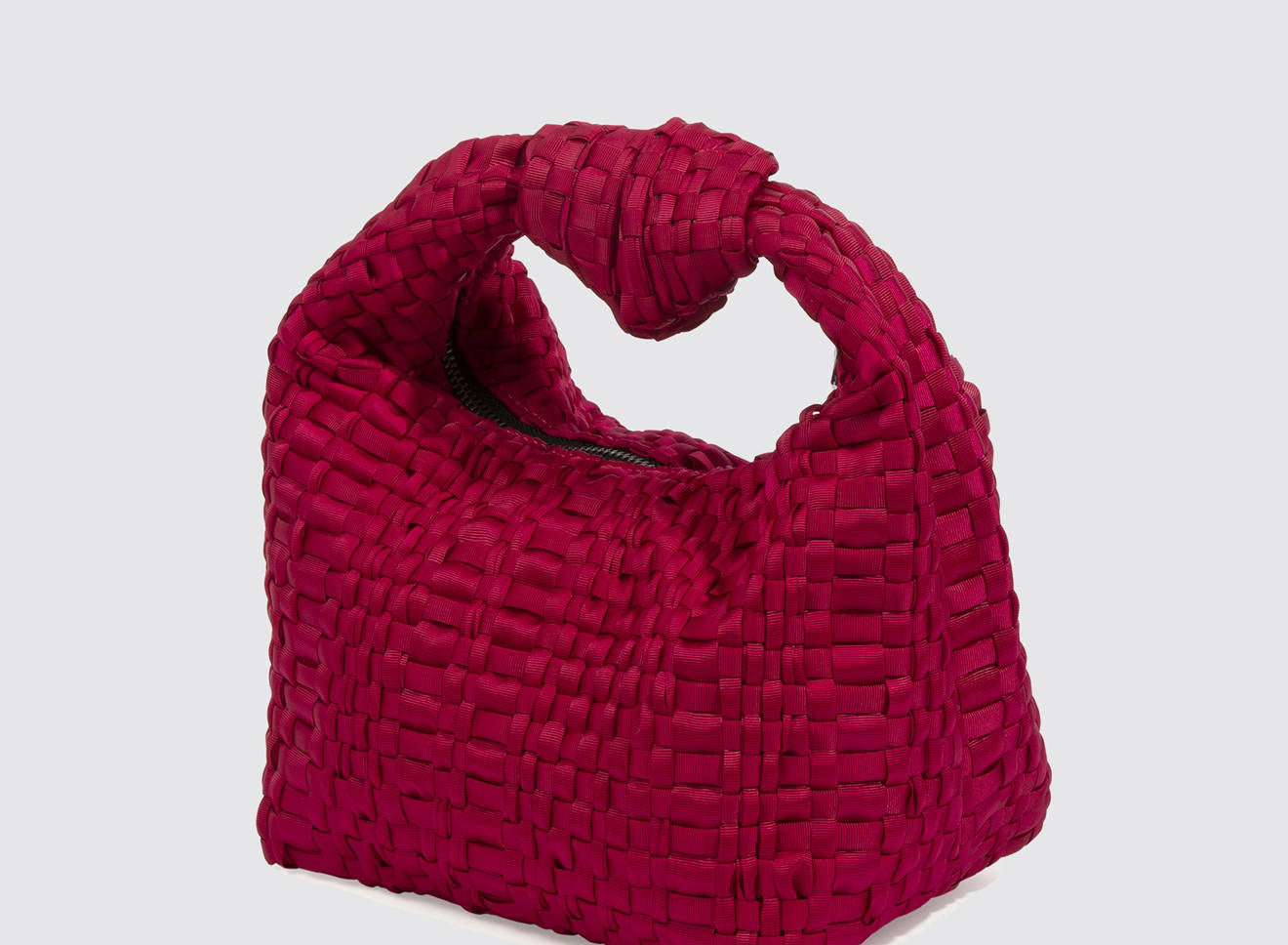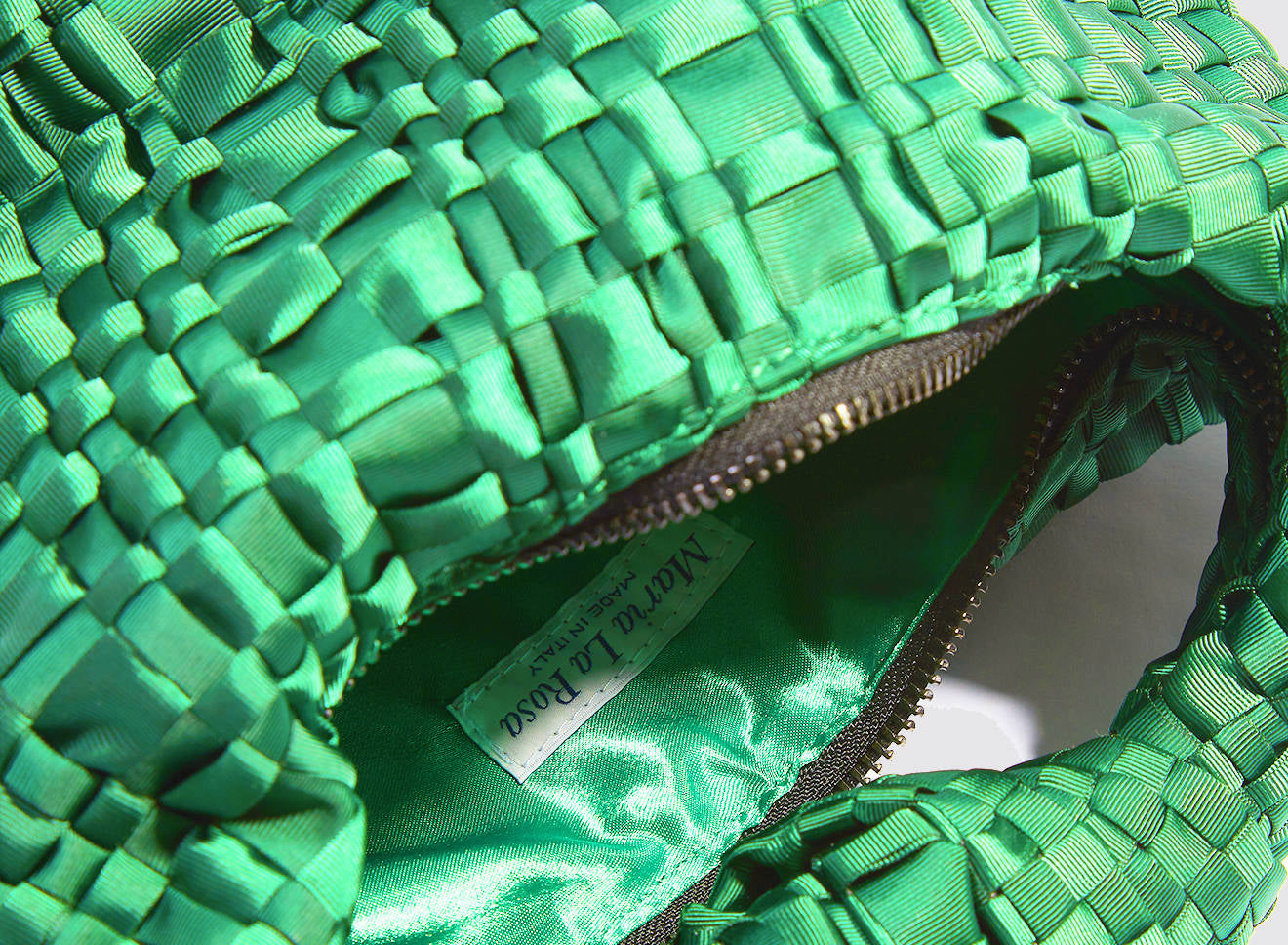 Borsa di piccole dimensioni in tessuto di nastro intrecciato, realizzato a mano su antichi telai. Dal design semplice, disponibile in diversi colori tinta unita, è perfetta per la stagione estiva. Dotata di chiusura a zip, manico a fusciacca con nodo, costituisce un modello compatto, dallo stile fresco e vivace. Interamente disegnata e prodotta in Italia.