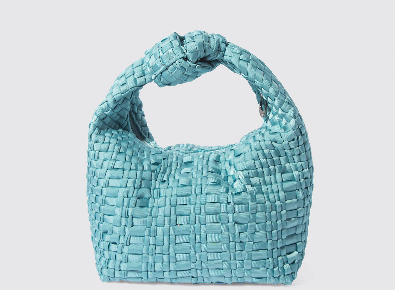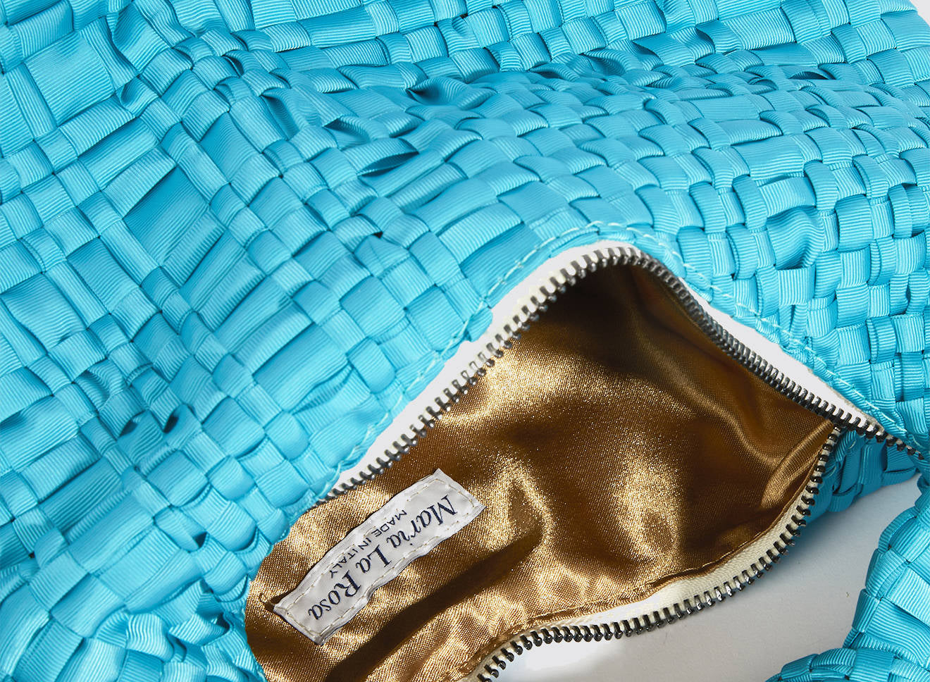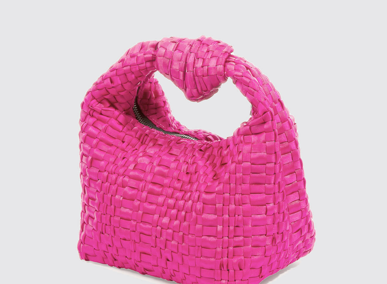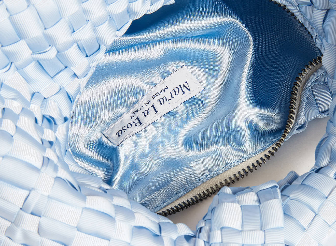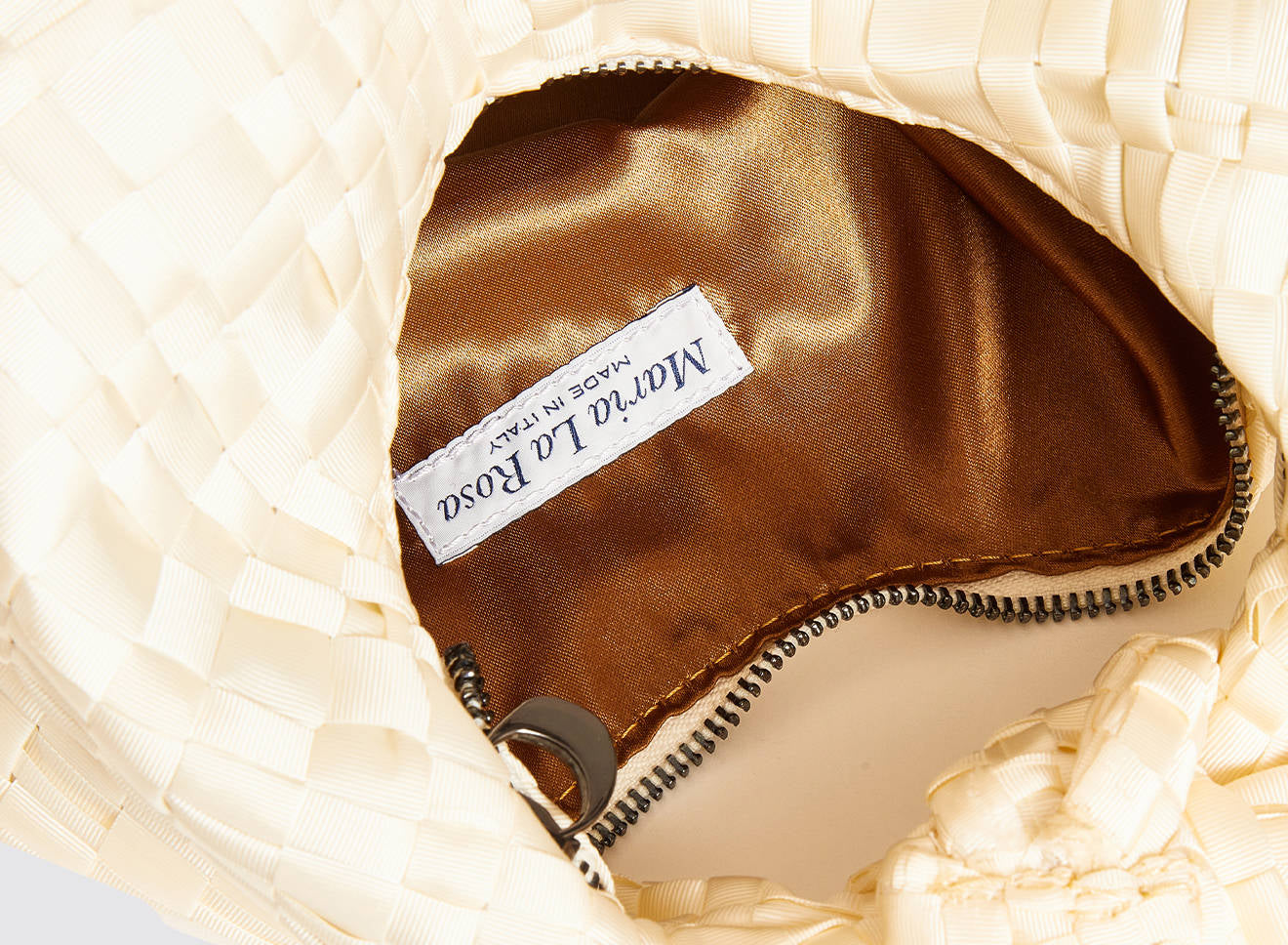 Borsa di piccole dimensioni in tessuto di nastro intrecciato, realizzato a mano su antichi telai. Dal design semplice, disponibile in diversi colori tinta unita, è perfetta per la stagione estiva. Dotata di chiusura a zip, manico a fusciacca con nodo, costituisce un modello compatto, dallo stile fresco e vivace. Interamente disegnata e prodotta in Italia.