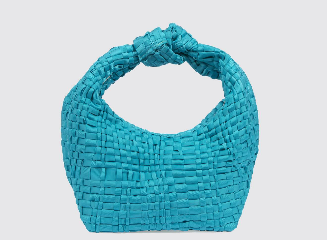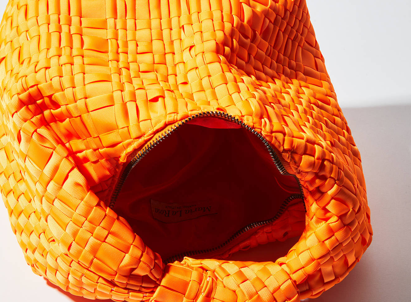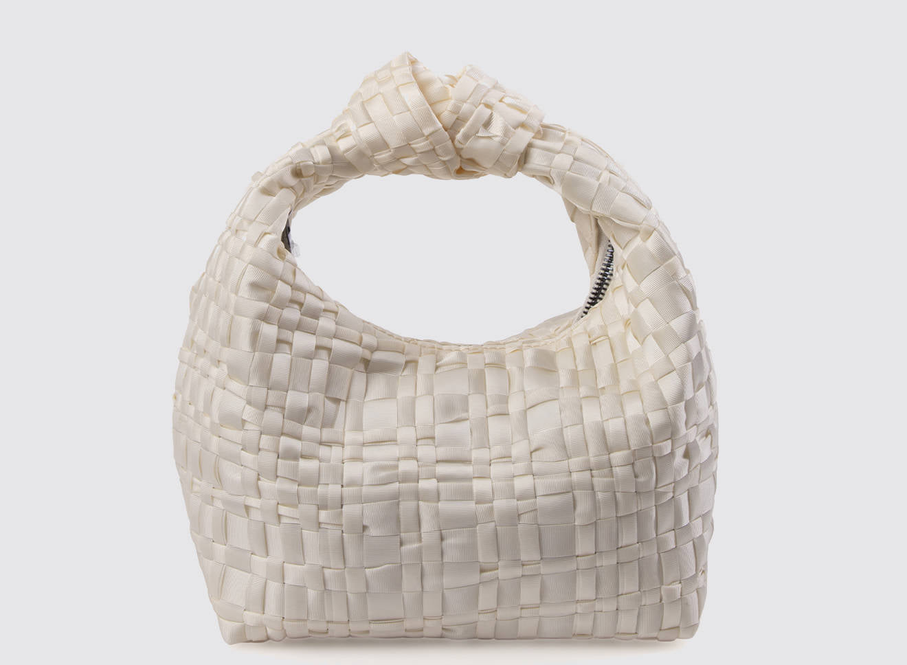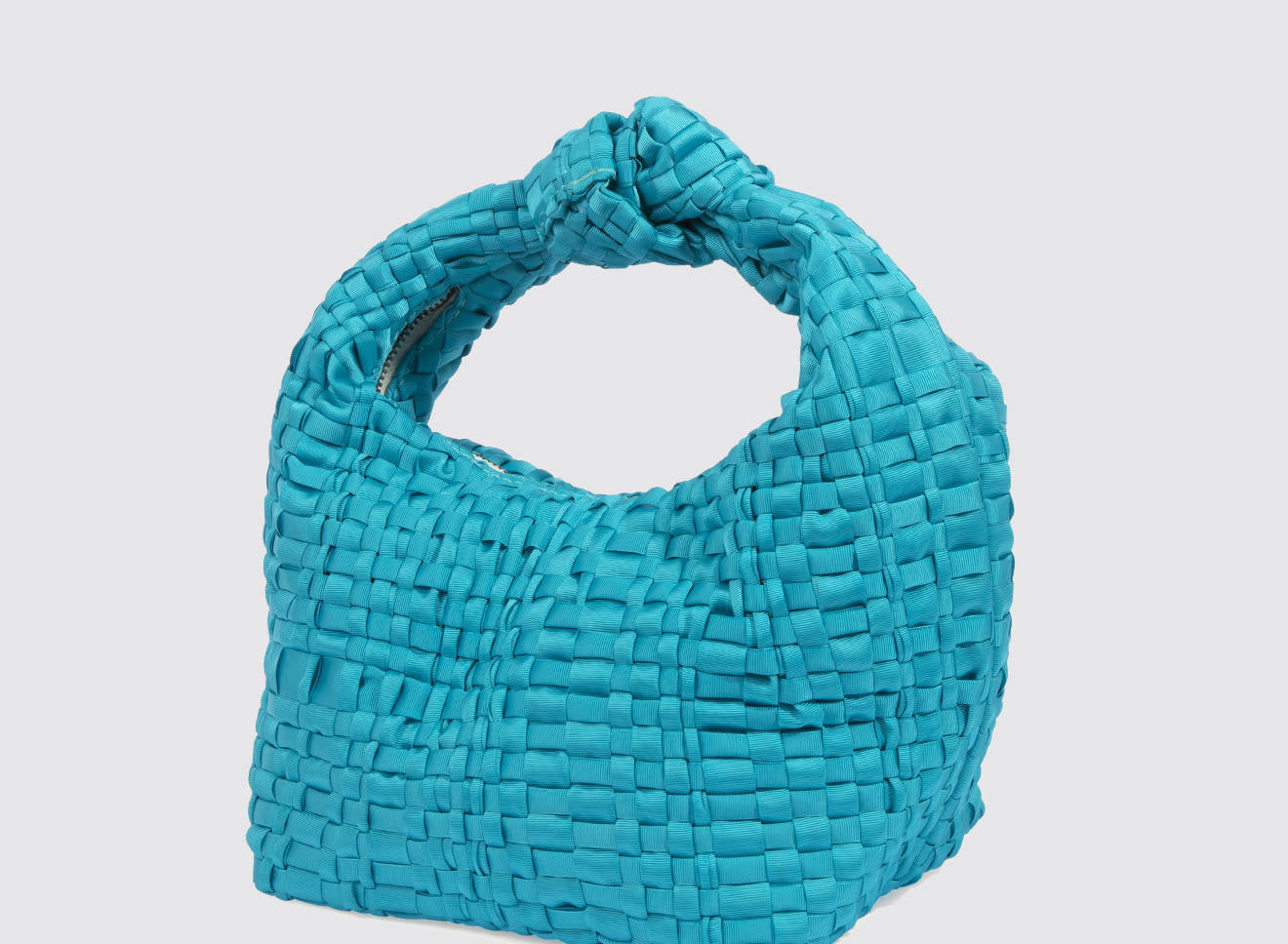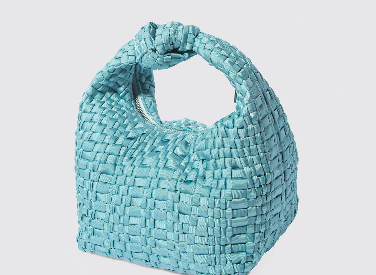Borsa di piccole dimensioni in tessuto di nastro intrecciato, realizzato a mano su antichi telai. Dal design semplice, disponibile in diversi colori tinta unita, è perfetta per la stagione estiva. Dotata di chiusura a zip, manico a fusciacca con nodo, costituisce un modello compatto, dallo stile fresco e vivace. Interamente disegnata e prodotta in Italia.