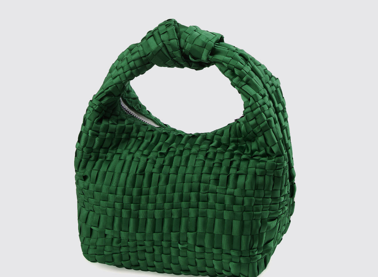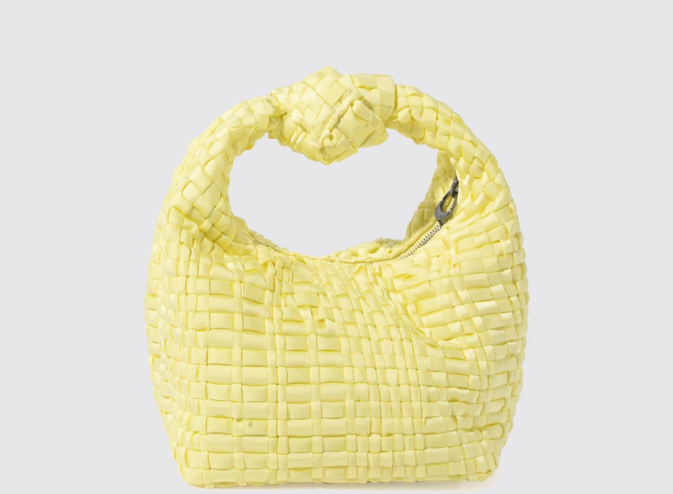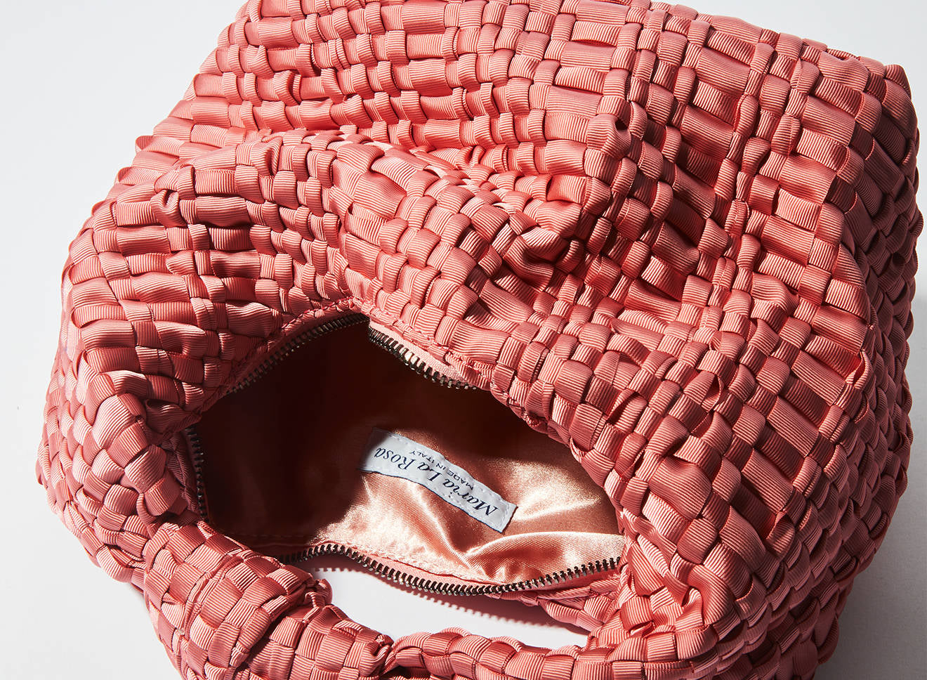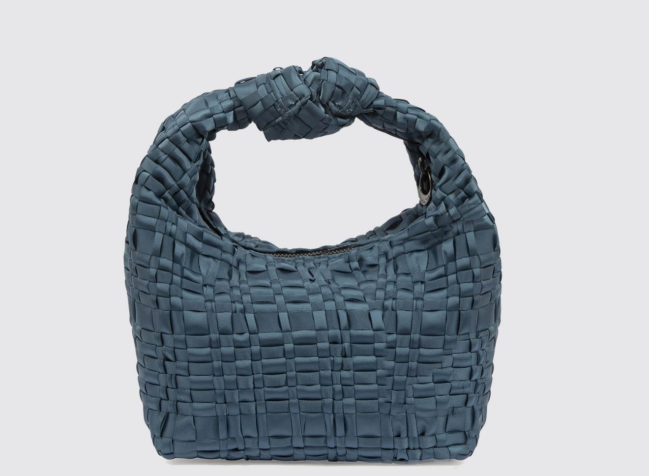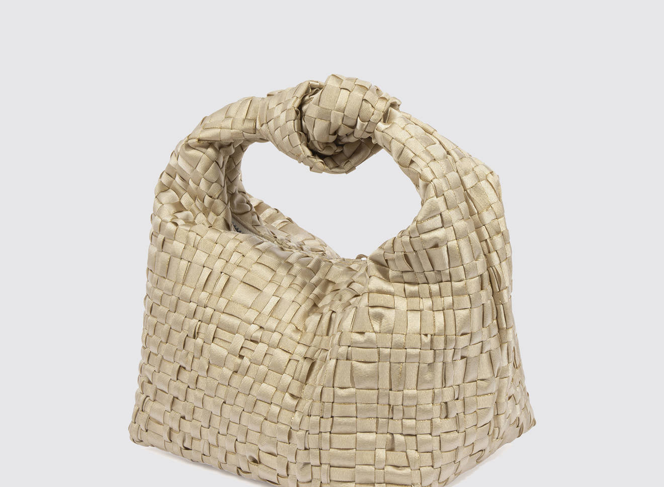 Borsa di piccole dimensioni in tessuto di nastro intrecciato, realizzato a mano su antichi telai. Dal design semplice, disponibile in diversi colori tinta unita, è perfetta per la stagione estiva. Dotata di chiusura a zip, manico a fusciacca con nodo, costituisce un modello compatto, dallo stile fresco e vivace. Interamente disegnata e prodotta in Italia.