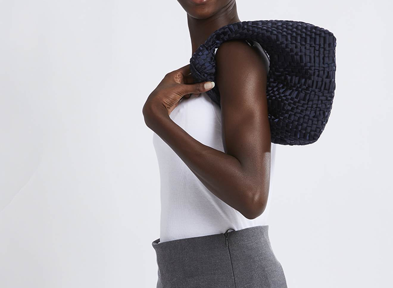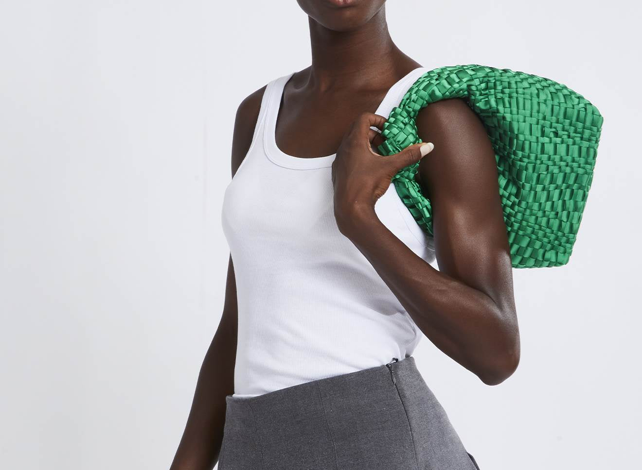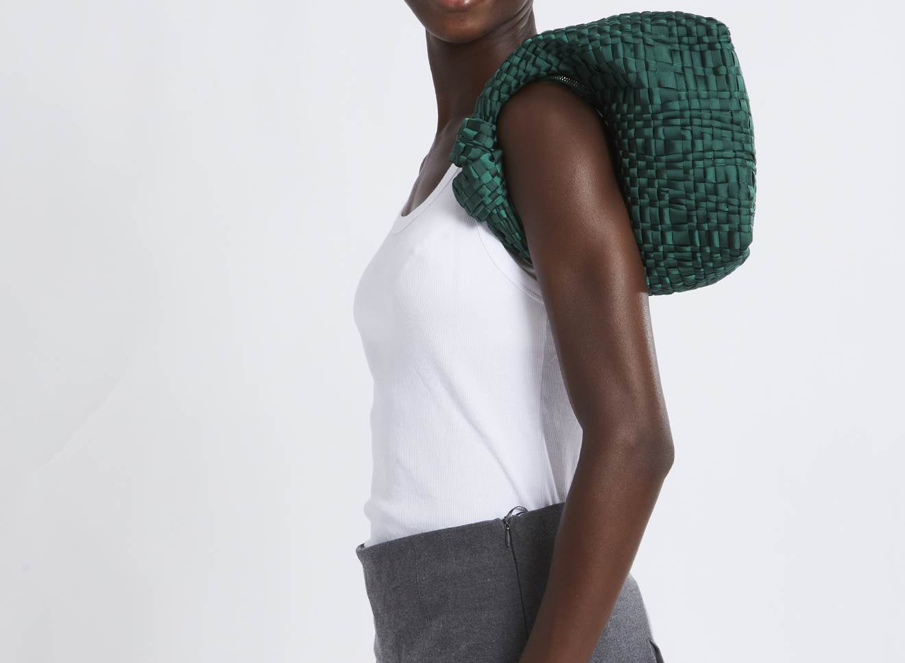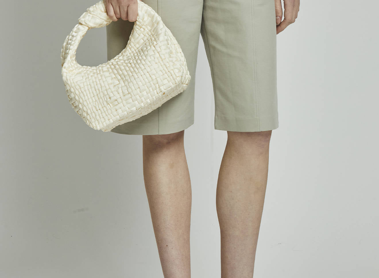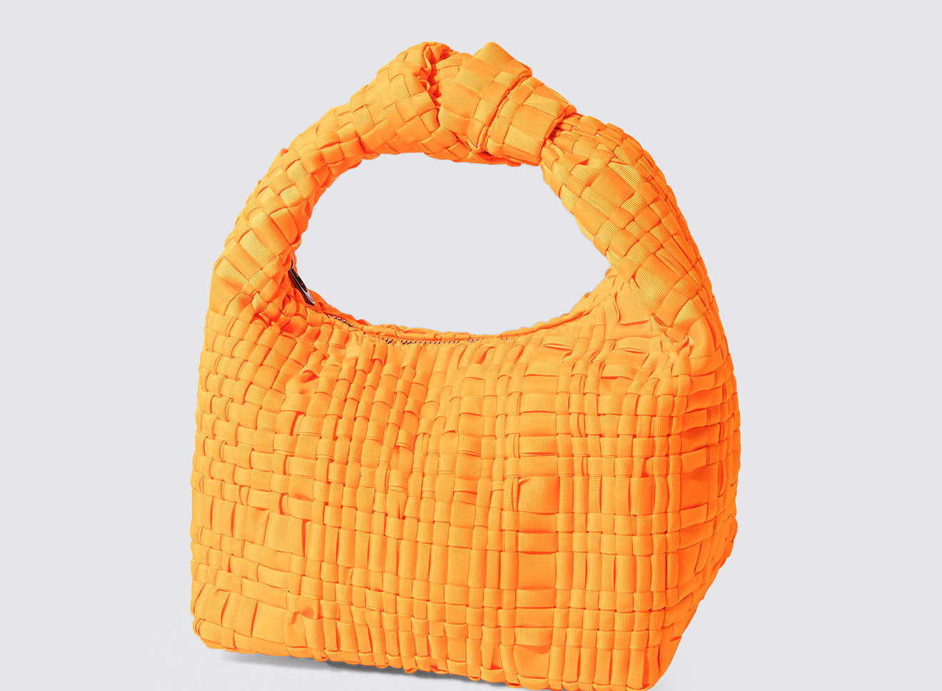 Borsa di piccole dimensioni in tessuto di nastro intrecciato, realizzato a mano su antichi telai. Dal design semplice, disponibile in diversi colori tinta unita, è perfetta per la stagione estiva. Dotata di chiusura a zip, manico a fusciacca con nodo, costituisce un modello compatto, dallo stile fresco e vivace. Interamente disegnata e prodotta in Italia.