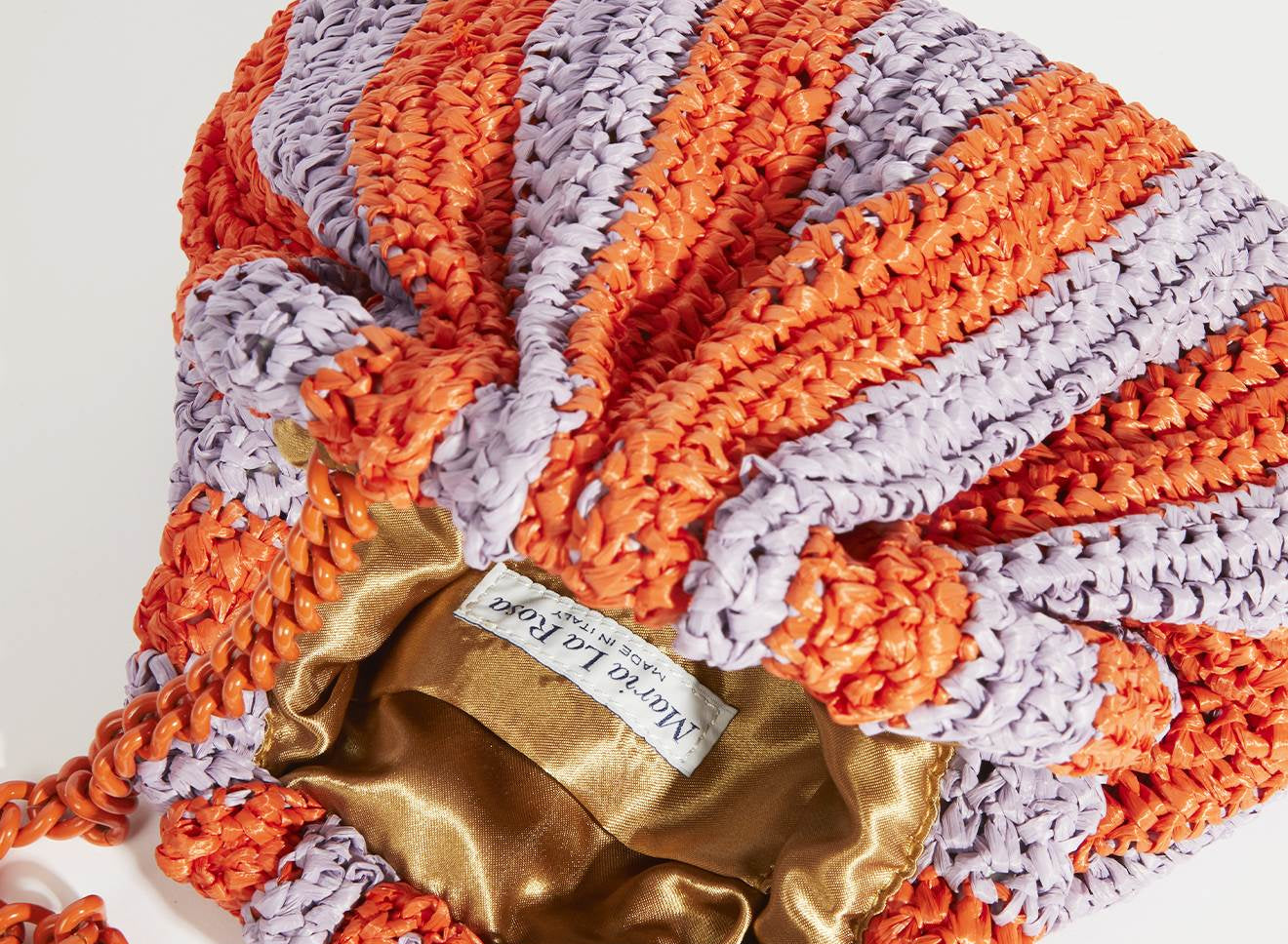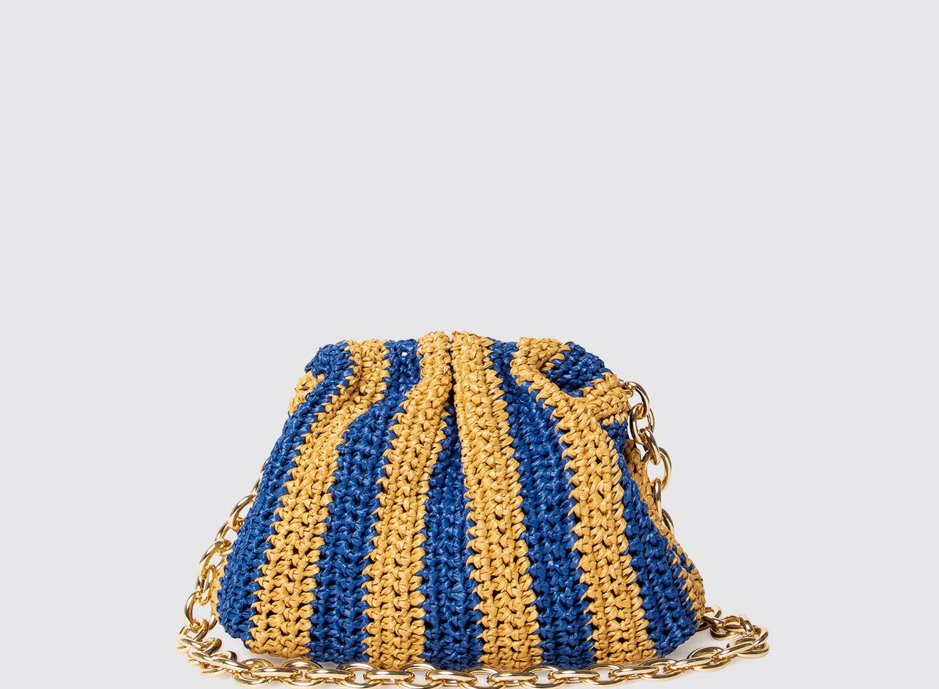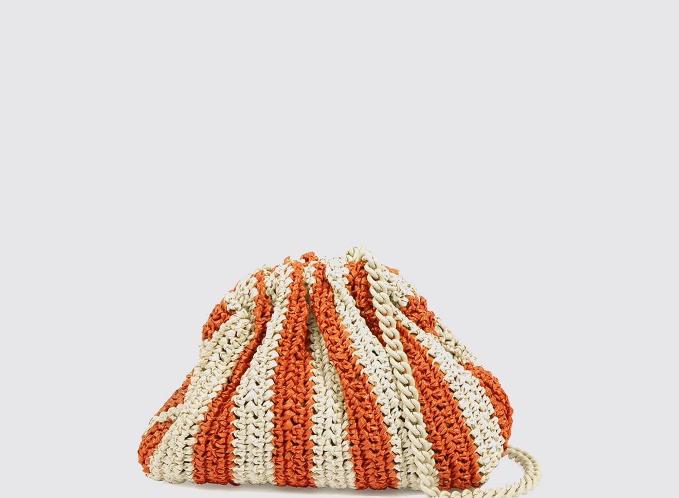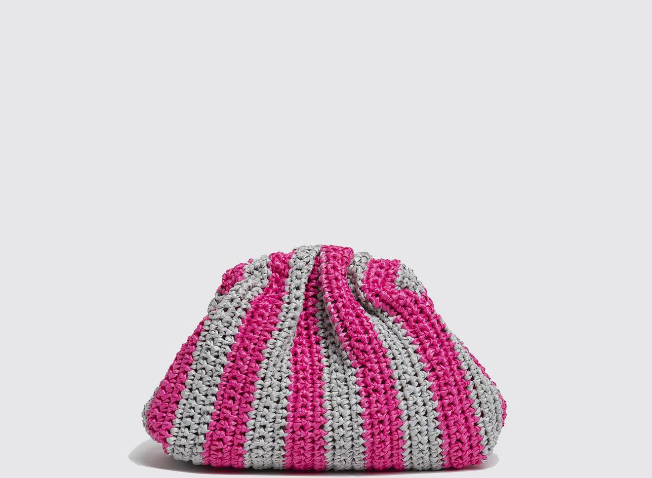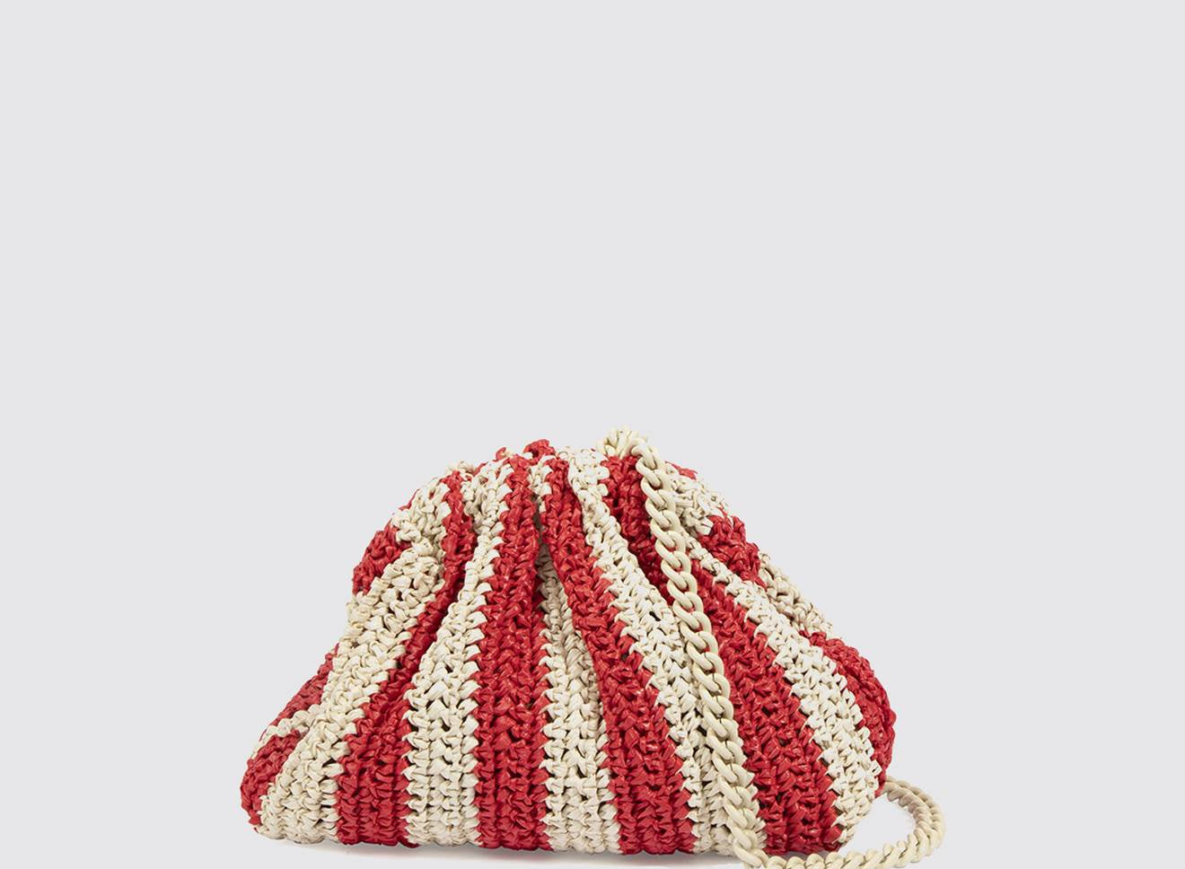 Clutch da donna di piccole dimensioni in rafia, realizzata interamente a mano con la tecnica crochet. Questa inedita versione ridotta dell’icon bag Maria La Rosa, è capiente quanto basta per portare con sé l'essenziale. È dotata di catena ton sur ton ed è disponibile in molteplici varianti rigate.