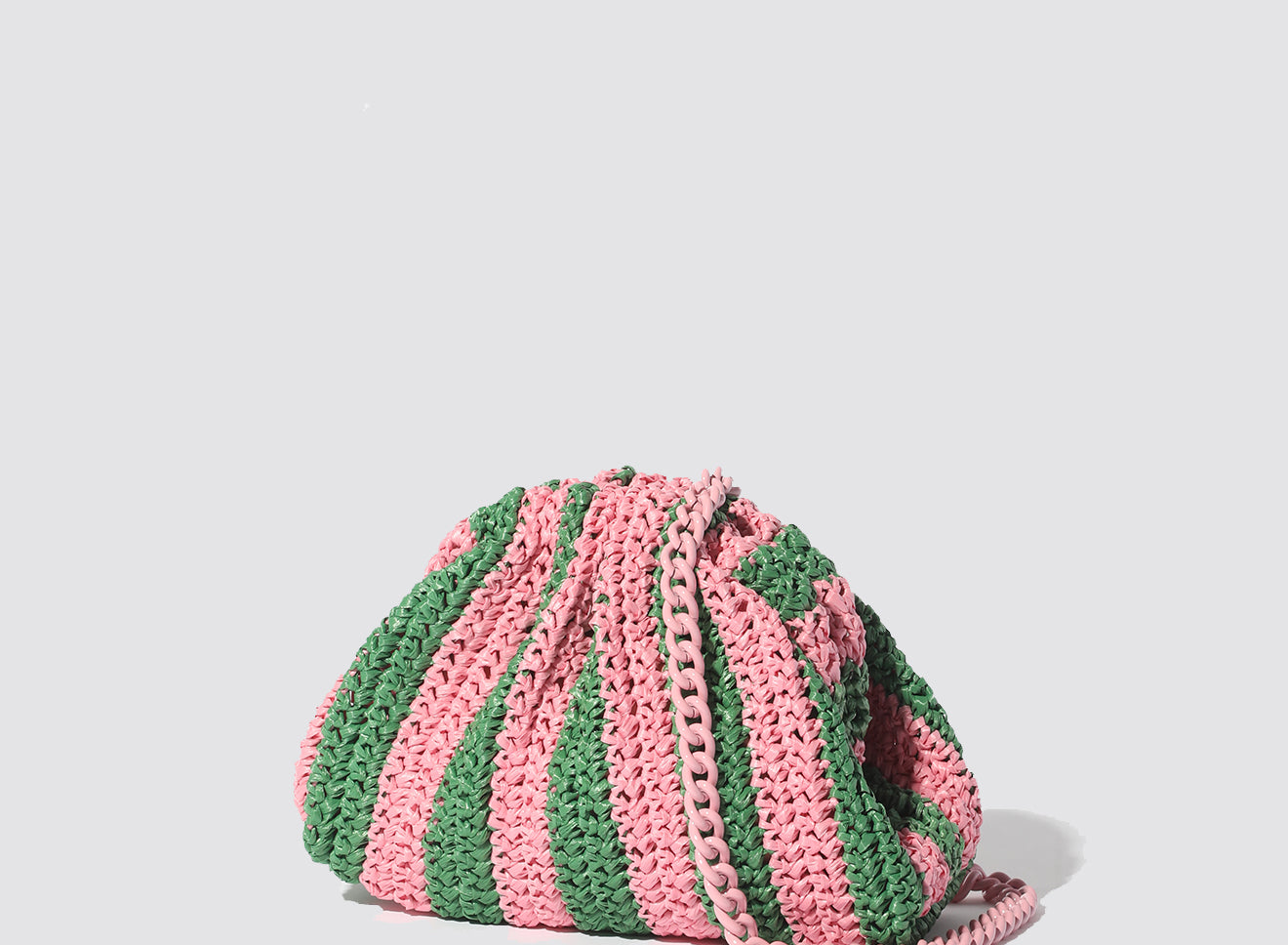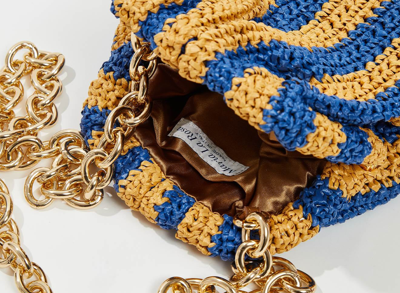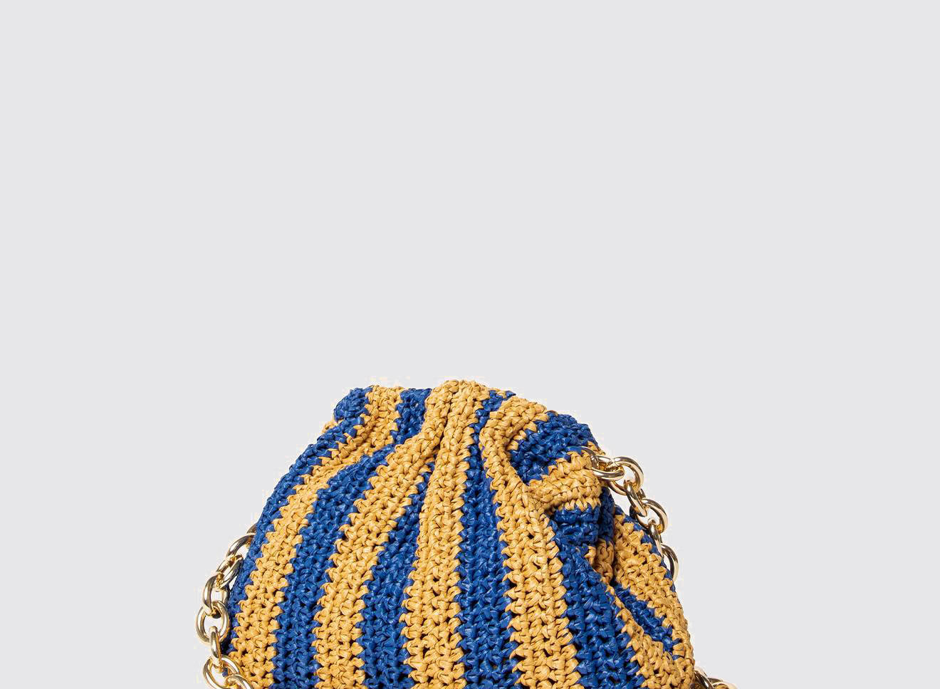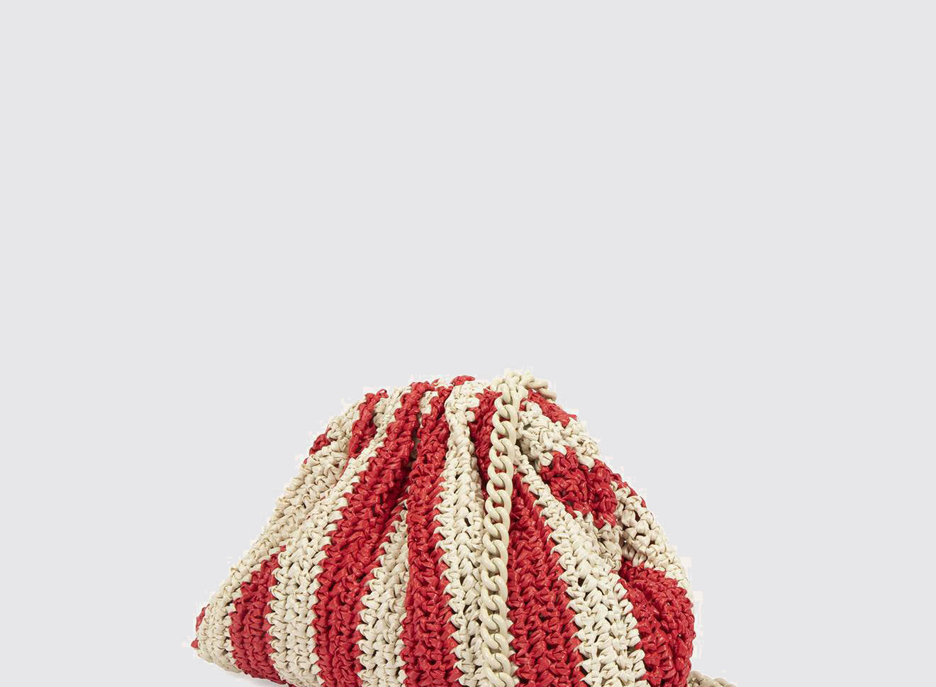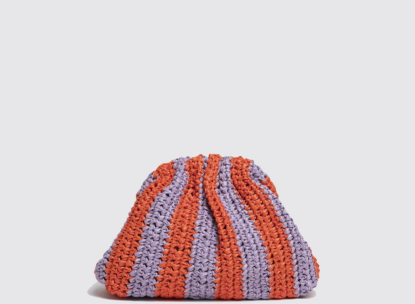 Clutch da donna di piccole dimensioni in rafia, realizzata interamente a mano con la tecnica crochet. Questa inedita versione ridotta dell’icon bag Maria La Rosa, è capiente quanto basta per portare con sé l'essenziale. È dotata di catena ton sur ton ed è disponibile in molteplici varianti rigate.