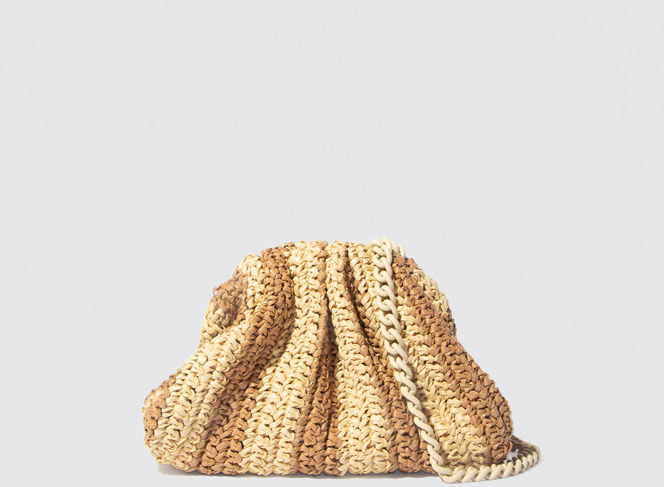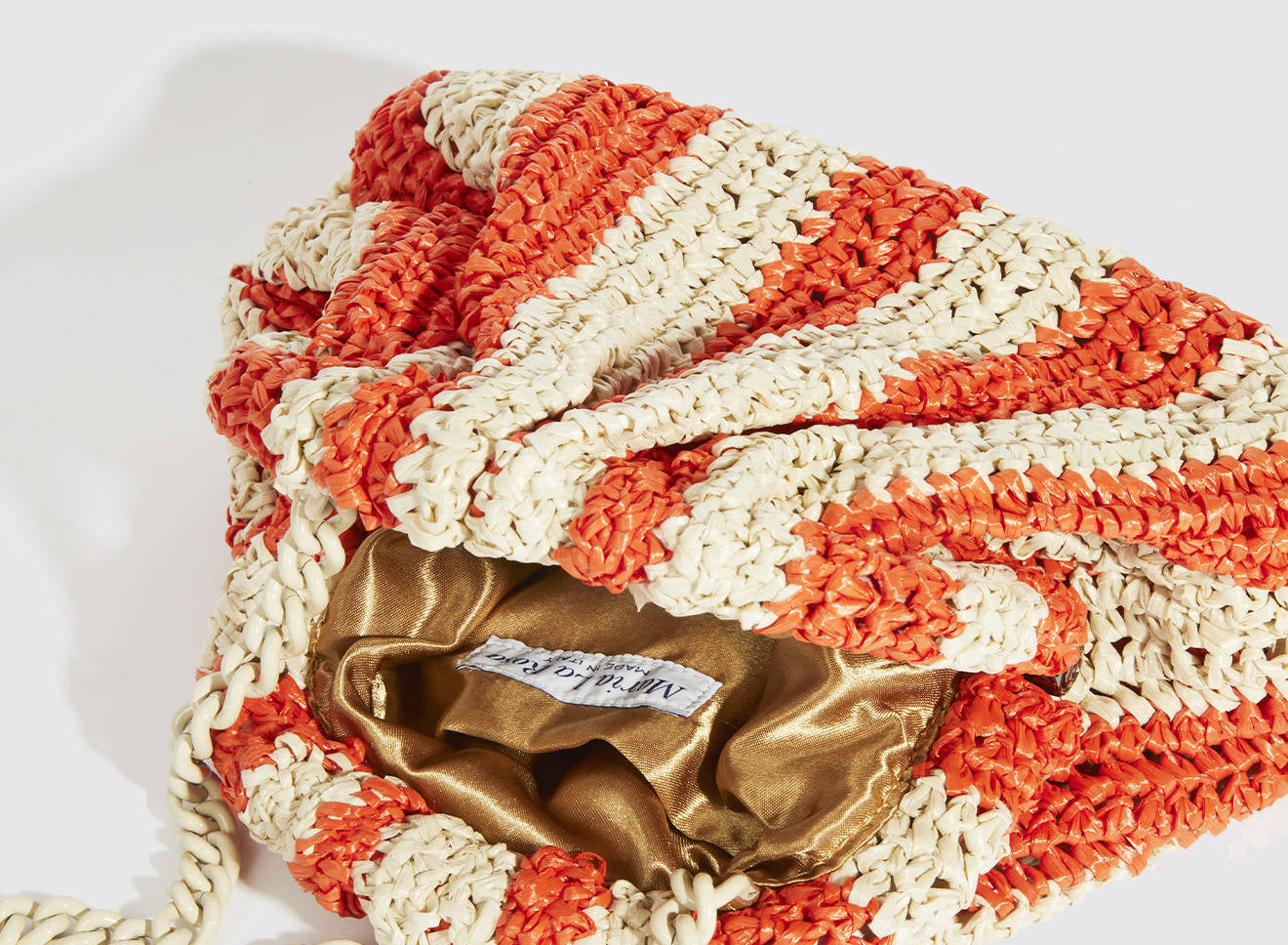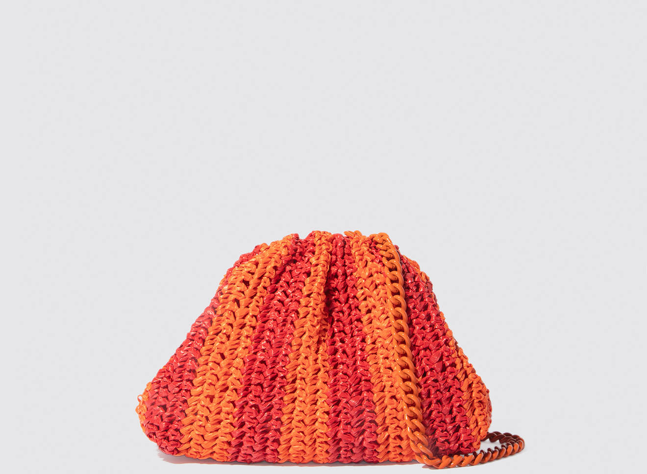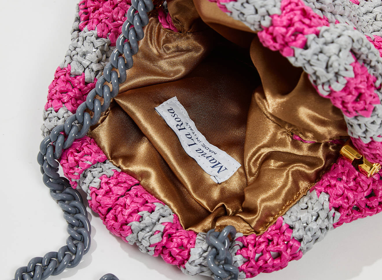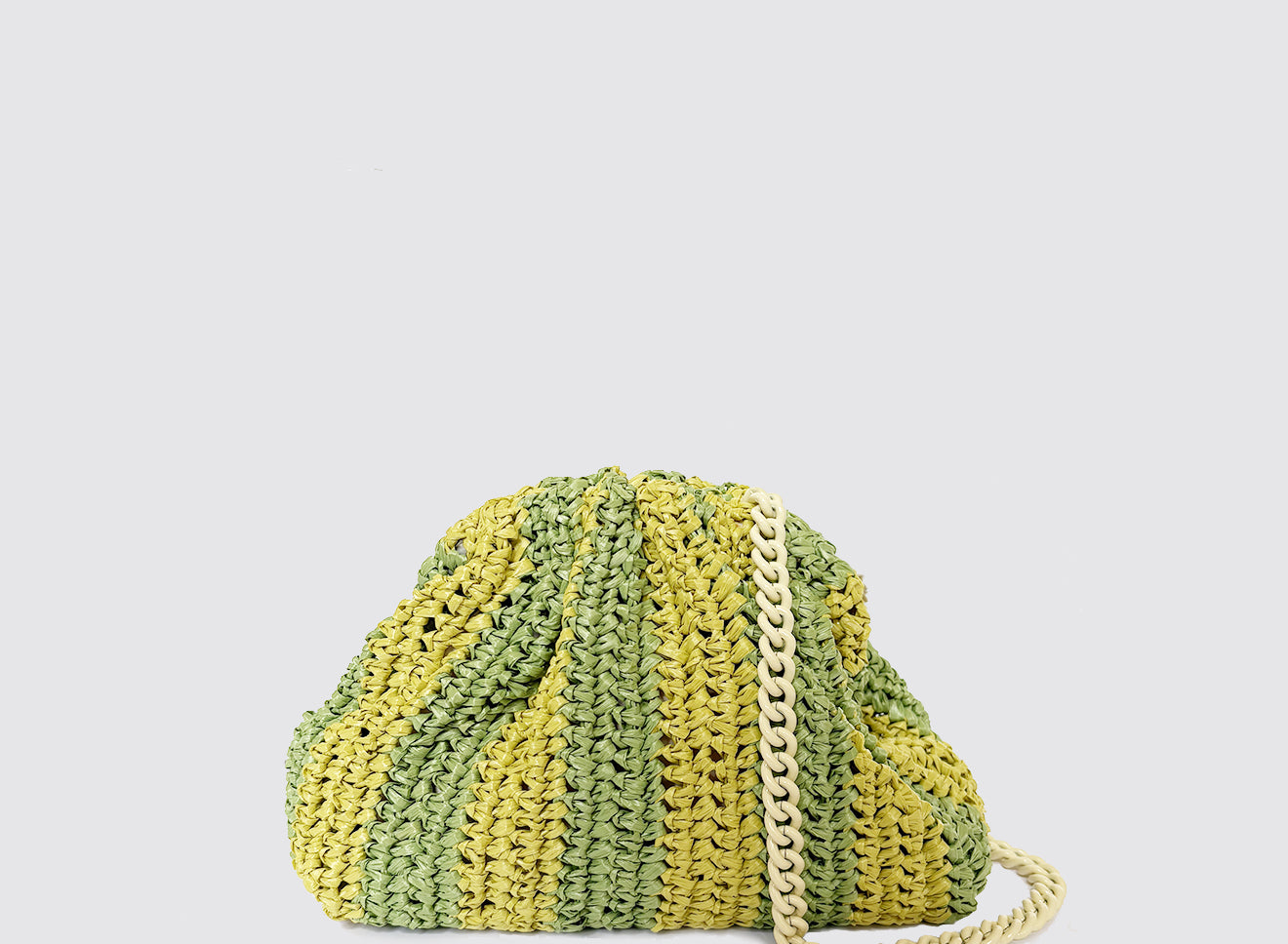 Clutch da donna di piccole dimensioni in rafia, realizzata interamente a mano con la tecnica crochet. Questa inedita versione ridotta dell’icon bag Maria La Rosa, è capiente quanto basta per portare con sé l'essenziale. È dotata di catena ton sur ton ed è disponibile in molteplici varianti rigate.