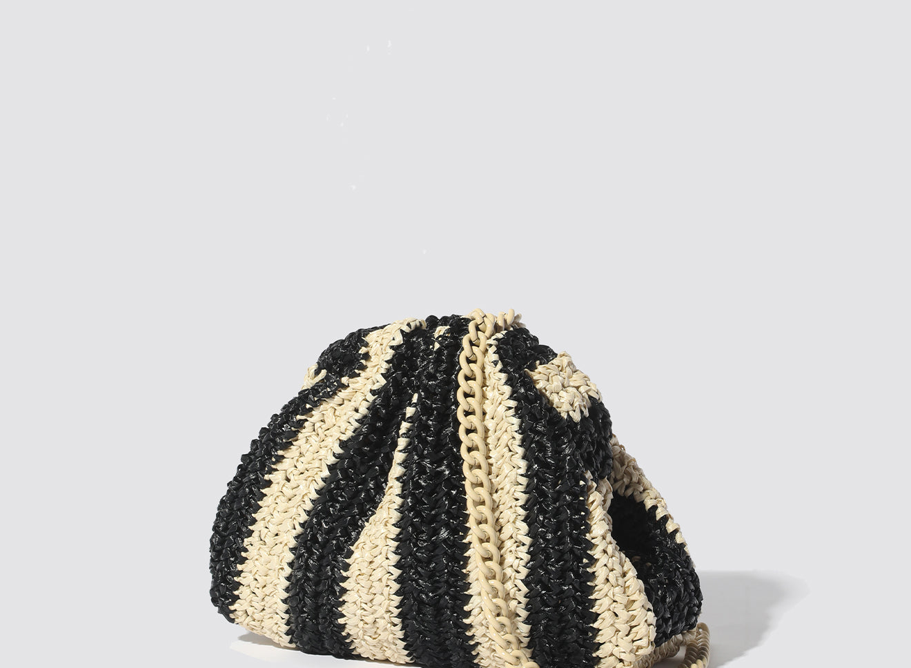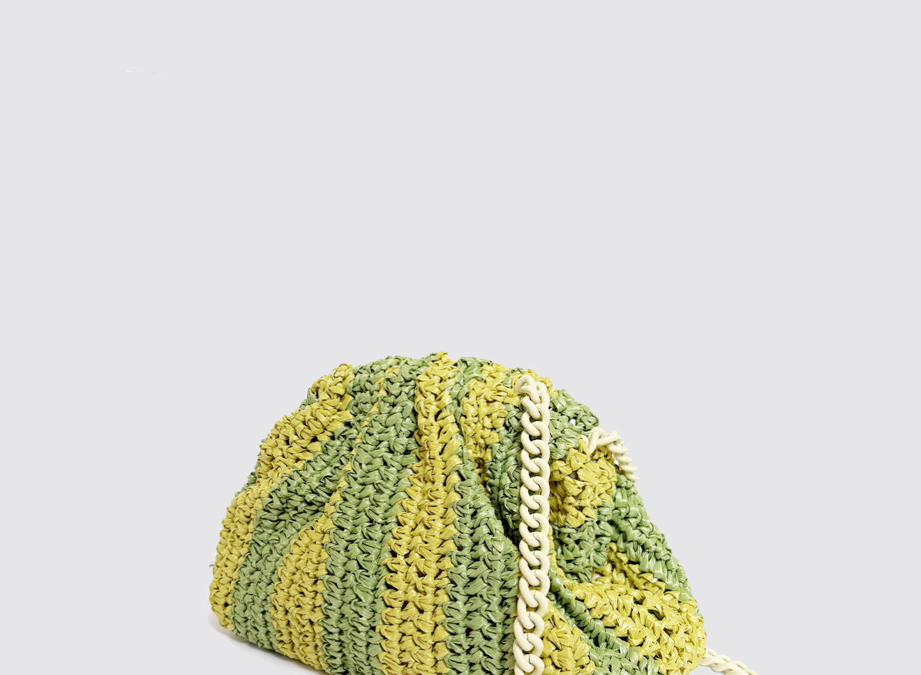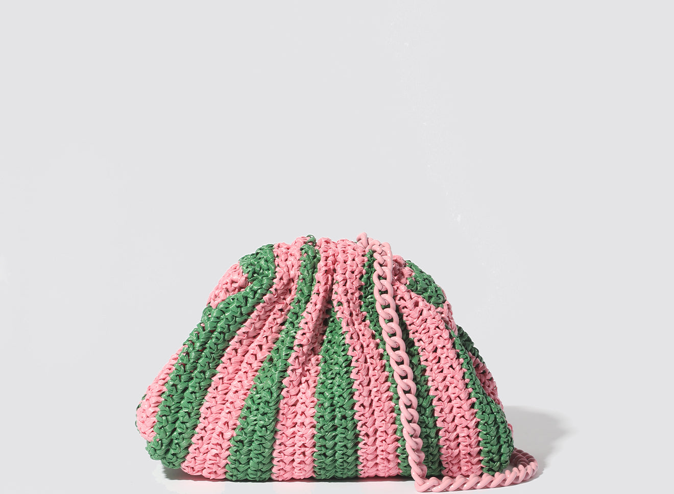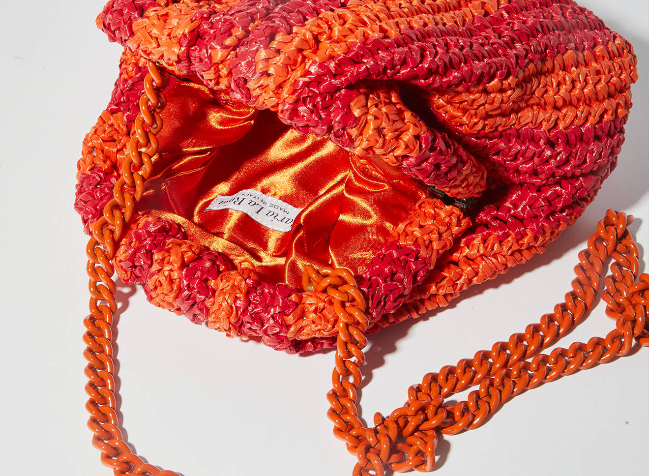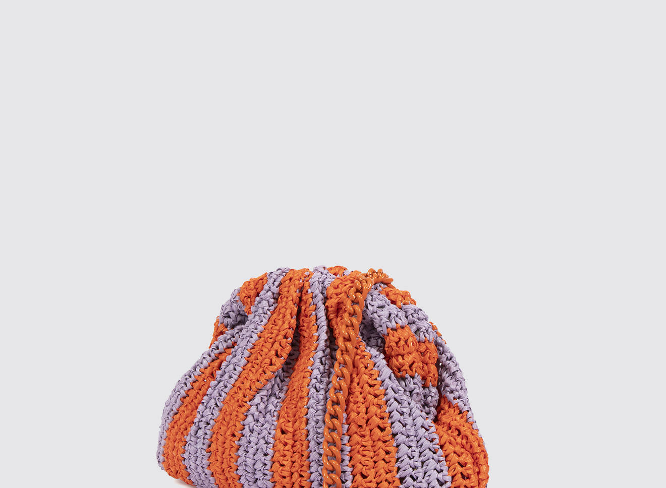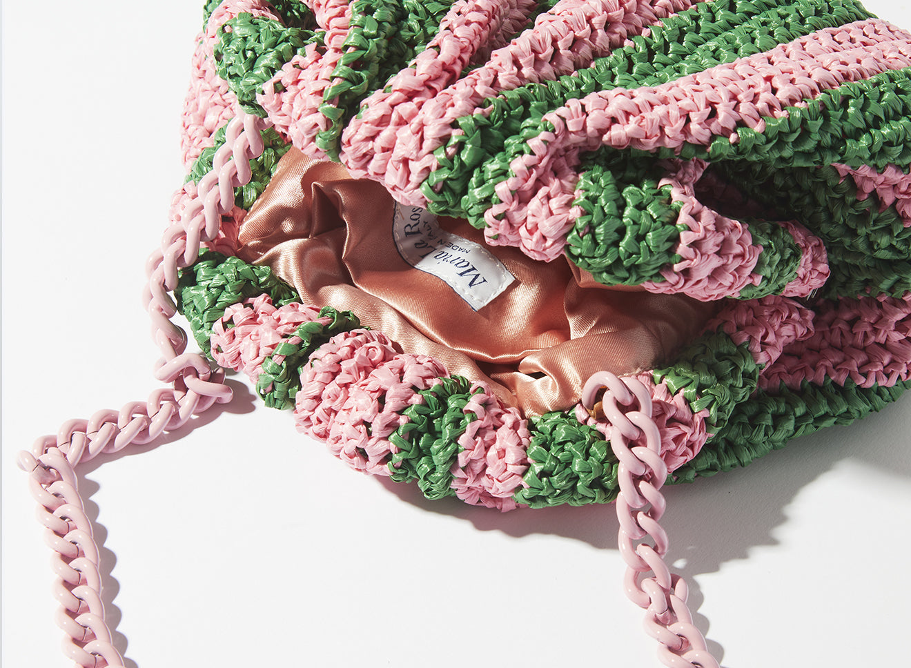 Clutch da donna di piccole dimensioni in rafia, realizzata interamente a mano con la tecnica crochet. Questa inedita versione ridotta dell’icon bag Maria La Rosa, è capiente quanto basta per portare con sé l'essenziale. È dotata di catena ton sur ton ed è disponibile in molteplici varianti rigate.