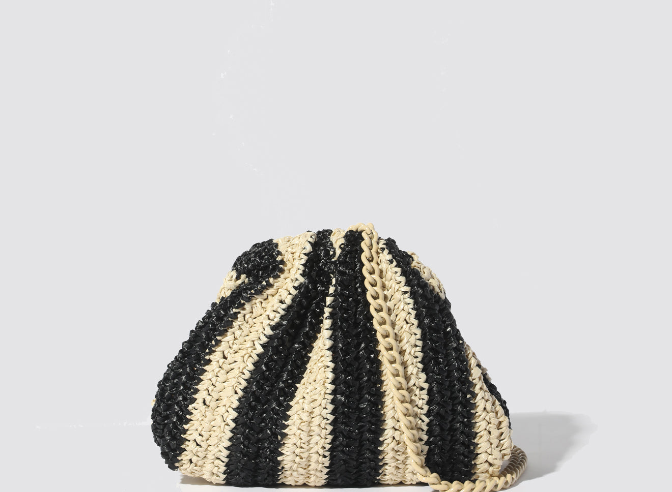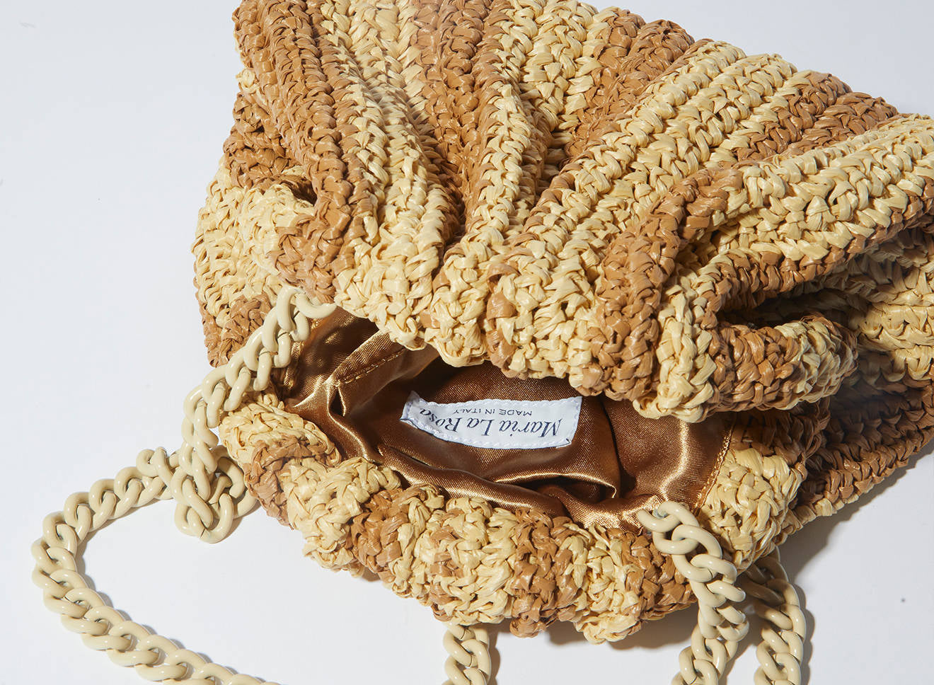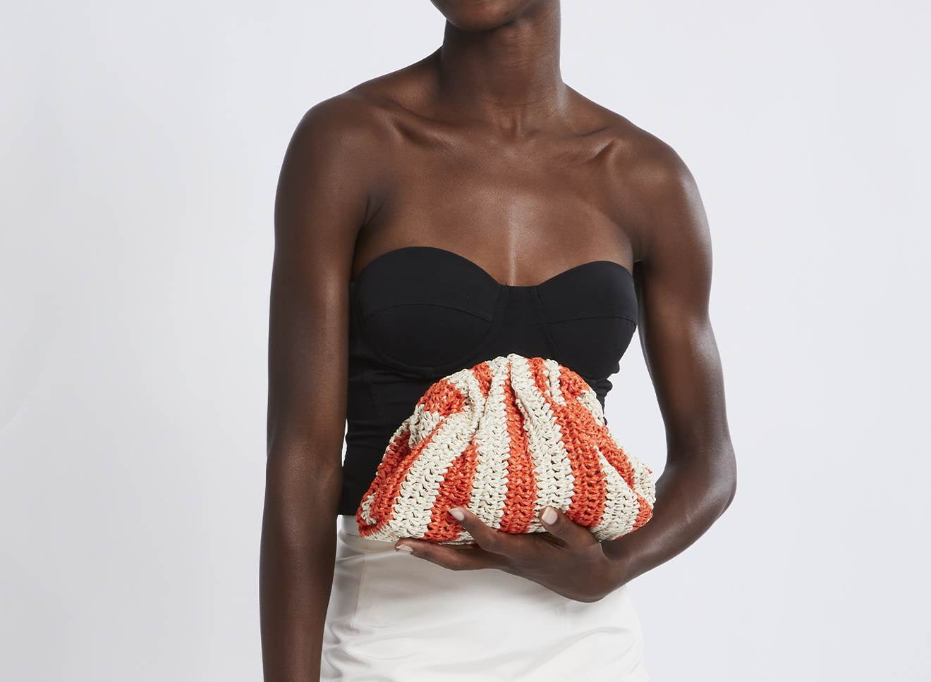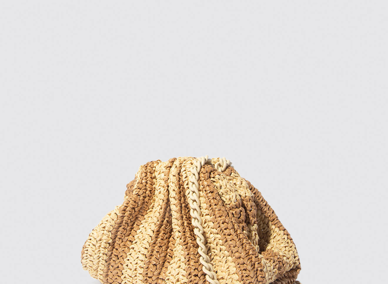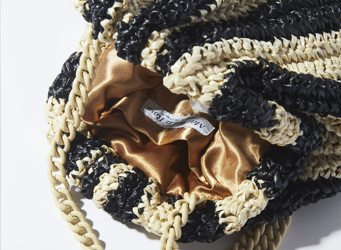 Clutch da donna di piccole dimensioni in rafia, realizzata interamente a mano con la tecnica crochet. Questa inedita versione ridotta dell’icon bag Maria La Rosa, è capiente quanto basta per portare con sé l'essenziale. È dotata di catena ton sur ton ed è disponibile in molteplici varianti rigate.