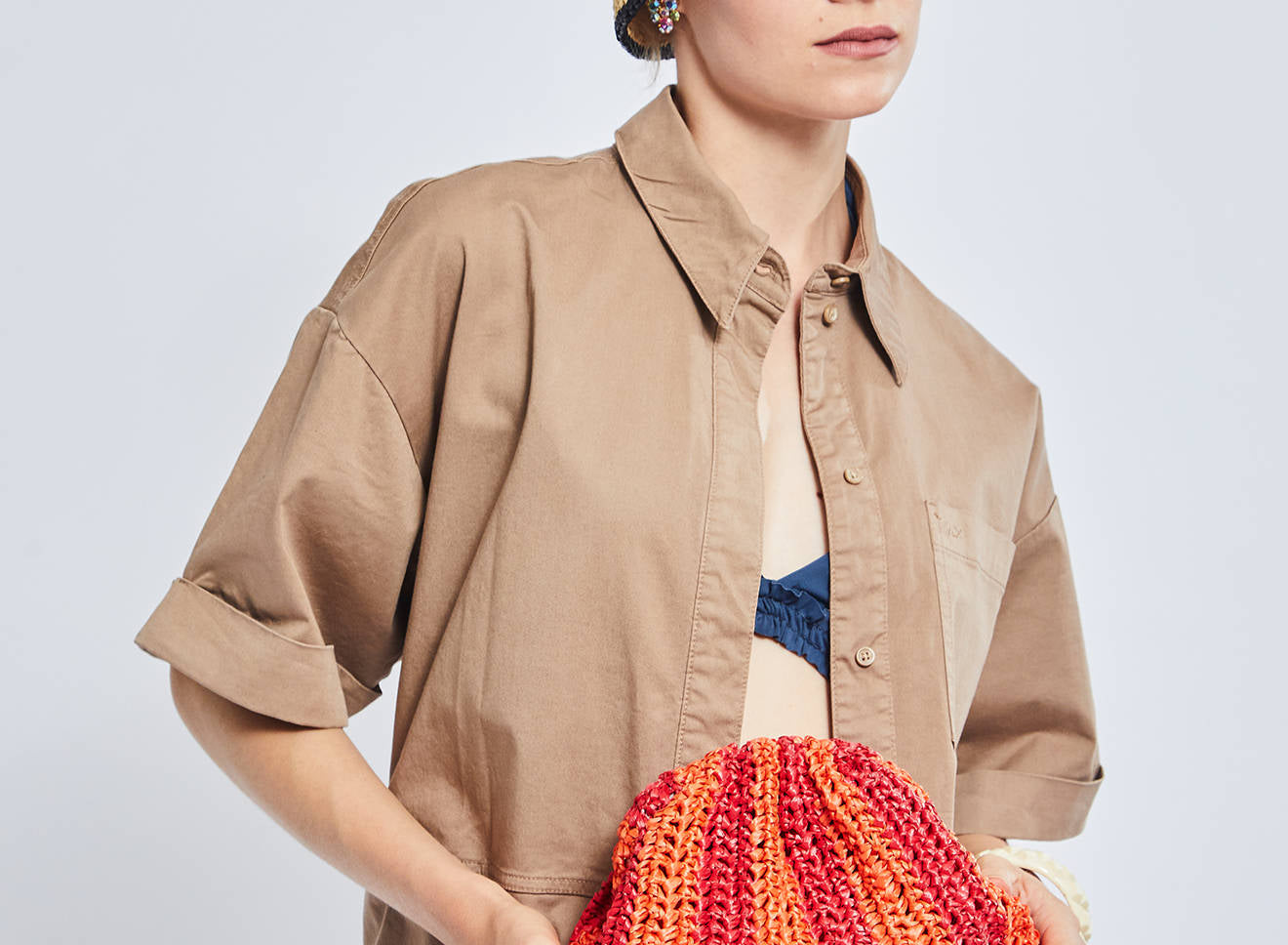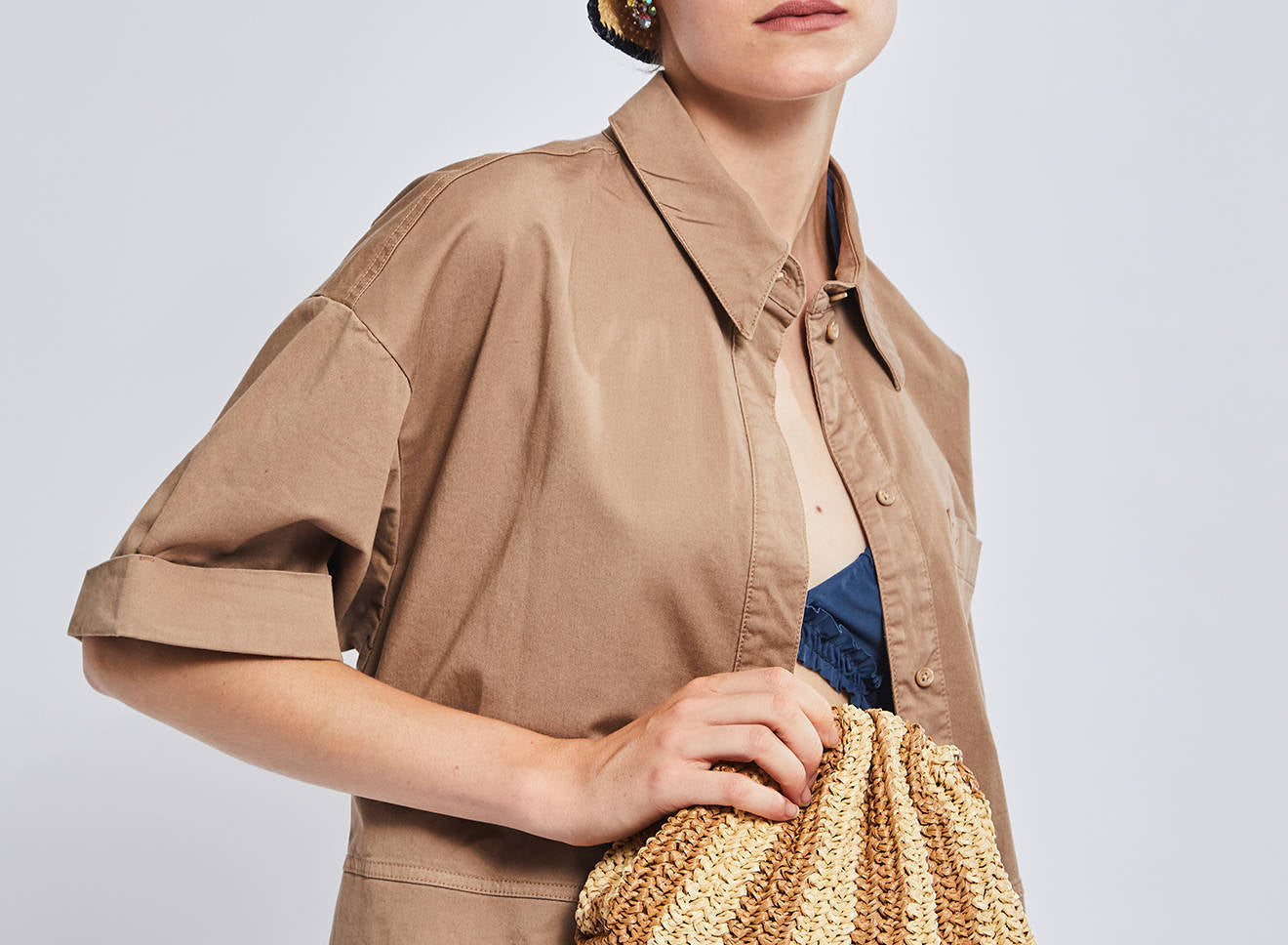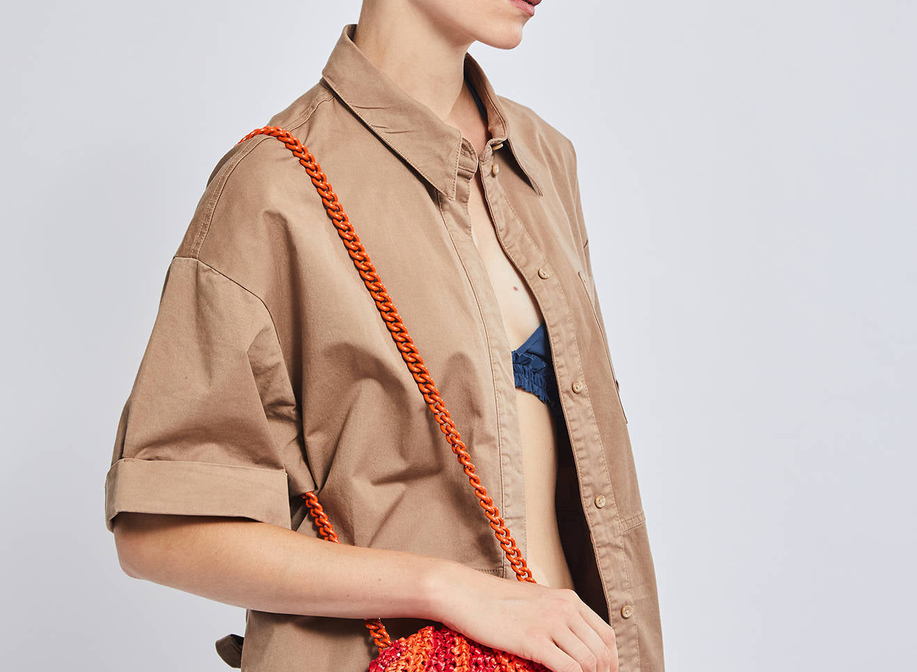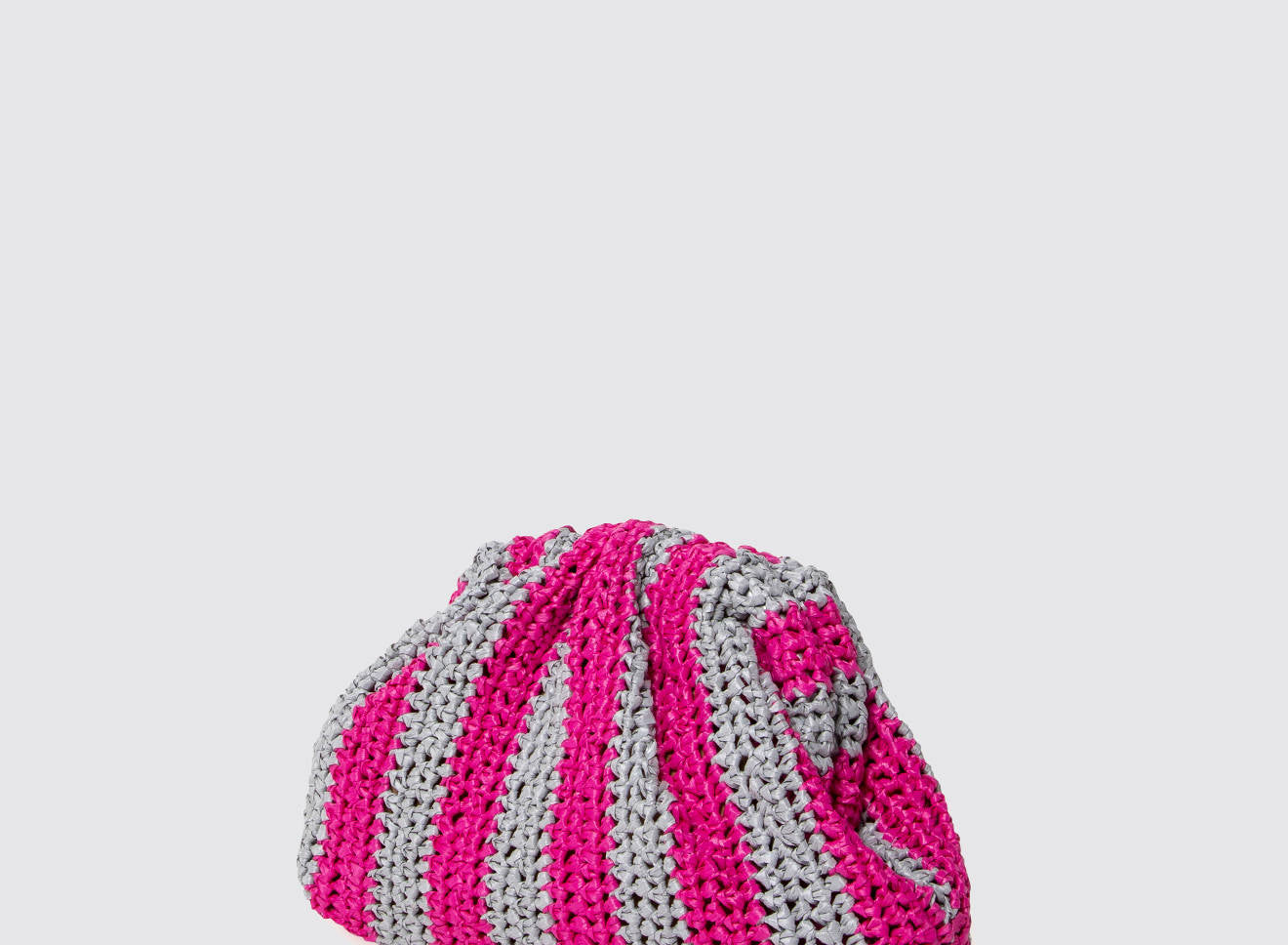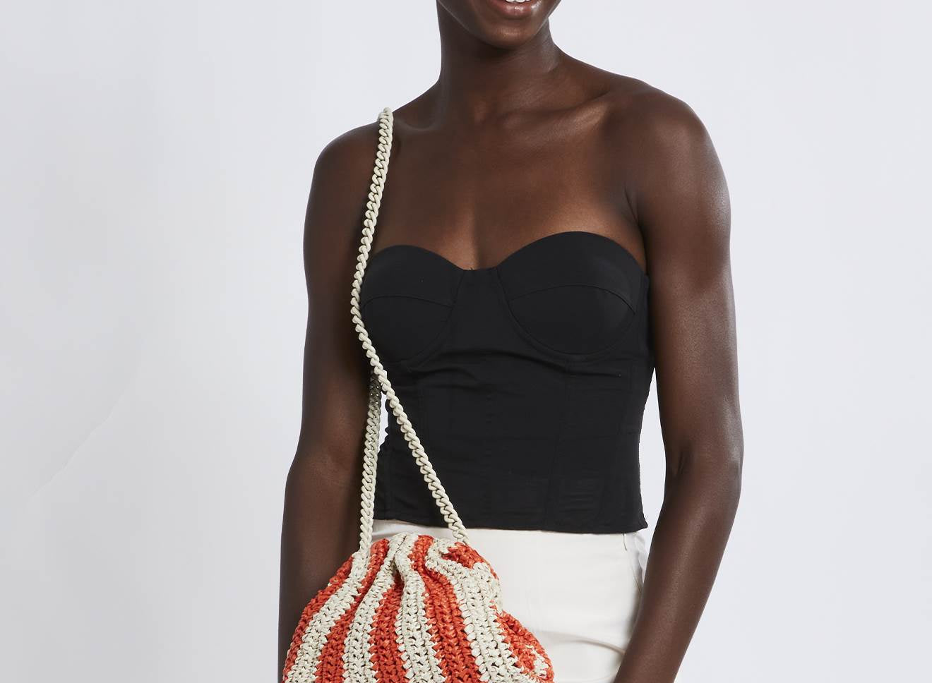 Clutch da donna di piccole dimensioni in rafia, realizzata interamente a mano con la tecnica crochet. Questa inedita versione ridotta dell’icon bag Maria La Rosa, è capiente quanto basta per portare con sé l'essenziale. È dotata di catena ton sur ton ed è disponibile in molteplici varianti rigate.