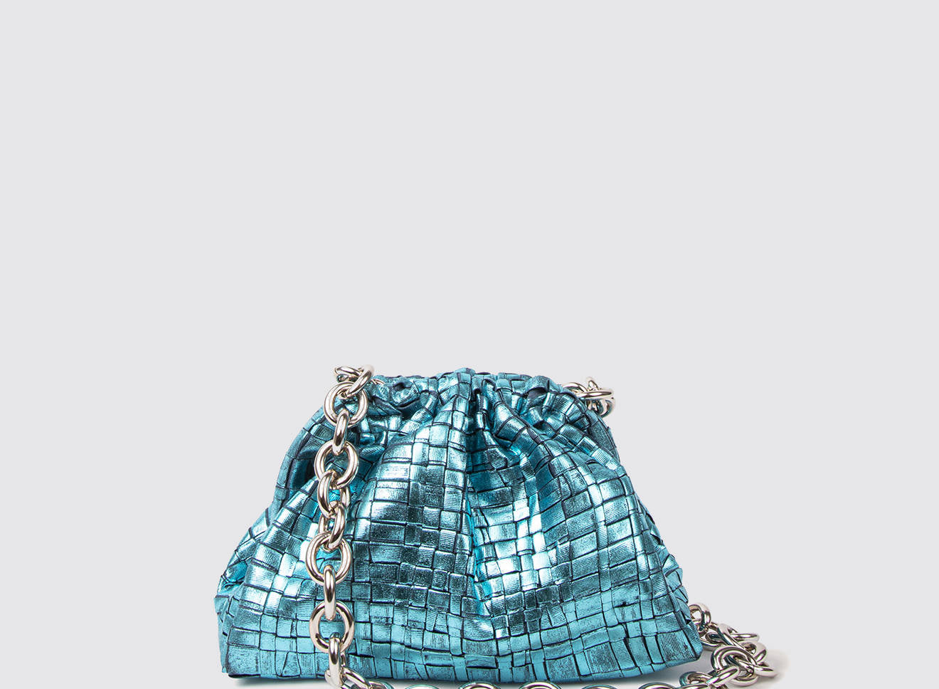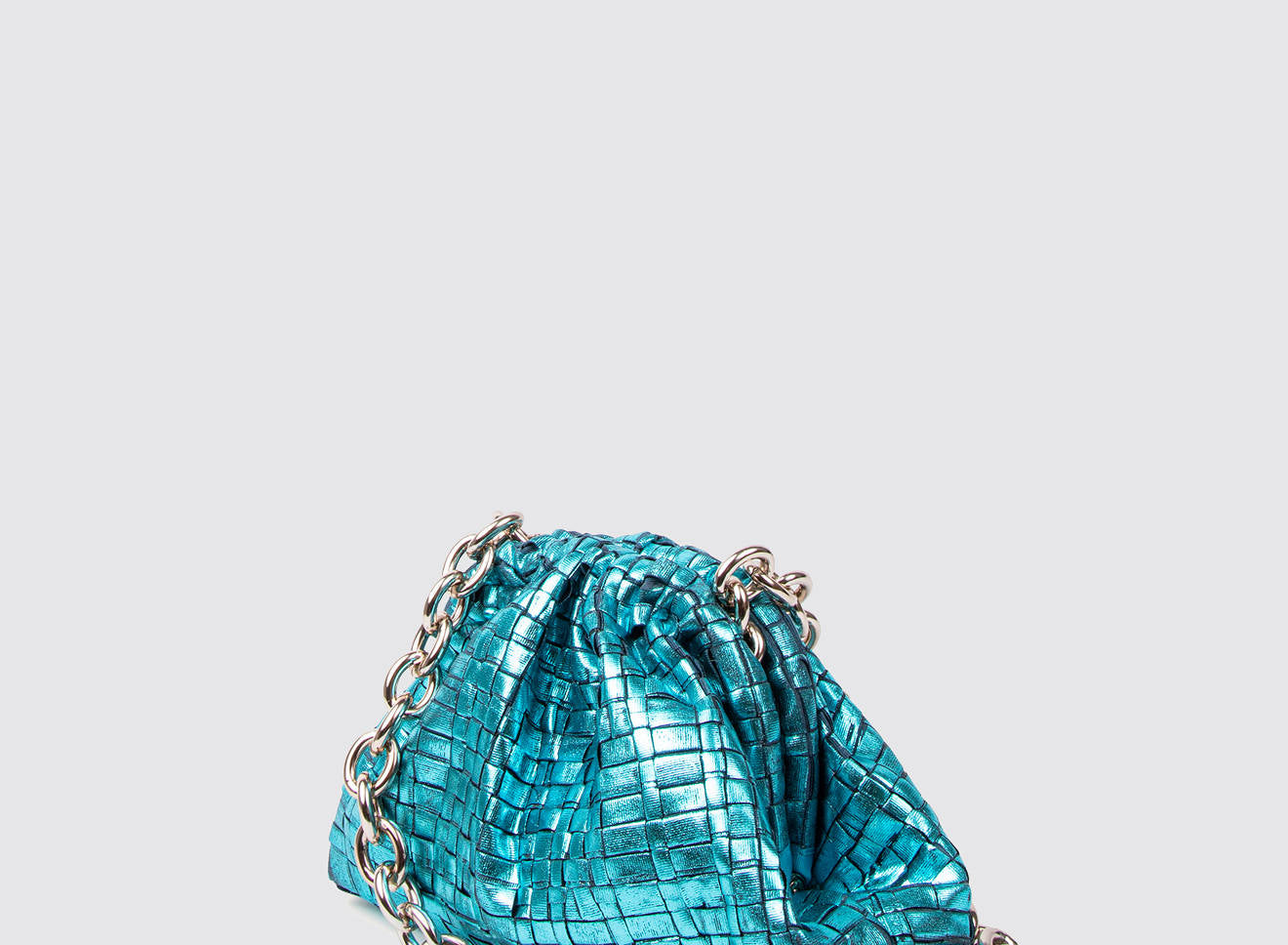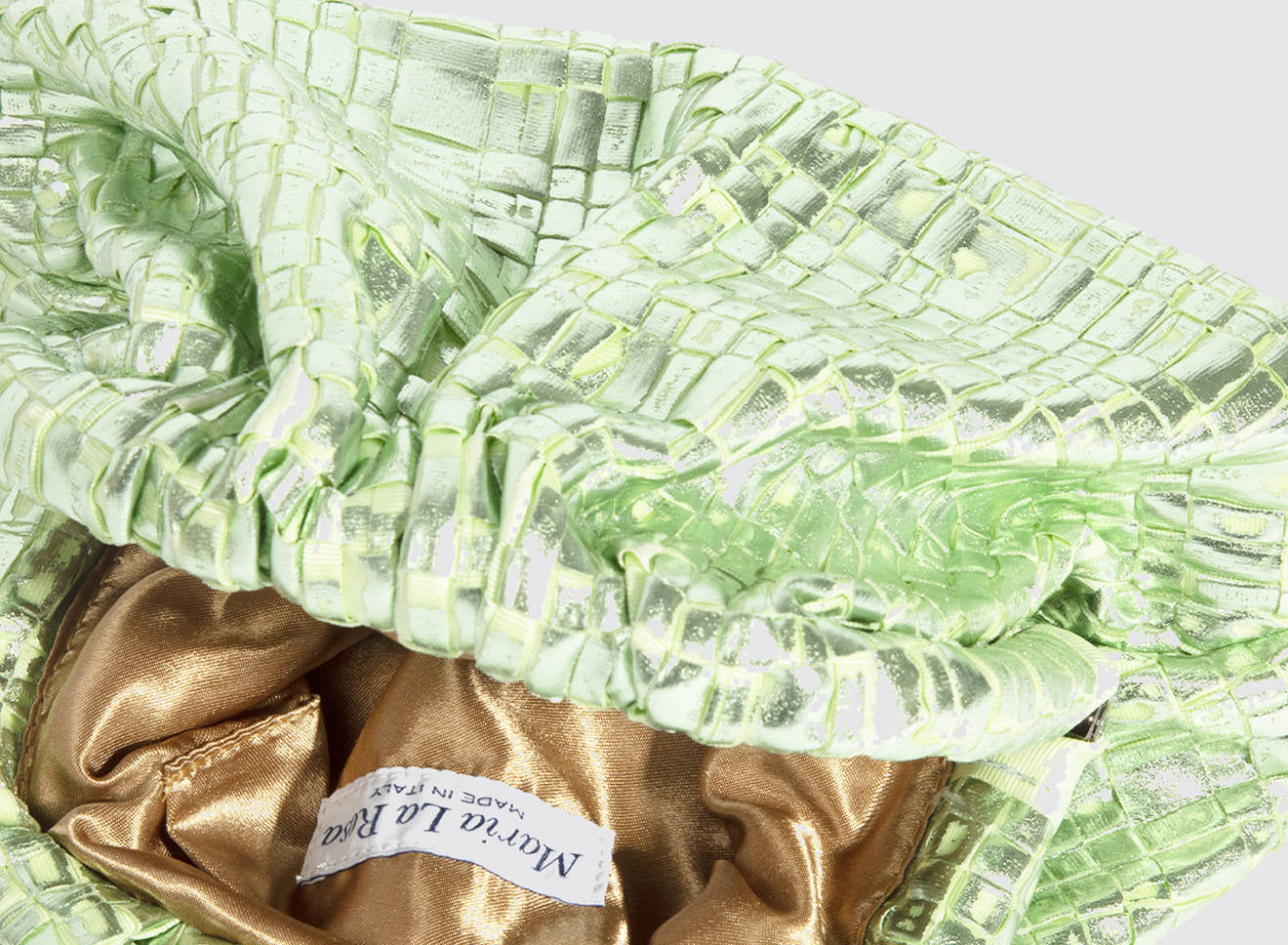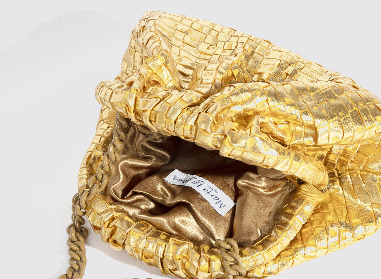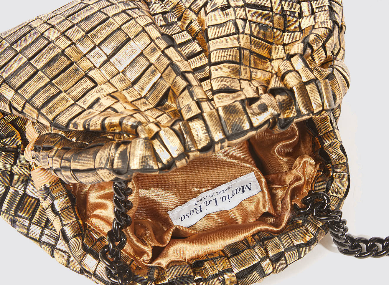 Clutch da donna di piccole dimensioni in tessuto di nastro intrecciato, realizzato a mano su antichi telai. Questo modello costituisce l’icon bag Maria La Rosa, perfetta per tutte le stagioni, emblema di una nuova eleganza metropolitana, che assicura capienza e funzionalità. L’iconica trama intrecciata, in questa nuova versione, è ricoperta di una lamina che risplende di riflessi color oro, turchese, o smeraldo. È dotata di catena abbinata per indossarla anche a tracolla.