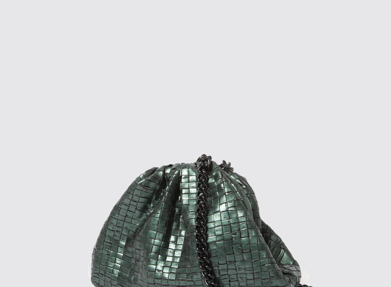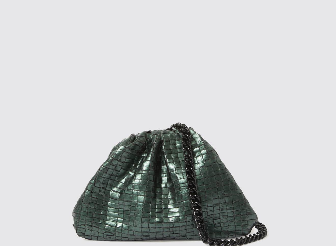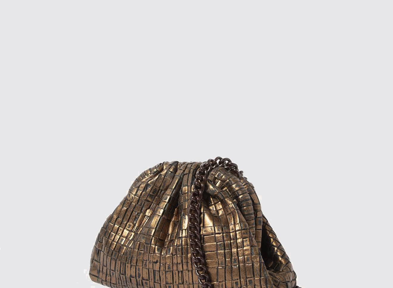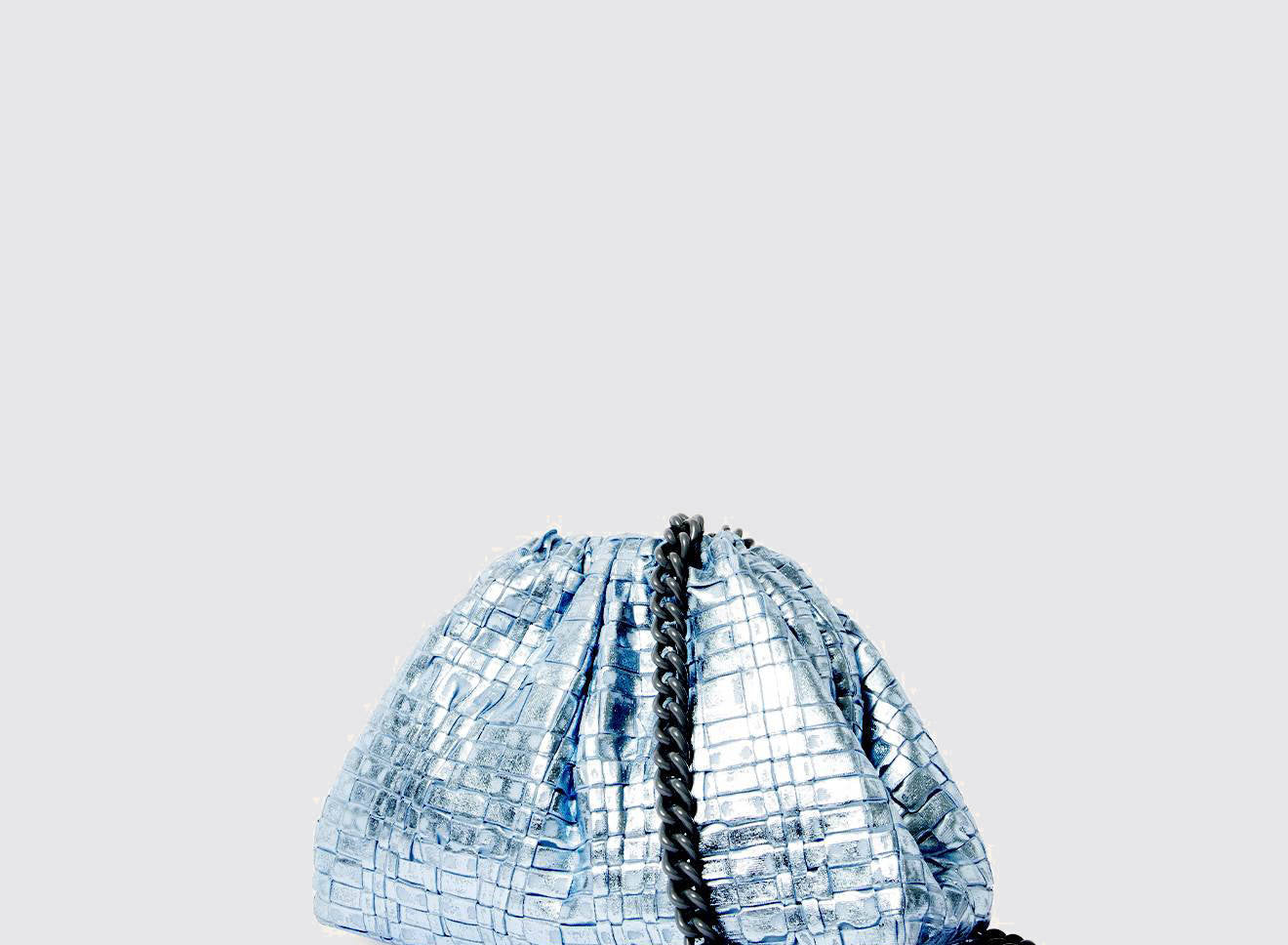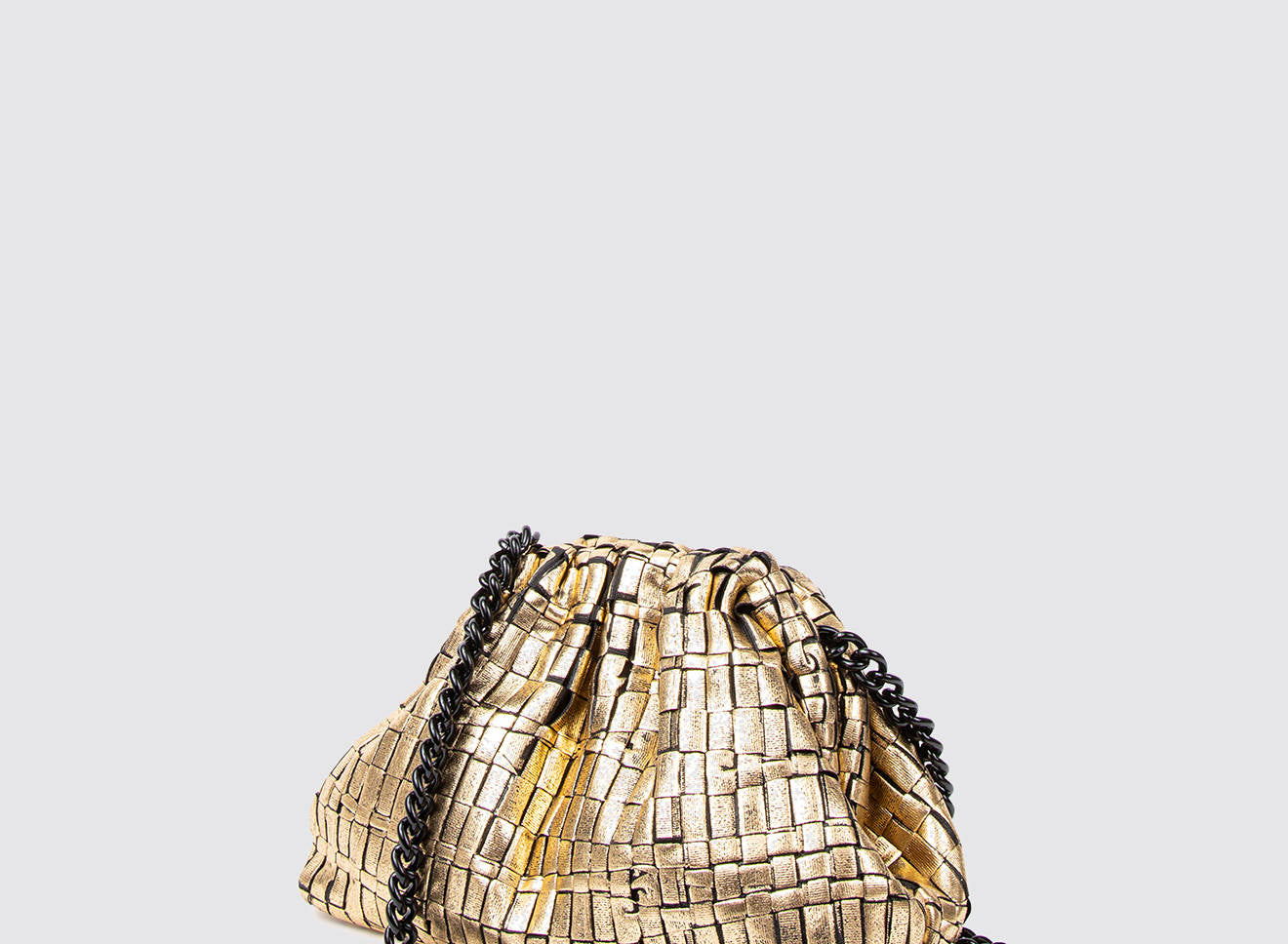 Clutch da donna di piccole dimensioni in tessuto di nastro intrecciato, realizzato a mano su antichi telai. Questo modello costituisce l’icon bag Maria La Rosa, perfetta per tutte le stagioni, emblema di una nuova eleganza metropolitana, che assicura capienza e funzionalità. L’iconica trama intrecciata, in questa nuova versione, è ricoperta di una lamina che risplende di riflessi color oro, turchese, o smeraldo. È dotata di catena abbinata per indossarla anche a tracolla.