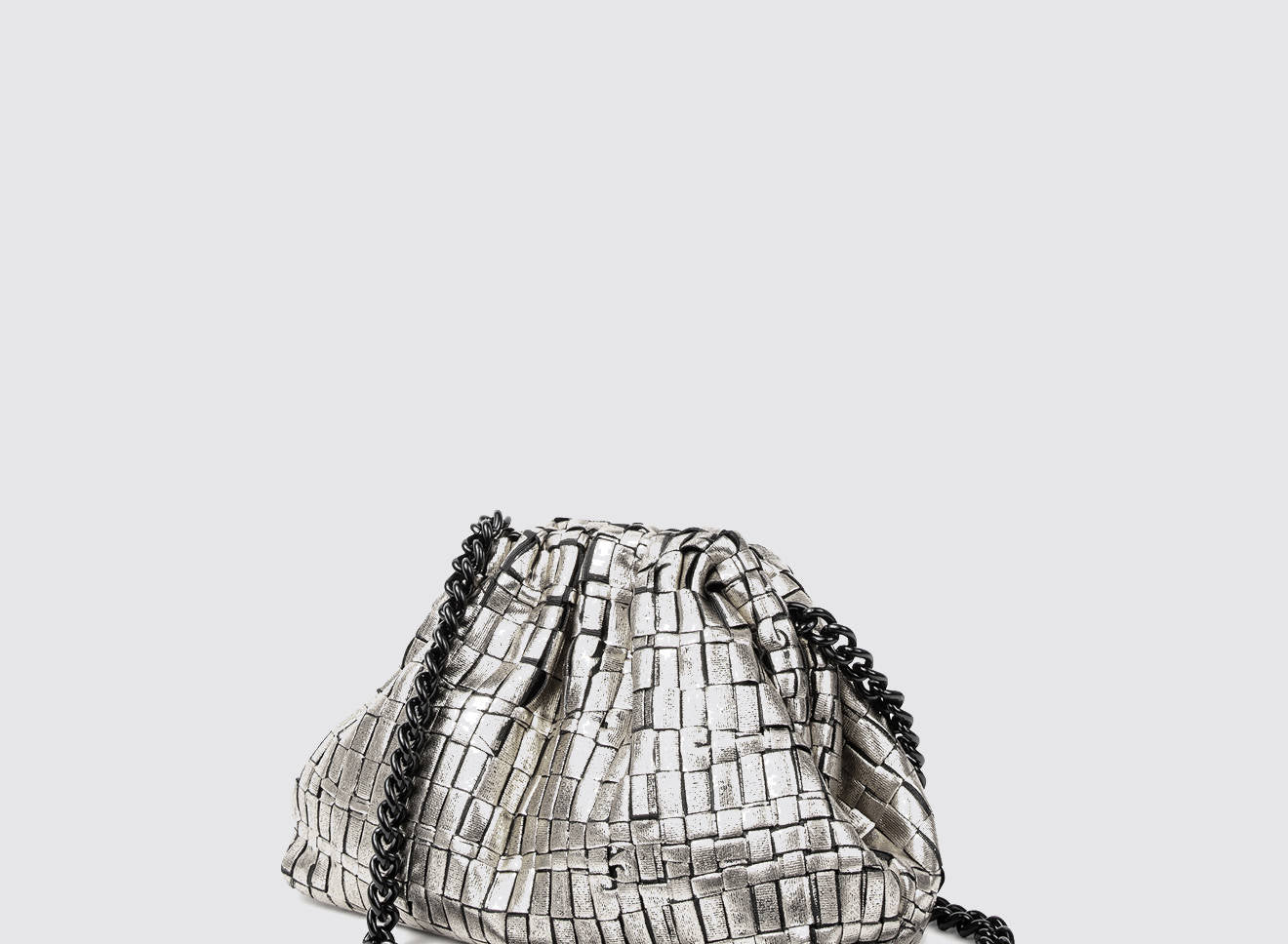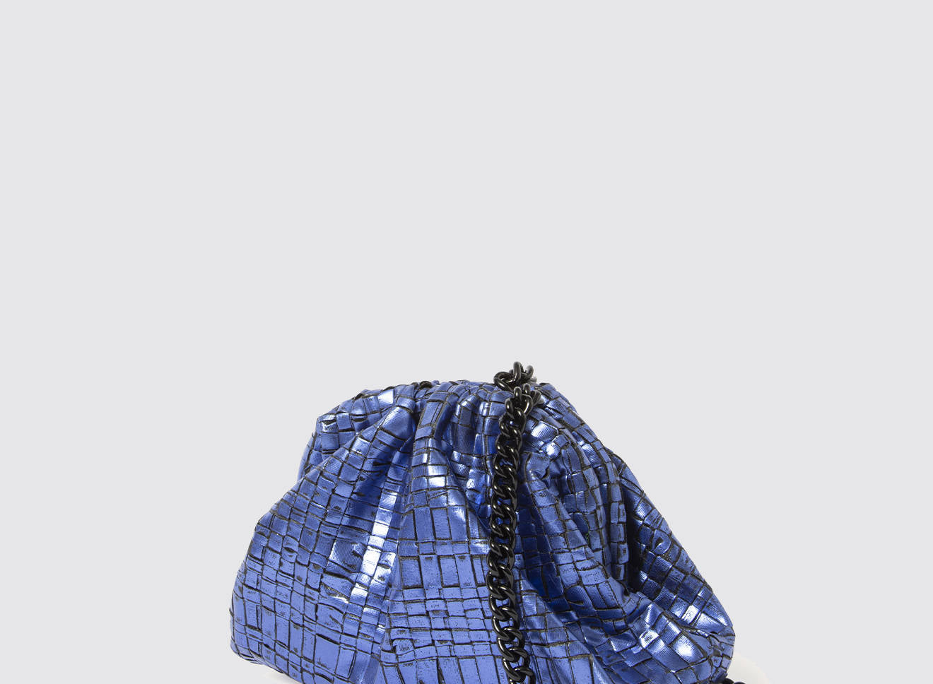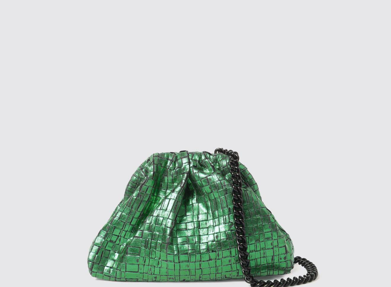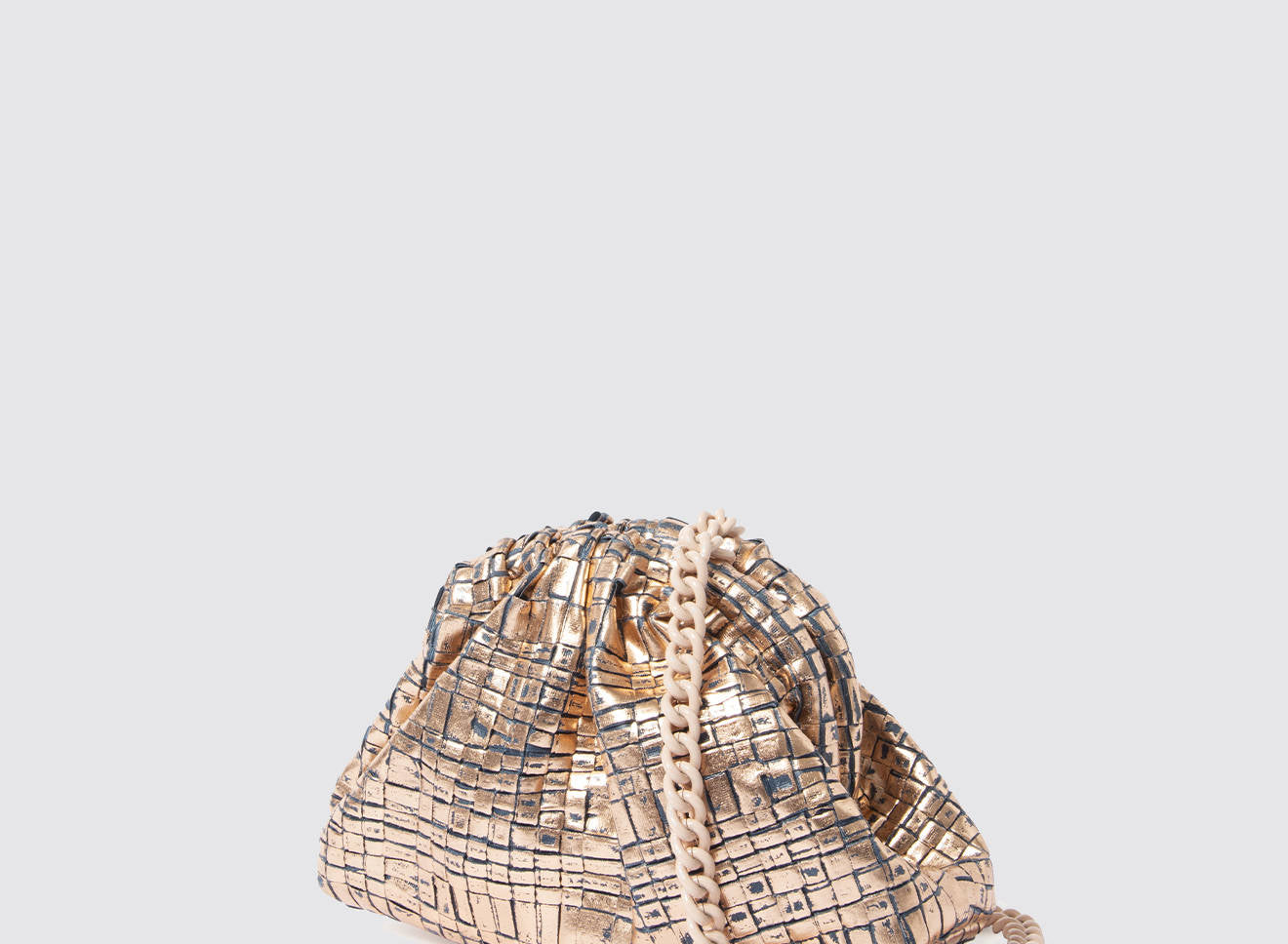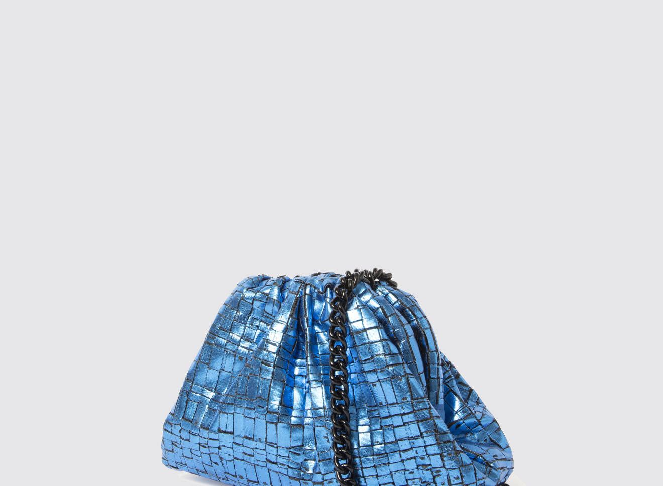 Clutch da donna di piccole dimensioni in tessuto di nastro intrecciato, realizzato a mano su antichi telai. Questo modello costituisce l’icon bag Maria La Rosa, perfetta per tutte le stagioni, emblema di una nuova eleganza metropolitana, che assicura capienza e funzionalità. L’iconica trama intrecciata, in questa nuova versione, è ricoperta di una lamina che risplende di riflessi color oro, turchese, o smeraldo. È dotata di catena abbinata per indossarla anche a tracolla.