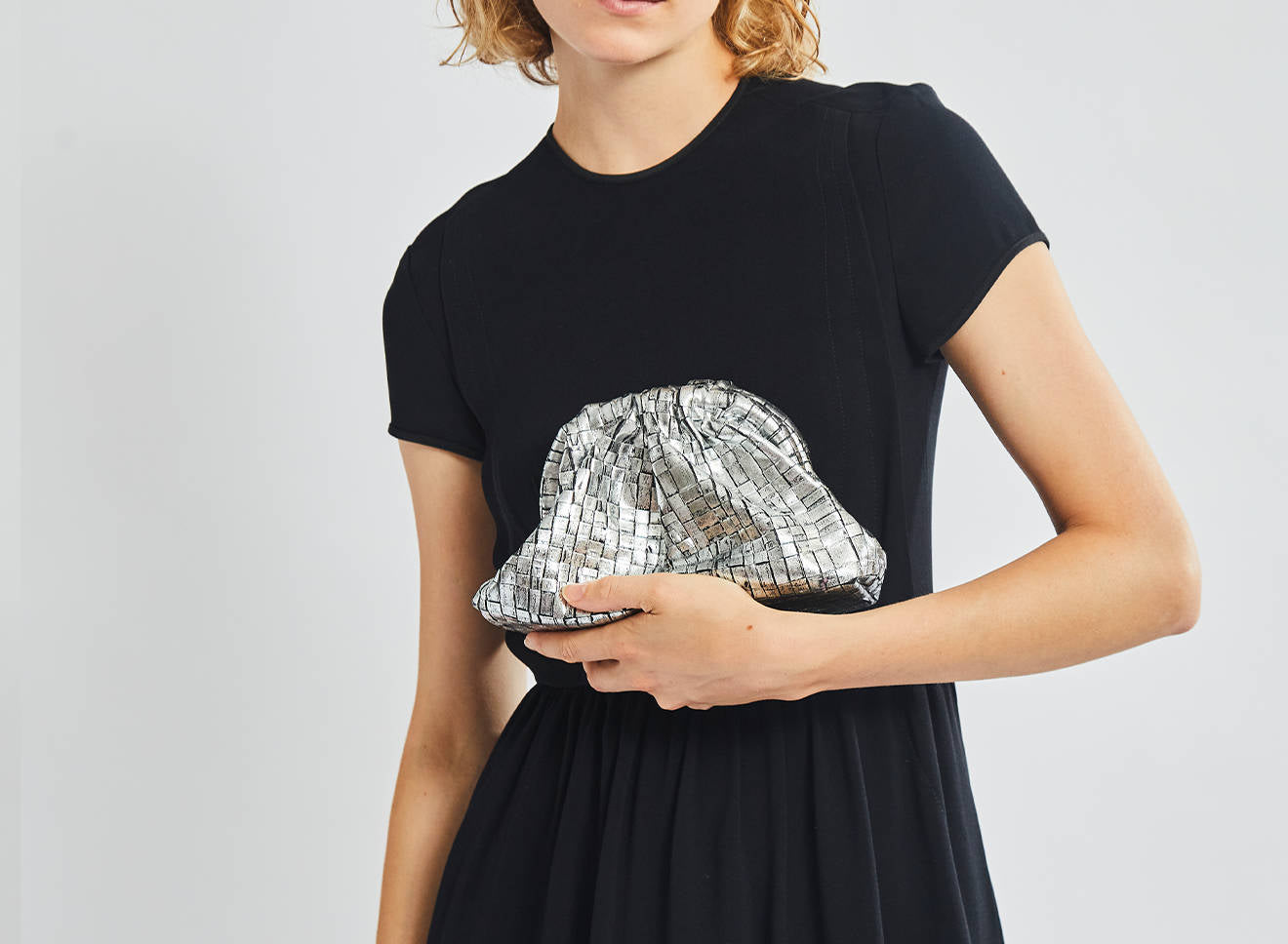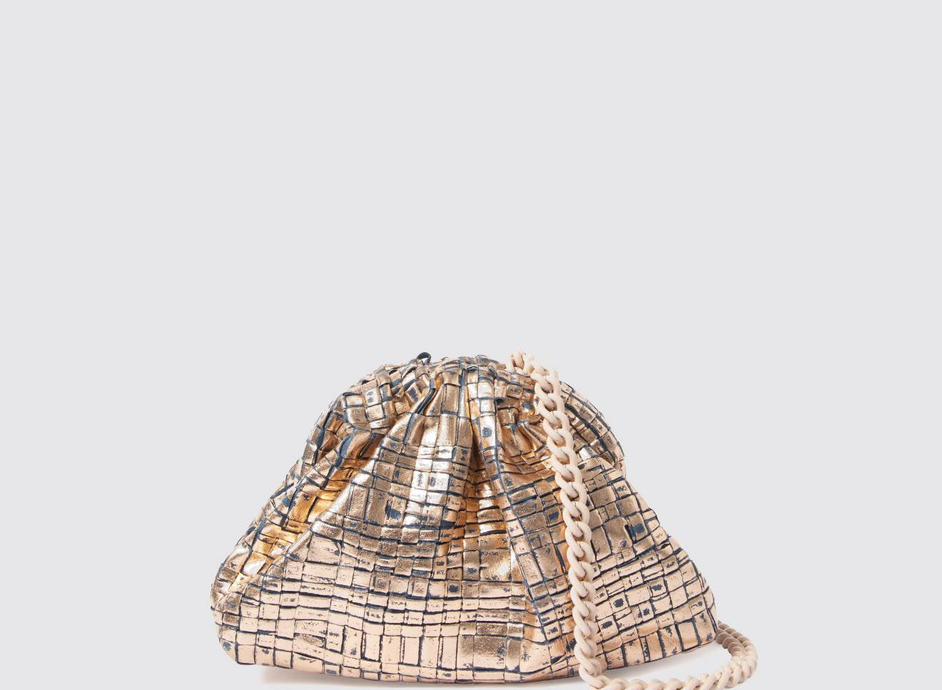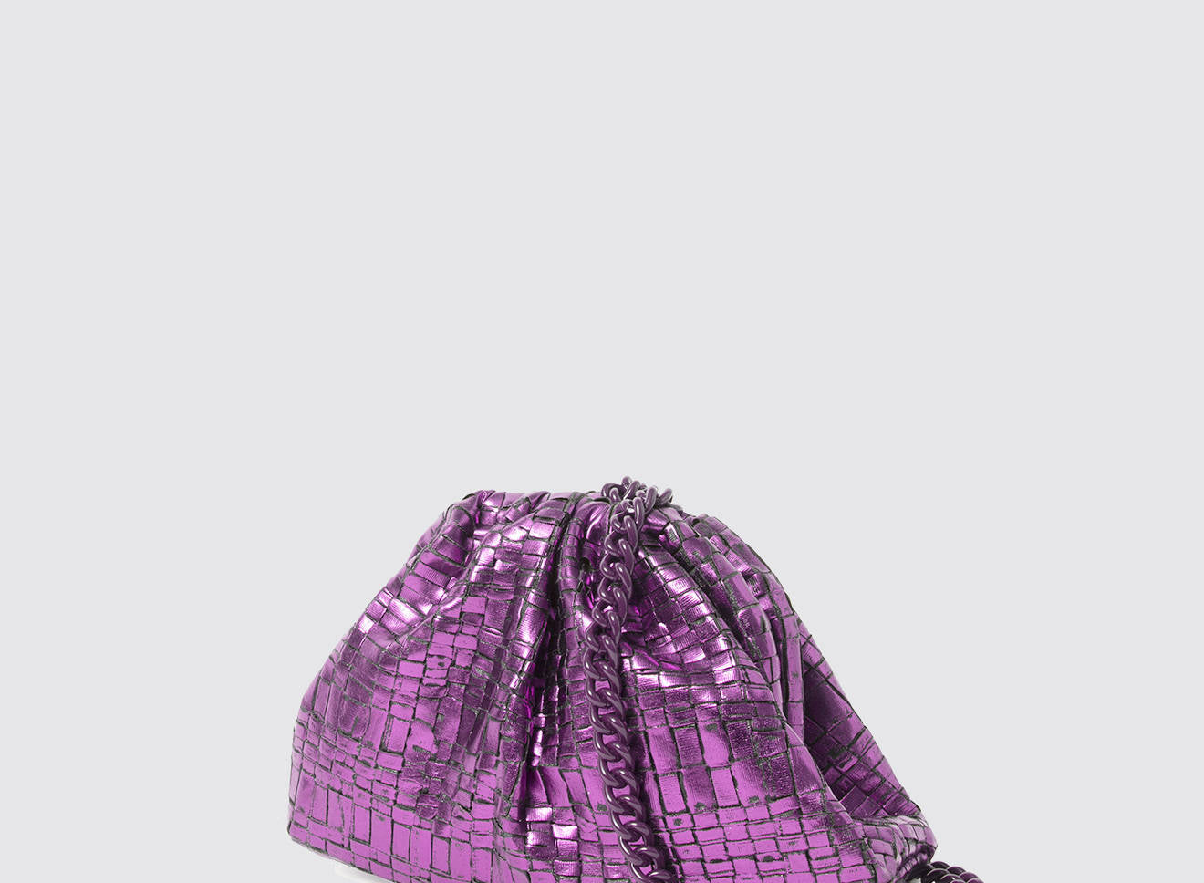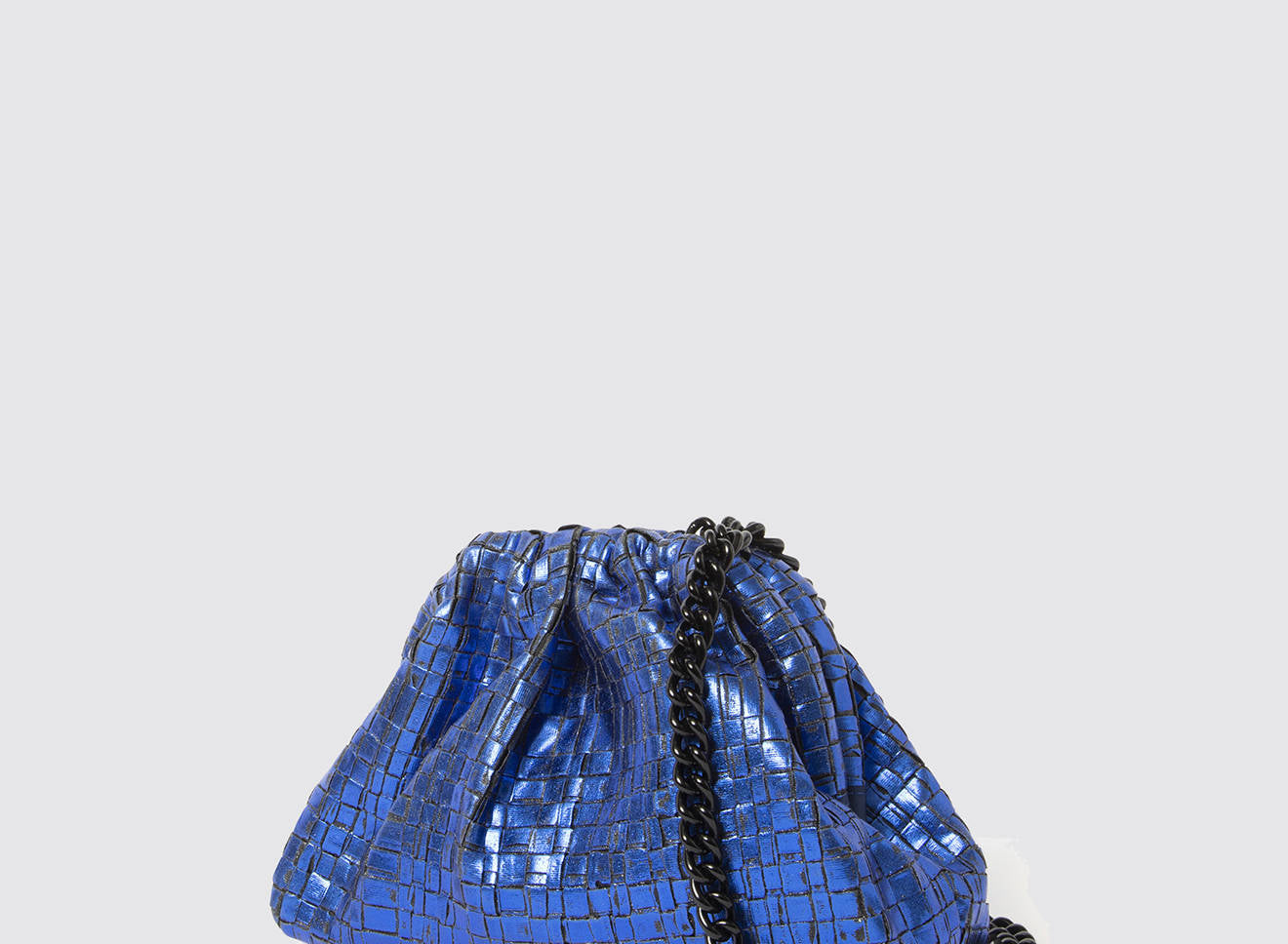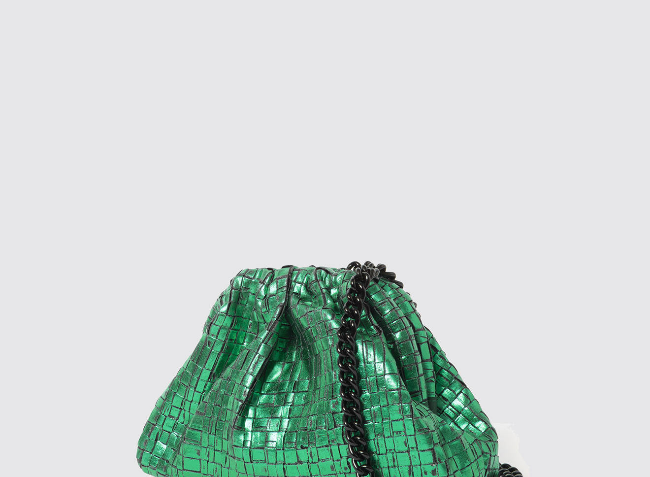 Clutch da donna di piccole dimensioni in tessuto di nastro intrecciato, realizzato a mano su antichi telai. Questo modello costituisce l’icon bag Maria La Rosa, perfetta per tutte le stagioni, emblema di una nuova eleganza metropolitana, che assicura capienza e funzionalità. L’iconica trama intrecciata, in questa nuova versione, è ricoperta di una lamina che risplende di riflessi color oro, turchese, o smeraldo. È dotata di catena abbinata per indossarla anche a tracolla.