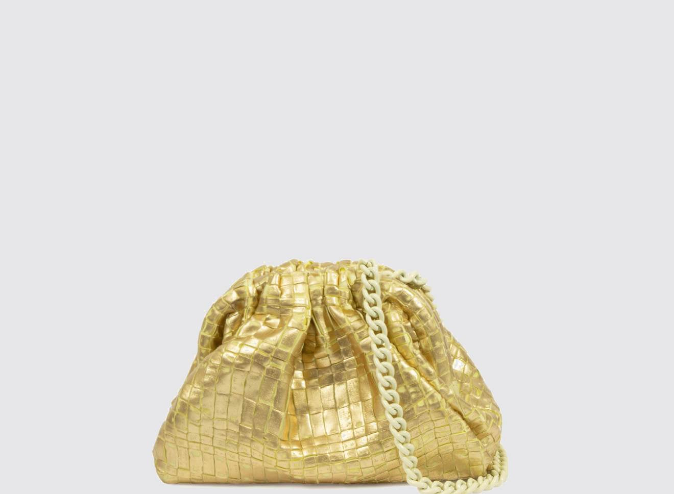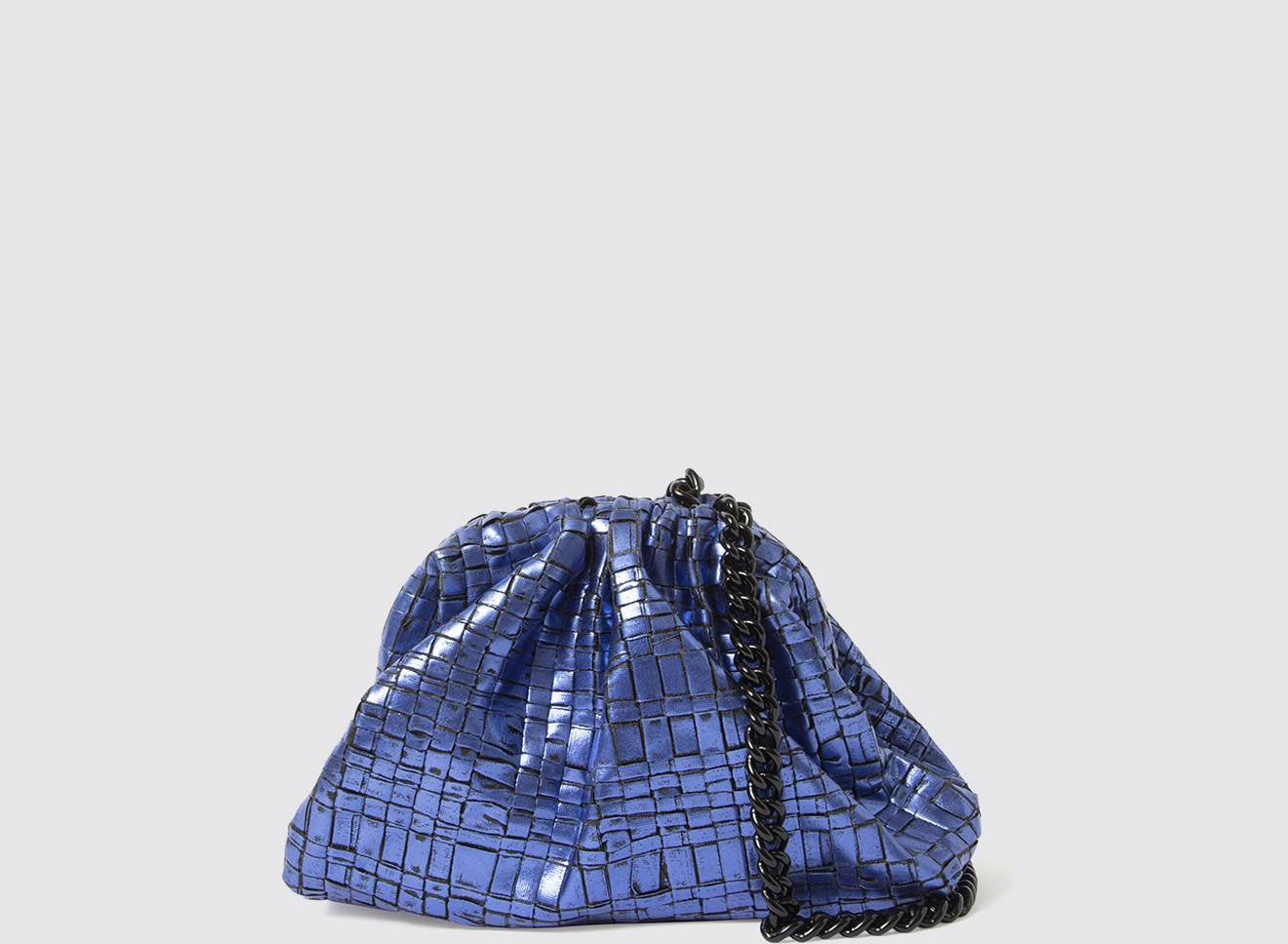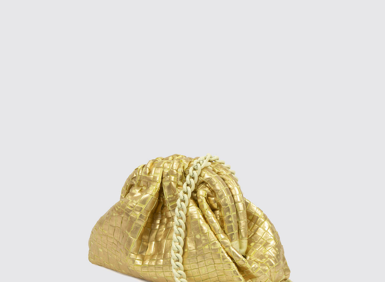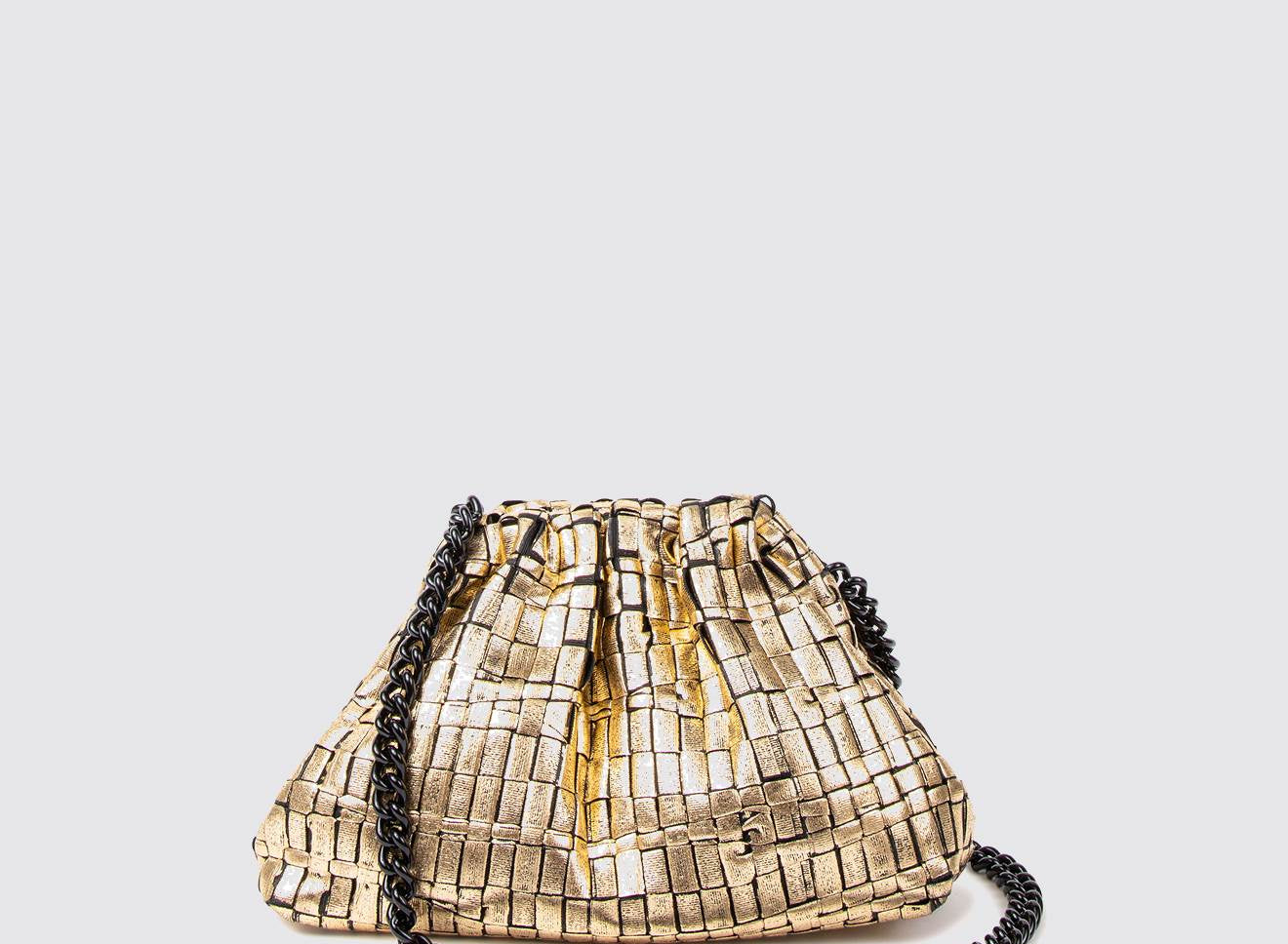 Clutch da donna di piccole dimensioni in tessuto di nastro intrecciato, realizzato a mano su antichi telai. Questo modello costituisce l’icon bag Maria La Rosa, perfetta per tutte le stagioni, emblema di una nuova eleganza metropolitana, che assicura capienza e funzionalità. L’iconica trama intrecciata, in questa nuova versione, è ricoperta di una lamina che risplende di riflessi color oro, turchese, o smeraldo. È dotata di catena abbinata per indossarla anche a tracolla.
