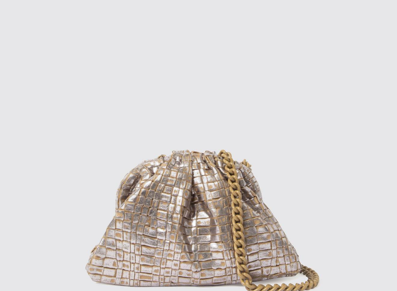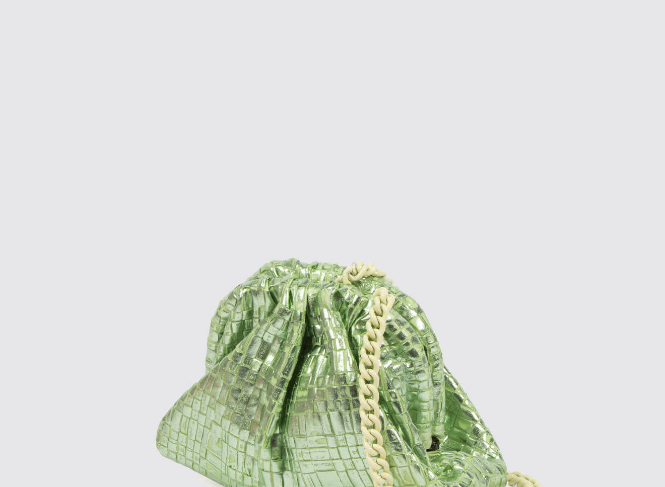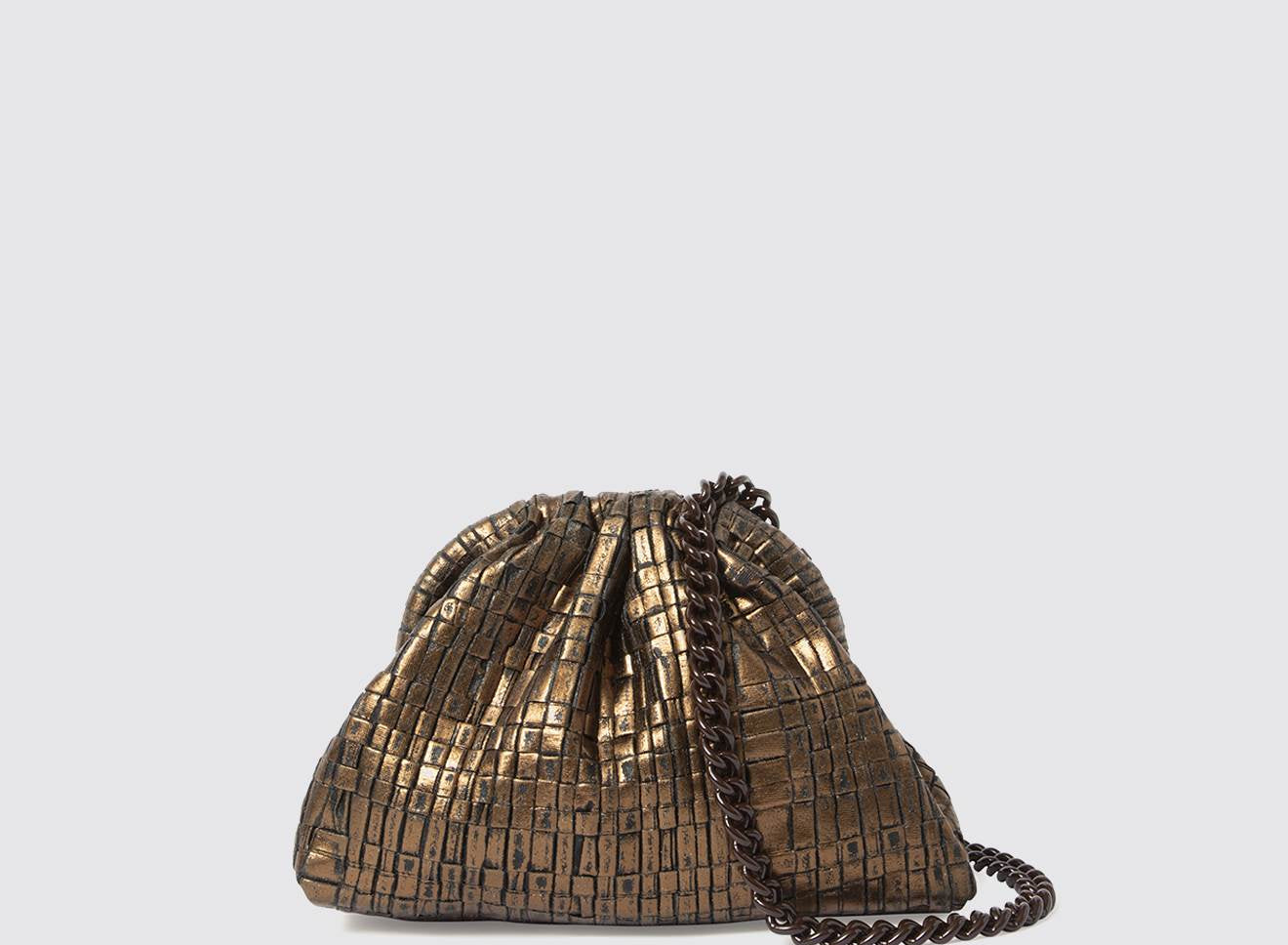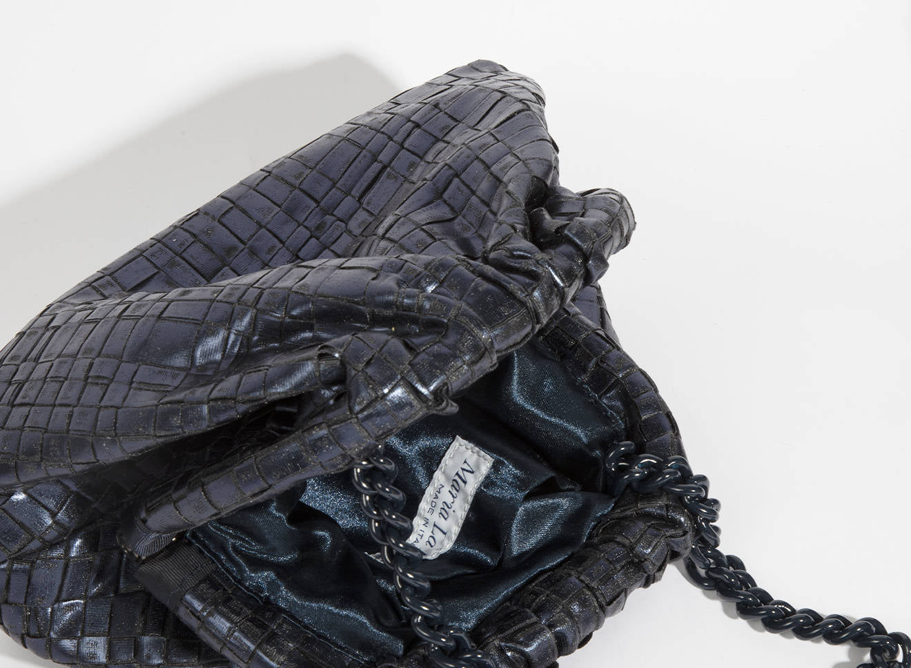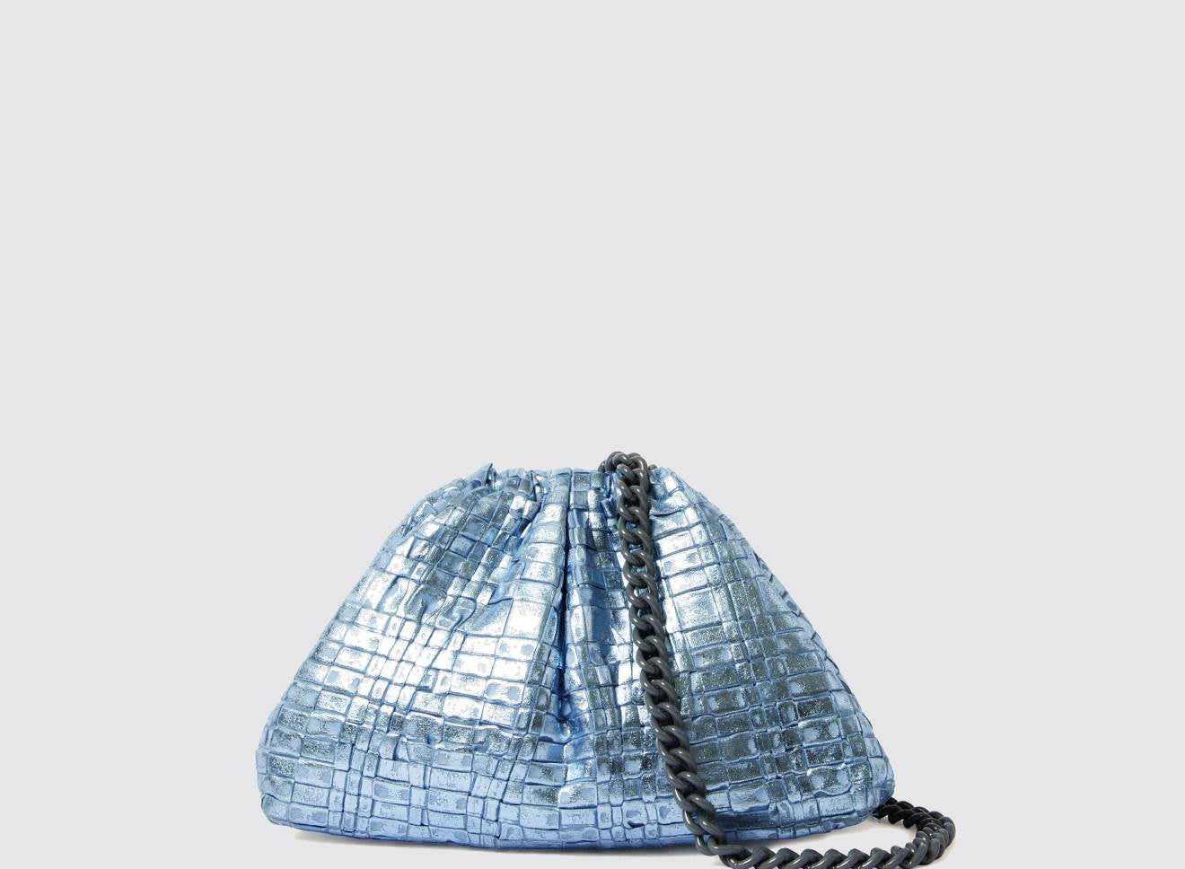 Clutch da donna di piccole dimensioni in tessuto di nastro intrecciato, realizzato a mano su antichi telai. Questo modello costituisce l’icon bag Maria La Rosa, perfetta per tutte le stagioni, emblema di una nuova eleganza metropolitana, che assicura capienza e funzionalità. L’iconica trama intrecciata, in questa nuova versione, è ricoperta di una lamina che risplende di riflessi color oro, turchese, o smeraldo. È dotata di catena abbinata per indossarla anche a tracolla.