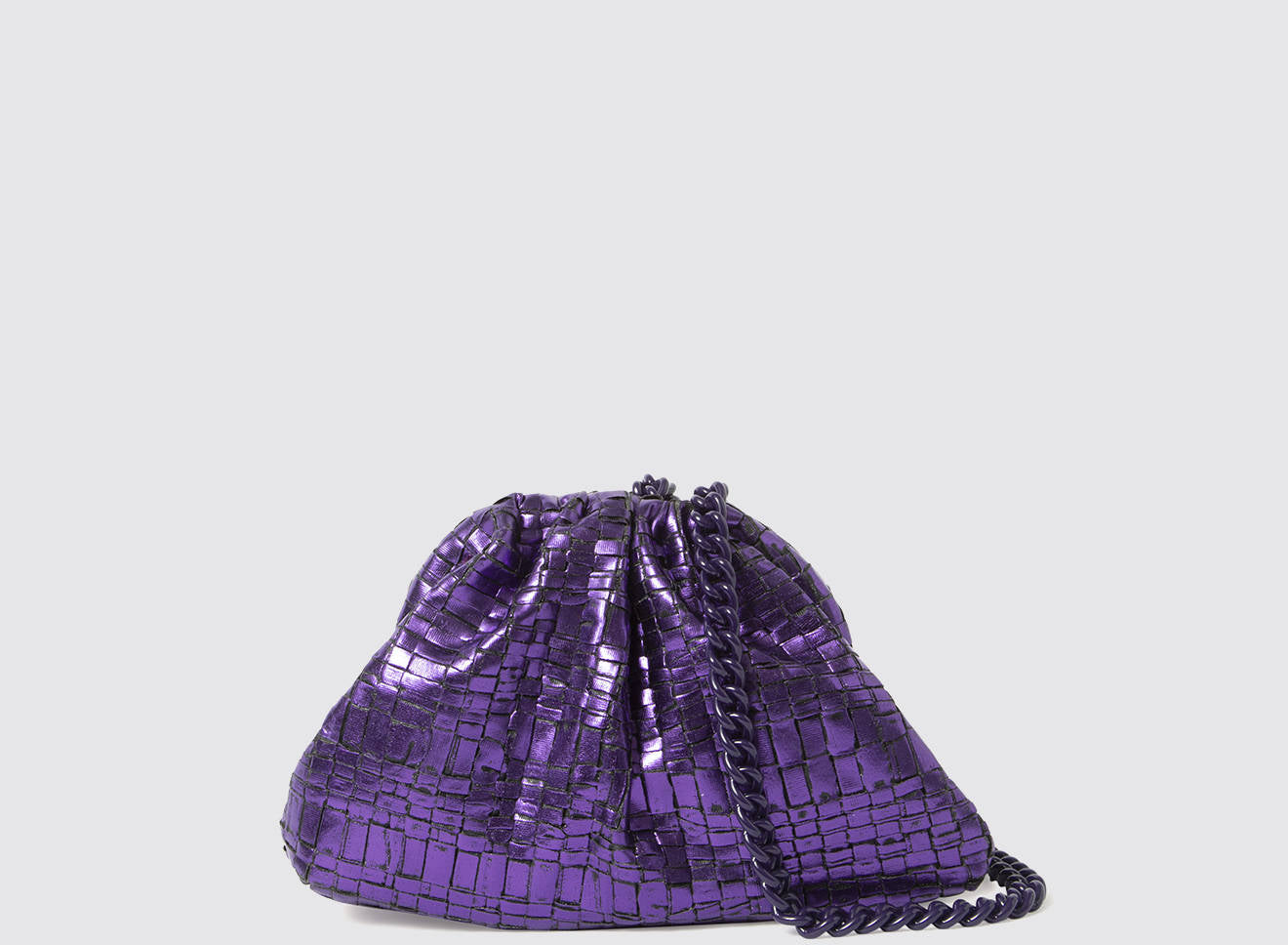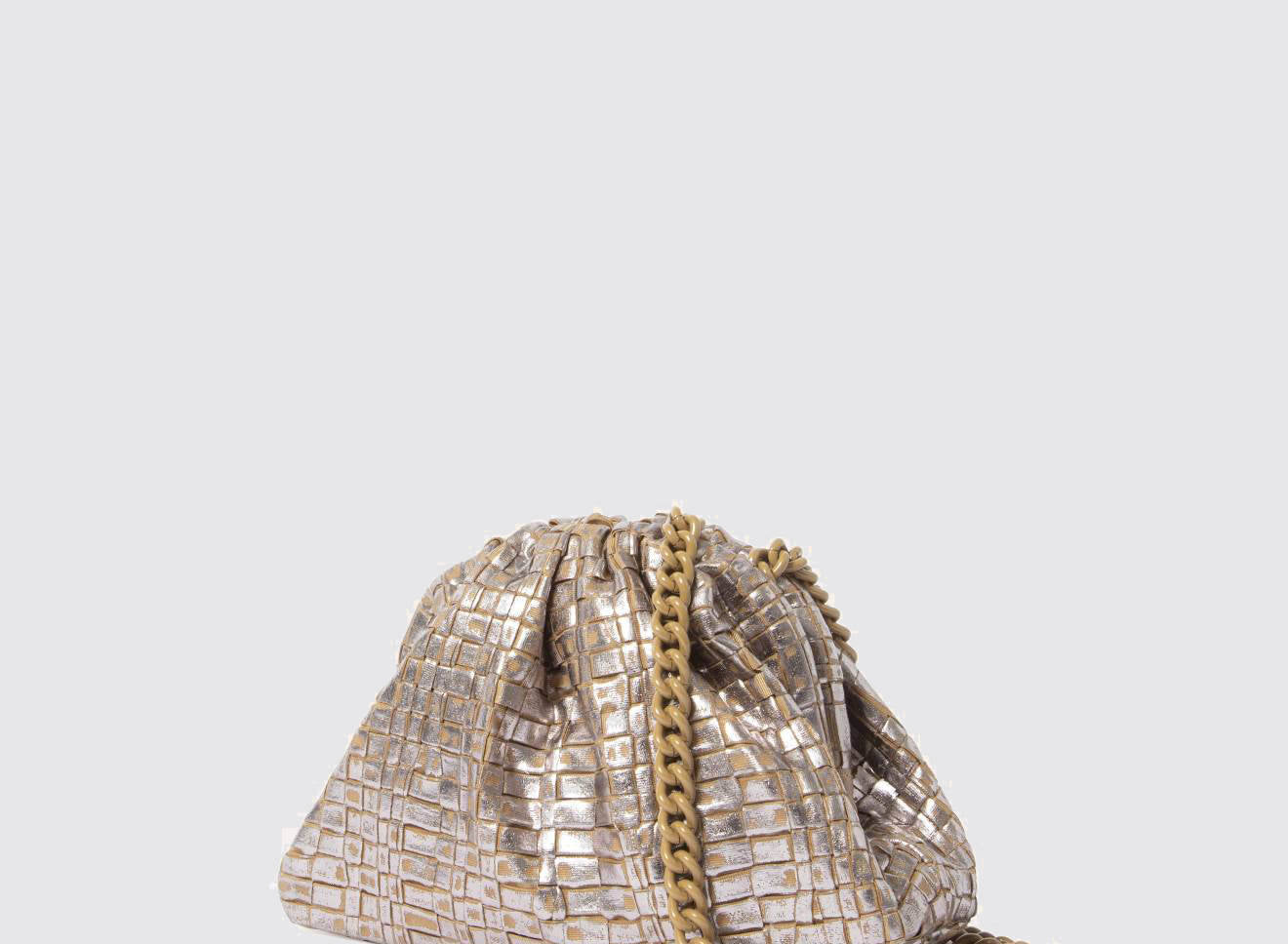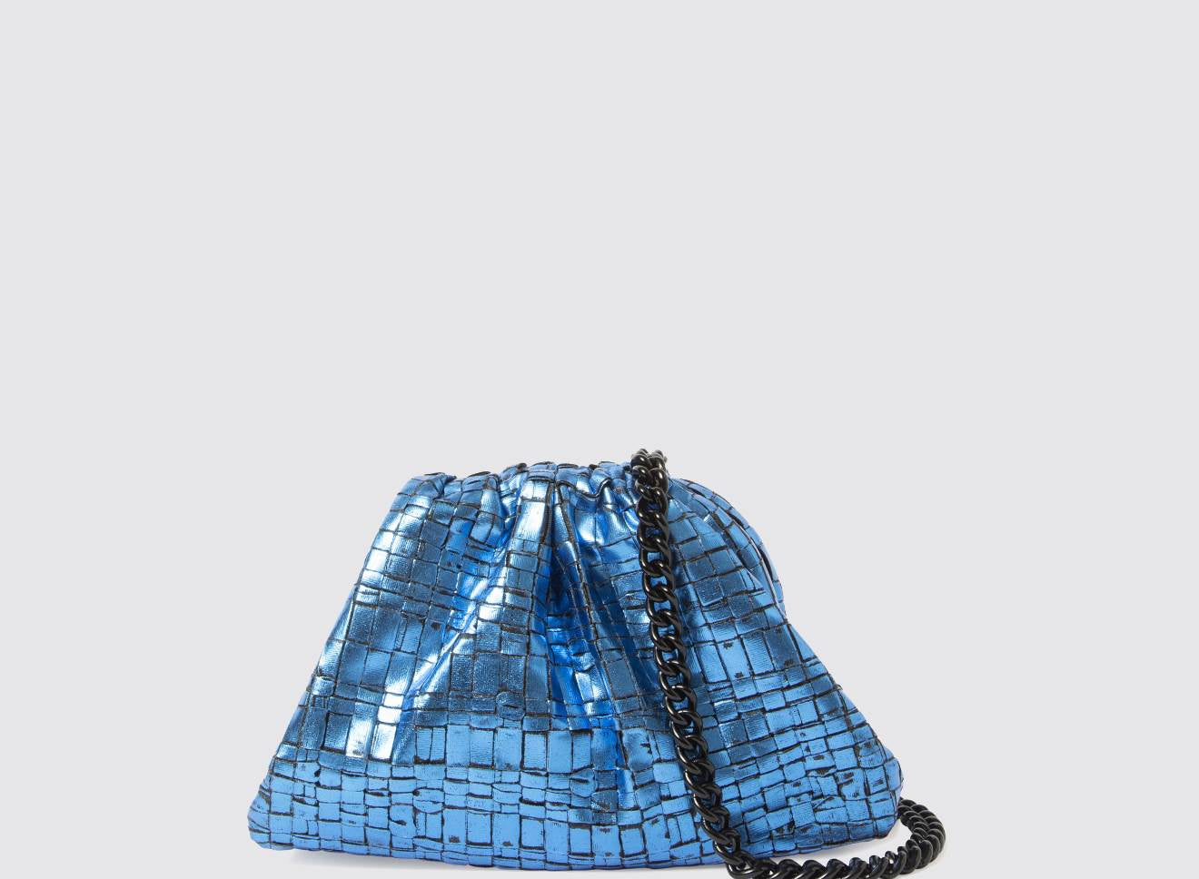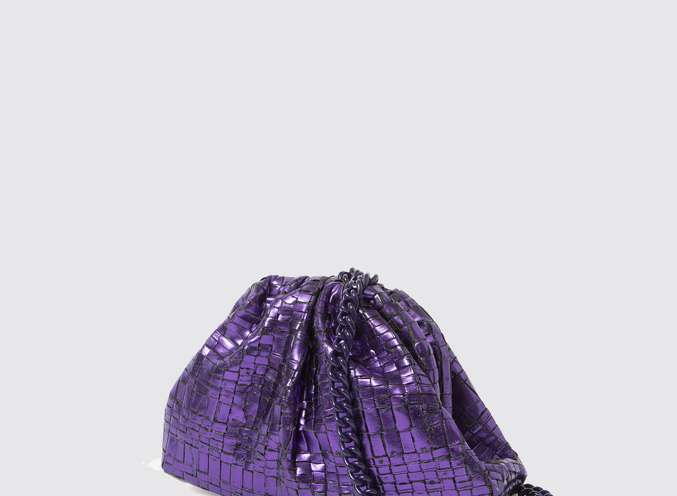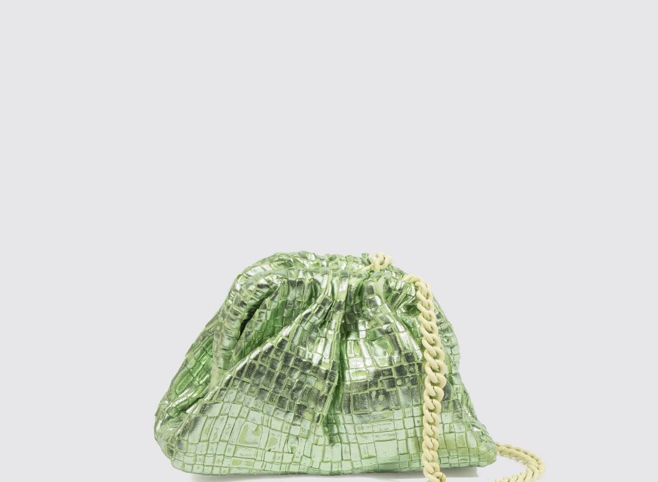 Clutch da donna di piccole dimensioni in tessuto di nastro intrecciato, realizzato a mano su antichi telai. Questo modello costituisce l’icon bag Maria La Rosa, perfetta per tutte le stagioni, emblema di una nuova eleganza metropolitana, che assicura capienza e funzionalità. L’iconica trama intrecciata, in questa nuova versione, è ricoperta di una lamina che risplende di riflessi color oro, turchese, o smeraldo. È dotata di catena abbinata per indossarla anche a tracolla.