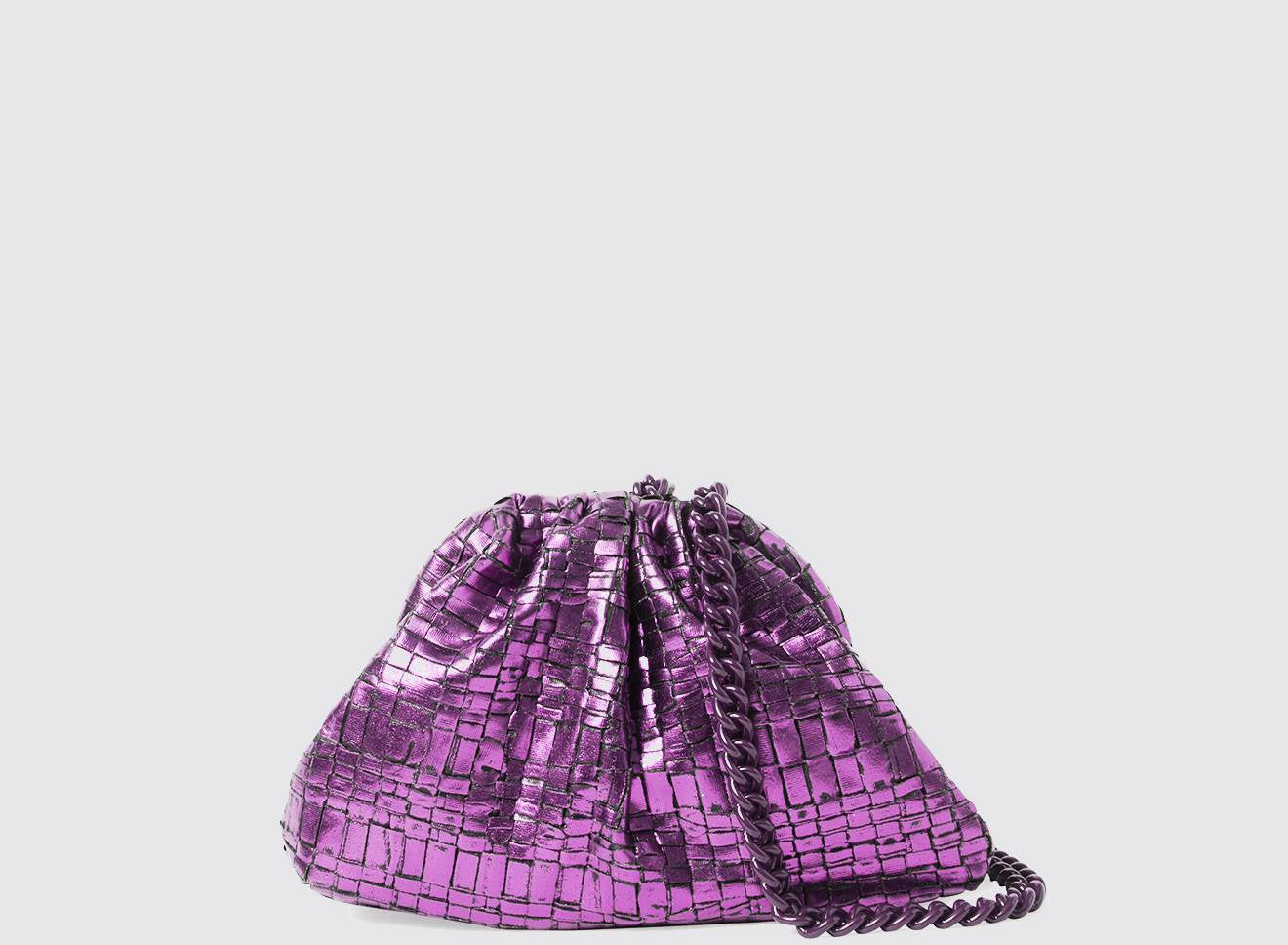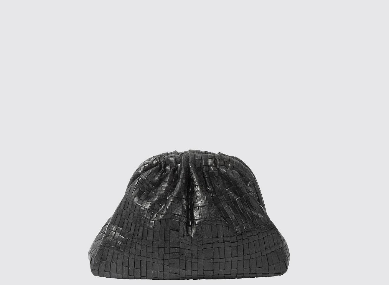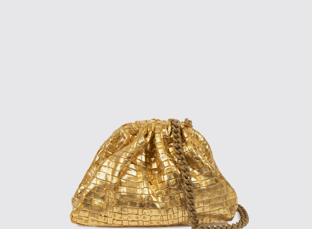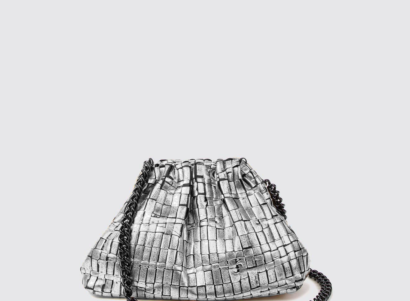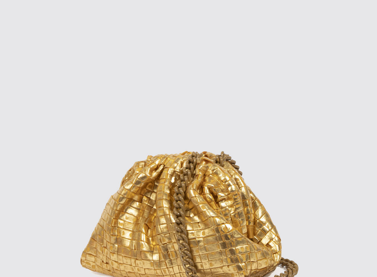 Clutch da donna di piccole dimensioni in tessuto di nastro intrecciato, realizzato a mano su antichi telai. Questo modello costituisce l’icon bag Maria La Rosa, perfetta per tutte le stagioni, emblema di una nuova eleganza metropolitana, che assicura capienza e funzionalità. L’iconica trama intrecciata, in questa nuova versione, è ricoperta di una lamina che risplende di riflessi color oro, turchese, o smeraldo. È dotata di catena abbinata per indossarla anche a tracolla.