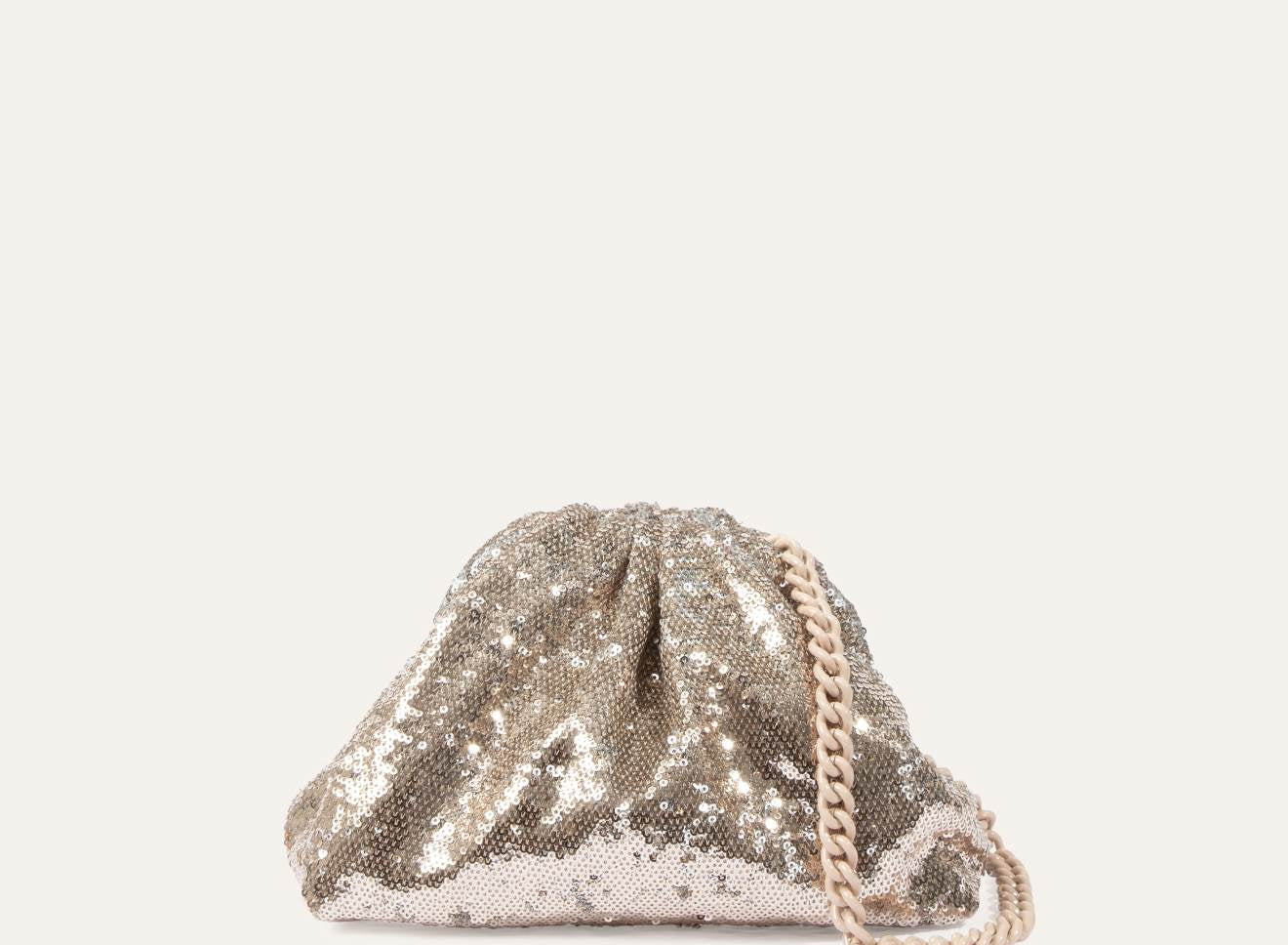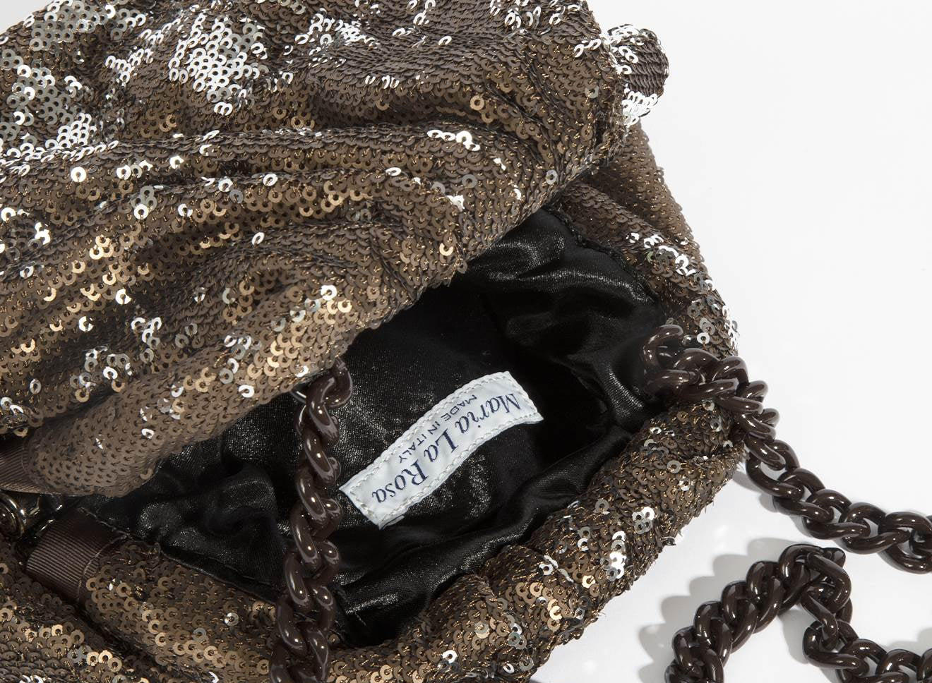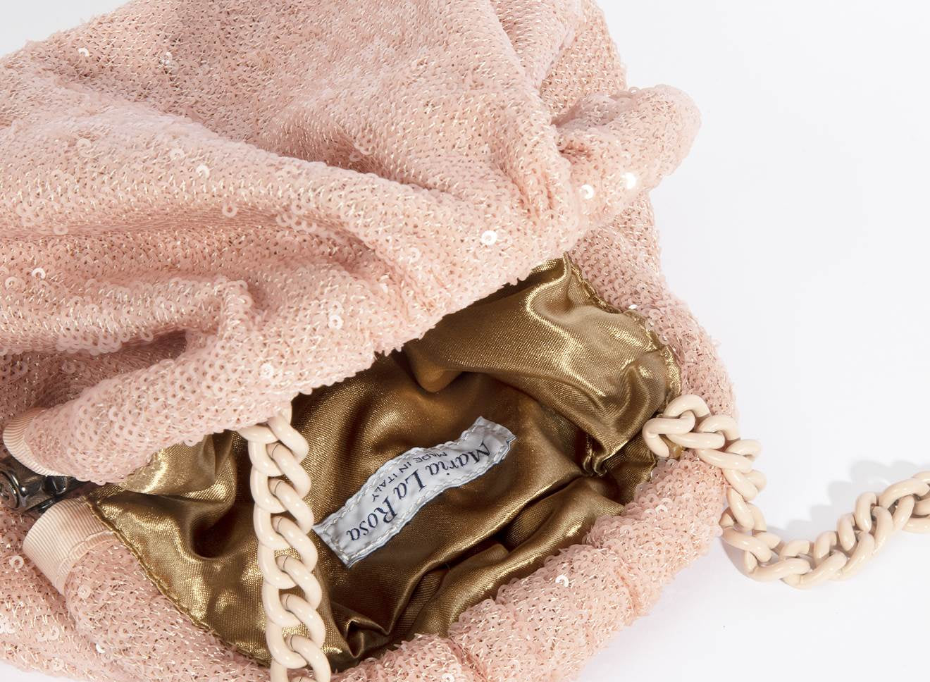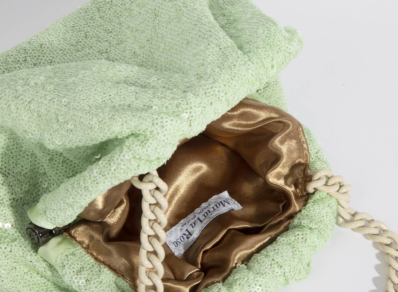 Clutch da donna di piccole dimensioni realizzata in tessuto paillettes. Questo modello costituisce l’icon bag Maria La Rosa, perfetta per tutte le stagioni, emblema di una nuova eleganza metropolitana, che assicura capienza e funzionalità. Il tessuto in paillettes le conferisce una lucente eleganza, disponibile in molteplici varianti colore. È dotata di catena abbinata per indossarla anche a tracolla.