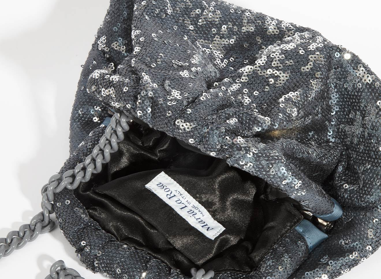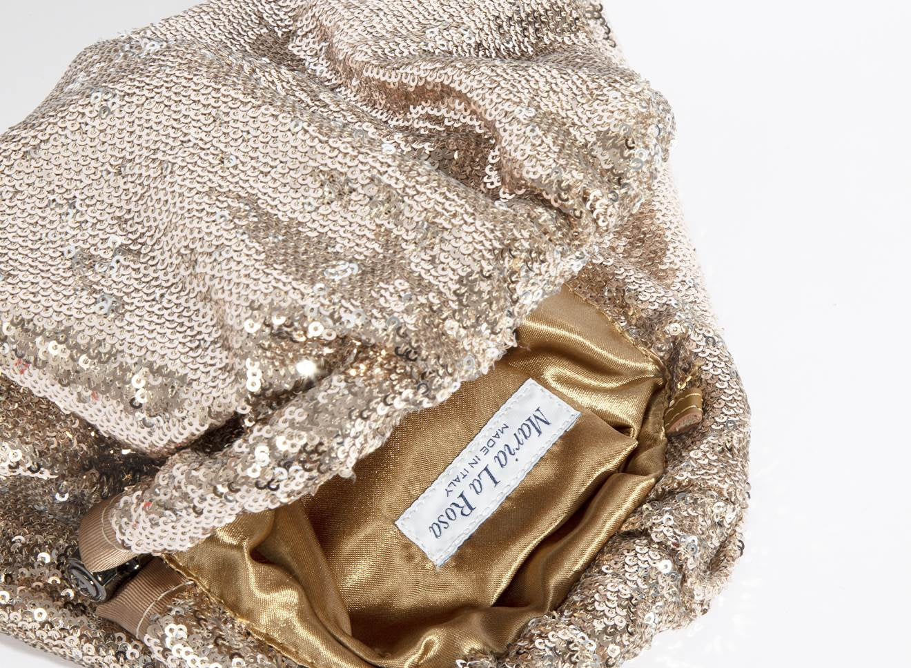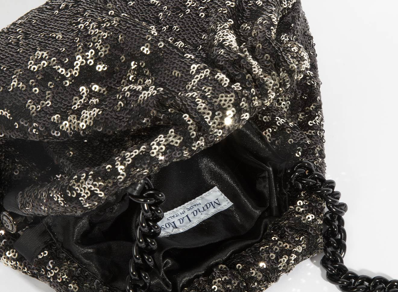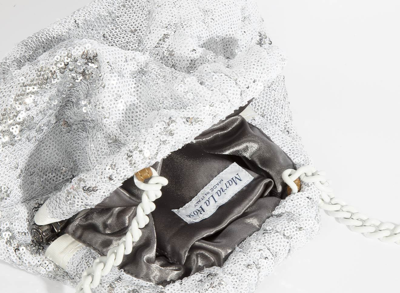 Clutch da donna di piccole dimensioni realizzata in tessuto paillettes. Questo modello costituisce l’icon bag Maria La Rosa, perfetta per tutte le stagioni, emblema di una nuova eleganza metropolitana, che assicura capienza e funzionalità. Il tessuto in paillettes le conferisce una lucente eleganza, disponibile in molteplici varianti colore. È dotata di catena abbinata per indossarla anche a tracolla.