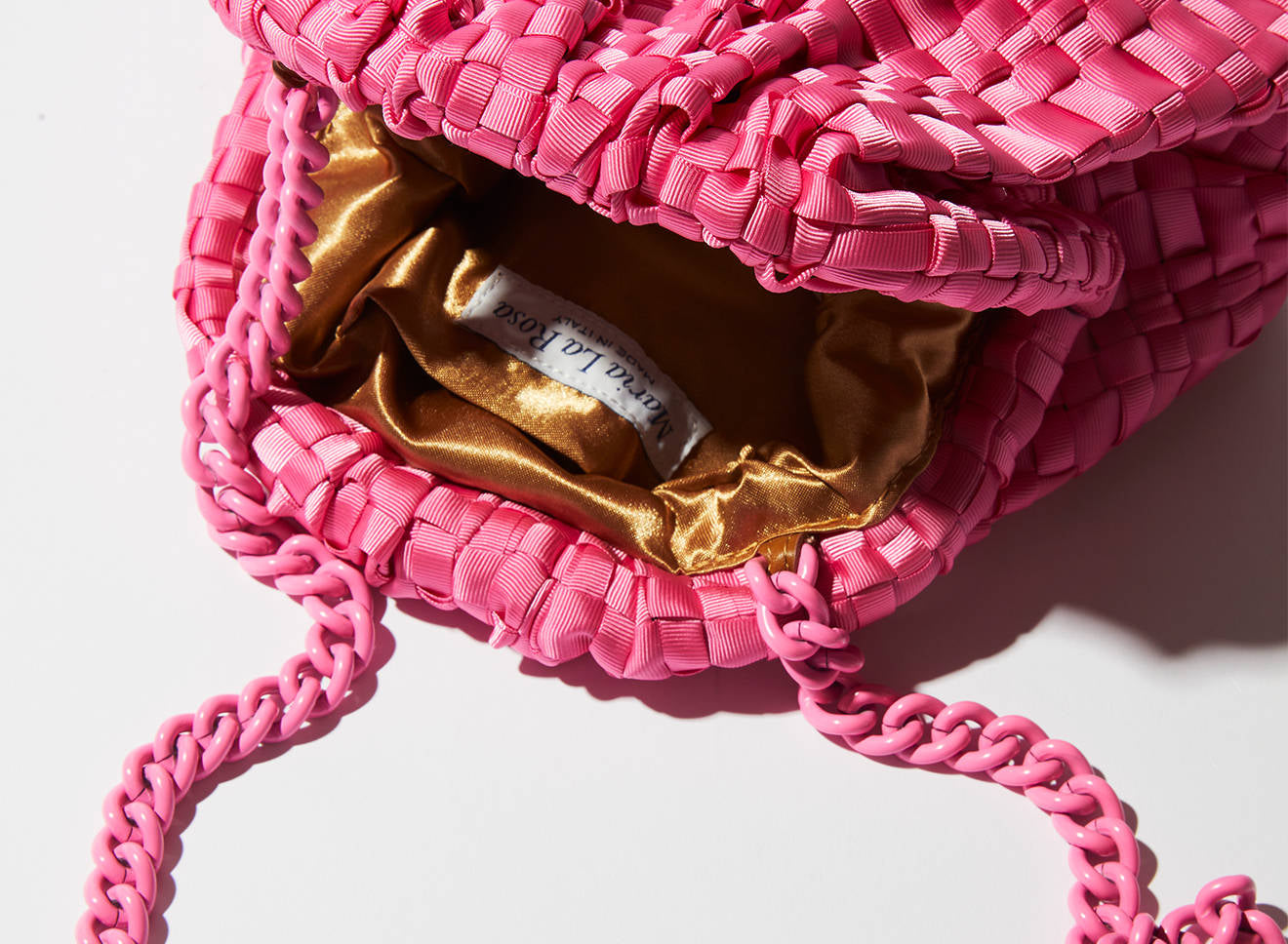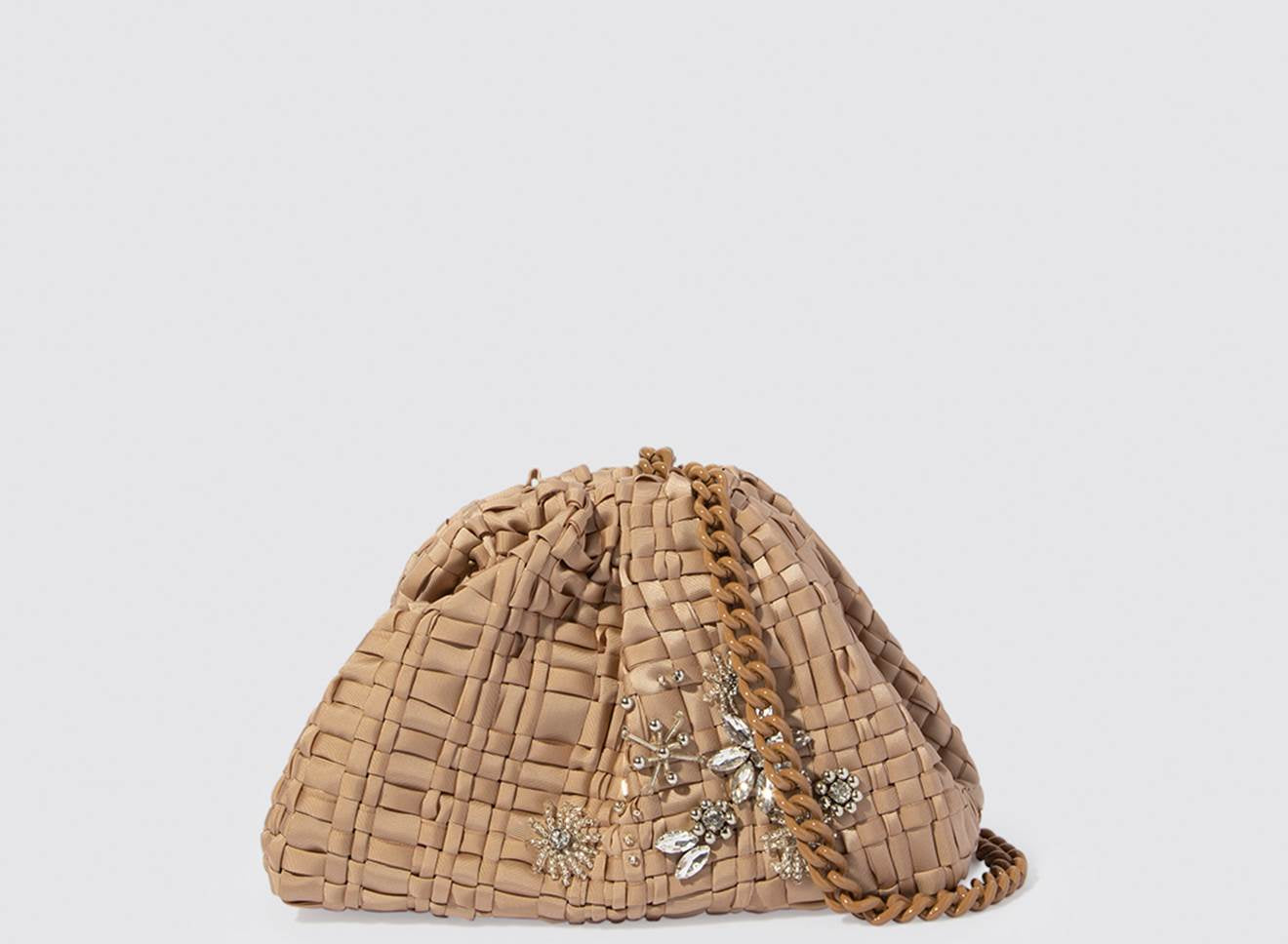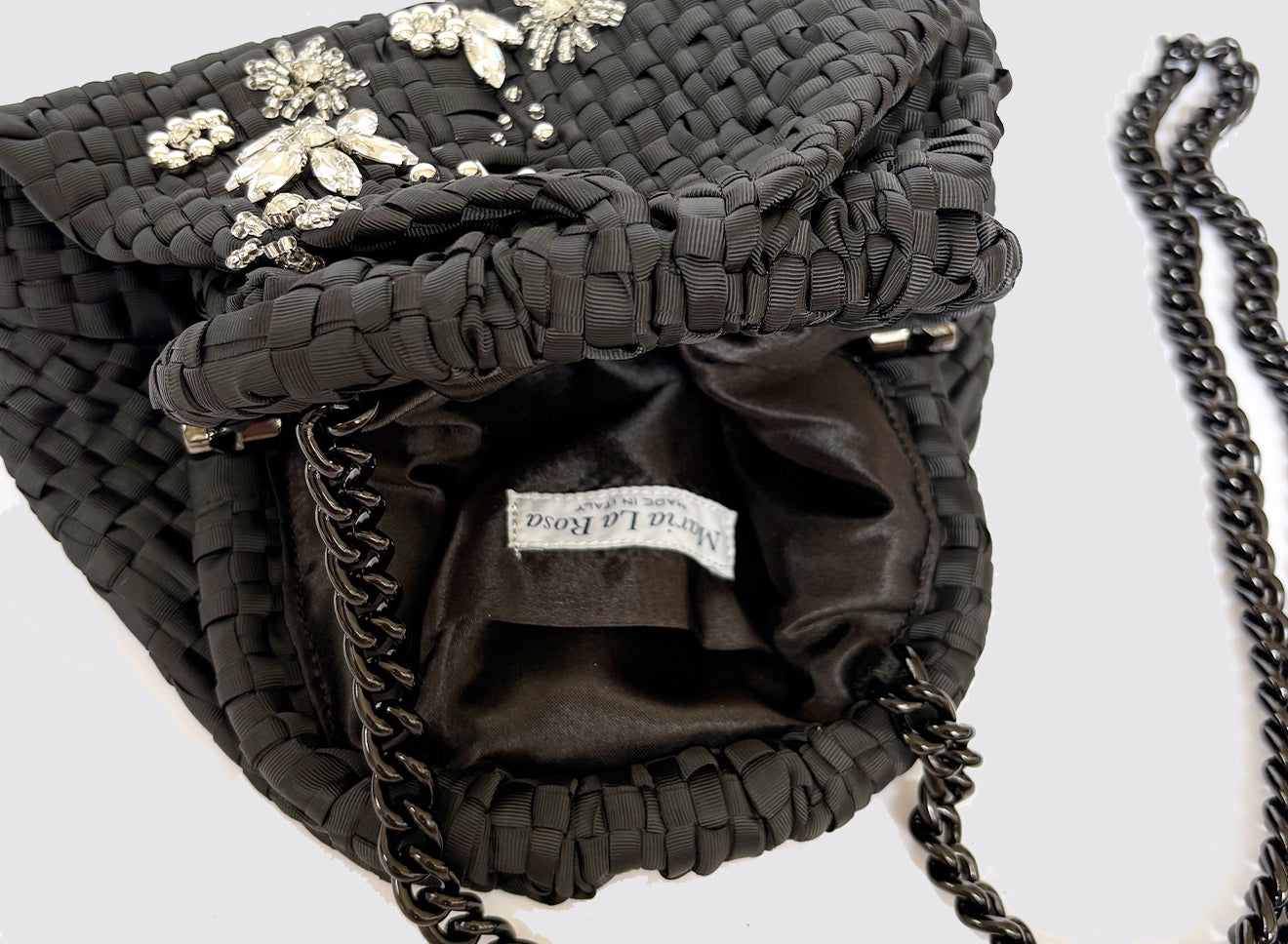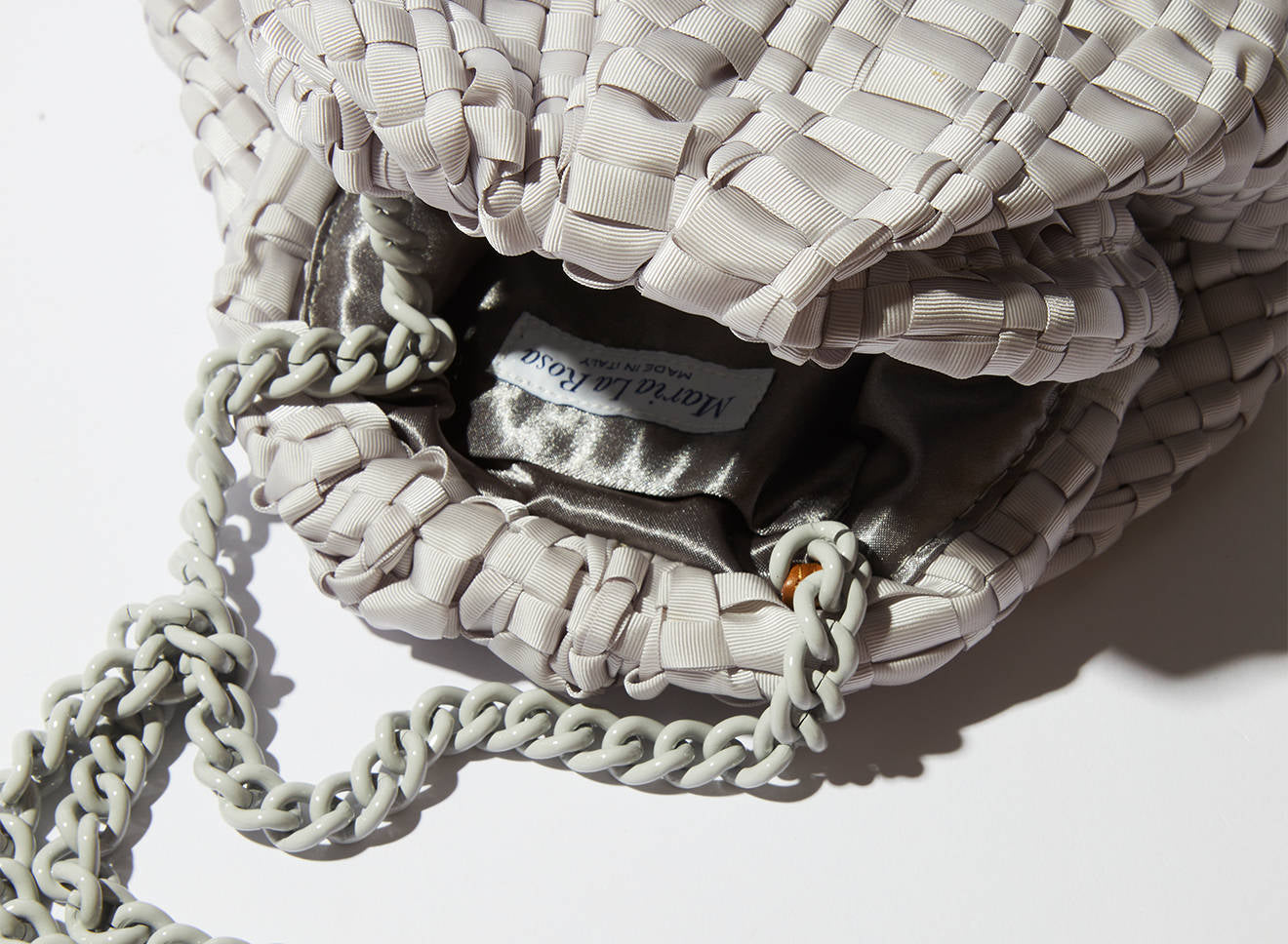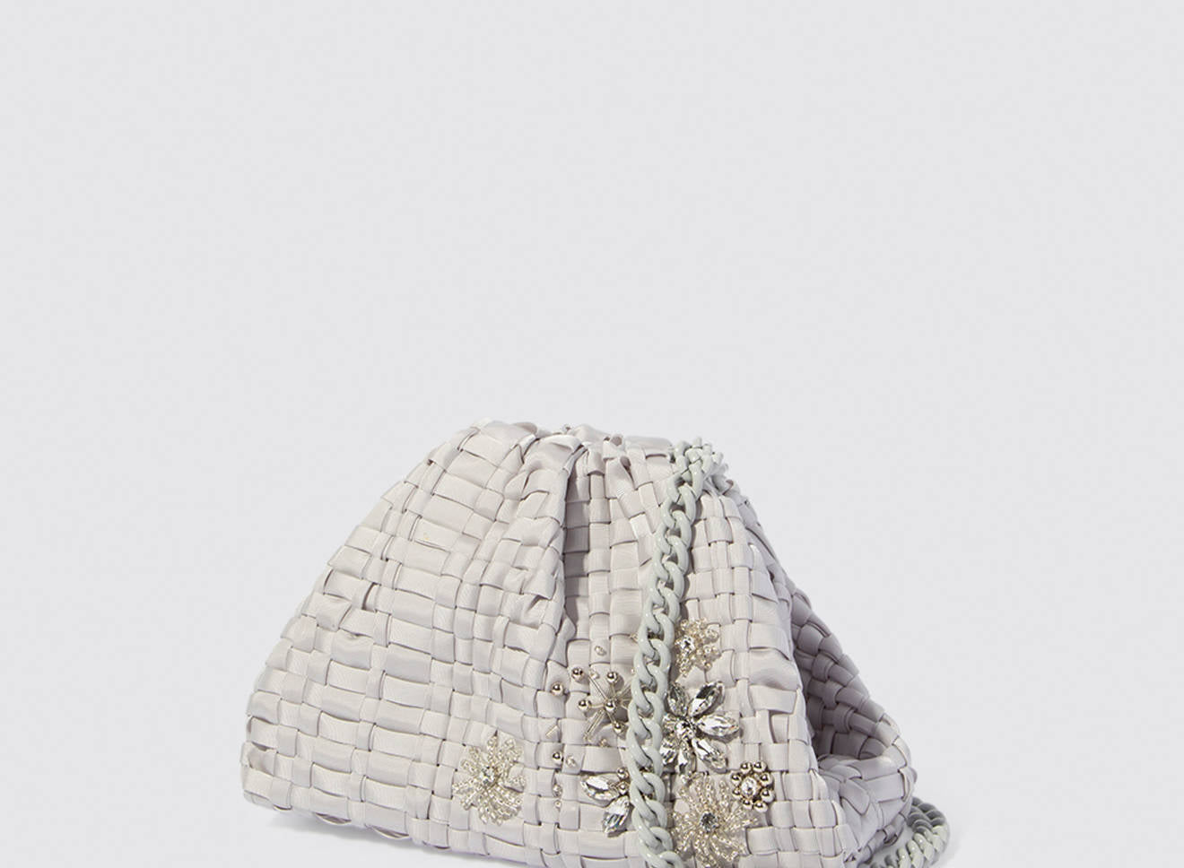 Clutch da donna di piccole dimensioni in tessuto di nastro intrecciato, realizzato a mano su antichi telai. Questa inedita versione ridotta dell’icon bag Maria La Rosa, è capiente quanto basta per portare con sé l'essenziale. Perfetta per tutte le stagioni, costituisce l’emblema di una nuova eleganza metropolitana.Questo modello prende il nome dalle preziose applicazioni ricamate a mano.È dotata di catena ton sur ton per indossarla anche a tracolla e tante sono le varietà cromatiche tra cui poter scegliere.Interamente disegnata e prodotta in Italia.