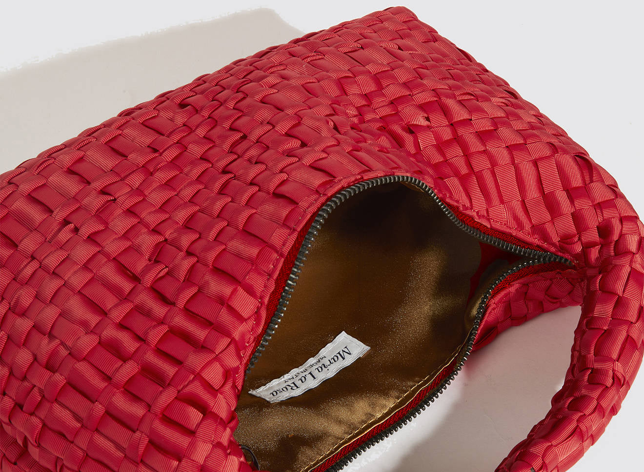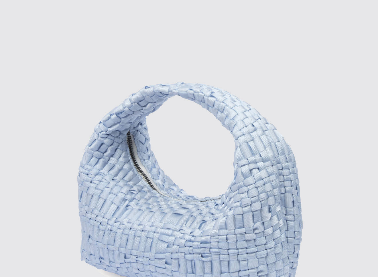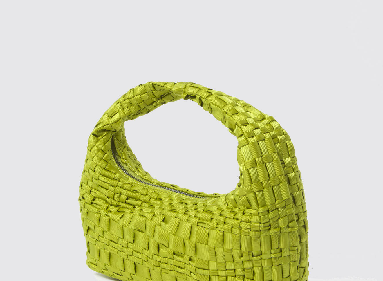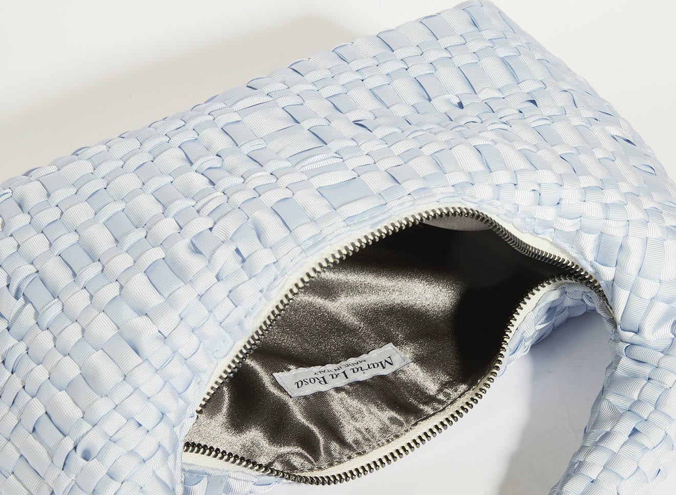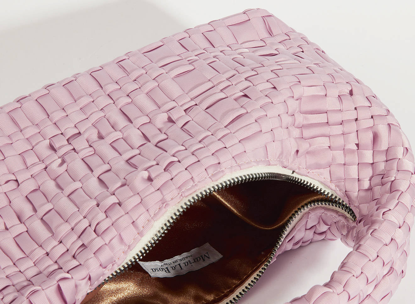Borsa di piccole dimensioni in tessuto di nastro intrecciato, realizzato a mano su antichi telai. Dal design semplice, disponibile in diversi colori tinta unita, è perfetta per la stagione estiva. Dotata di chiusura a zip, manico a fusciacca con nodo, costituisce un modello compatto, dallo stile fresco e vivace. Interamente disegnata e prodotta in Italia.