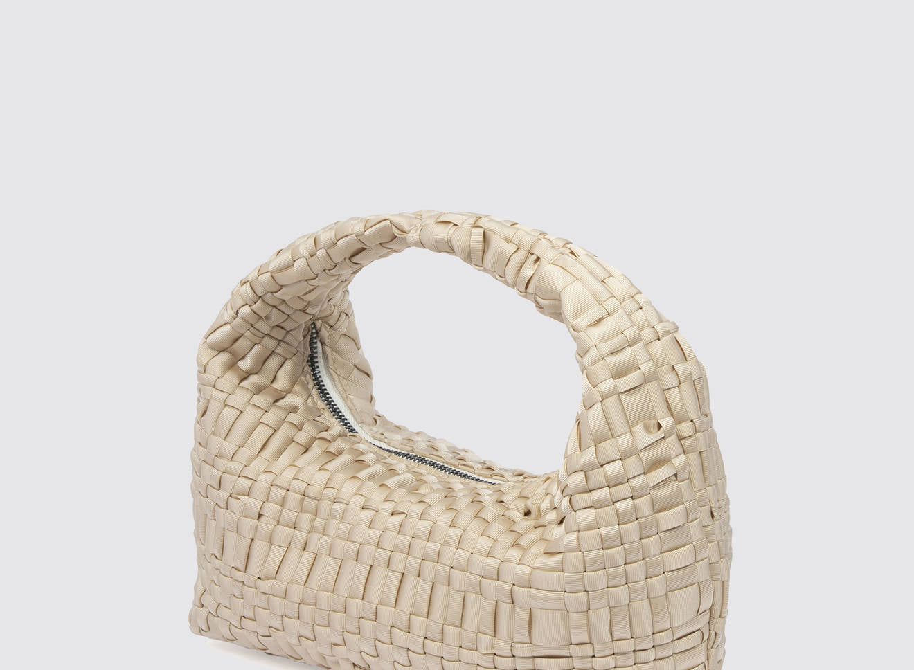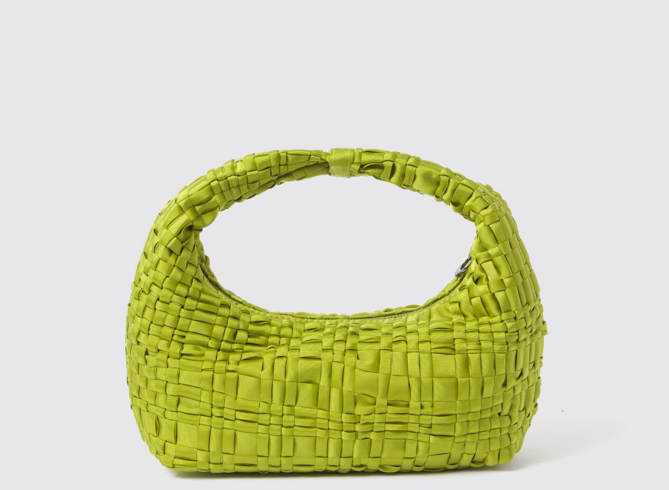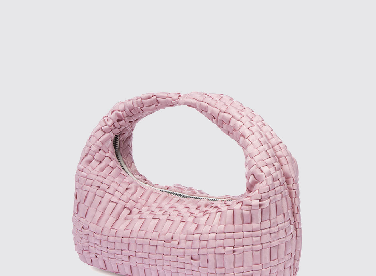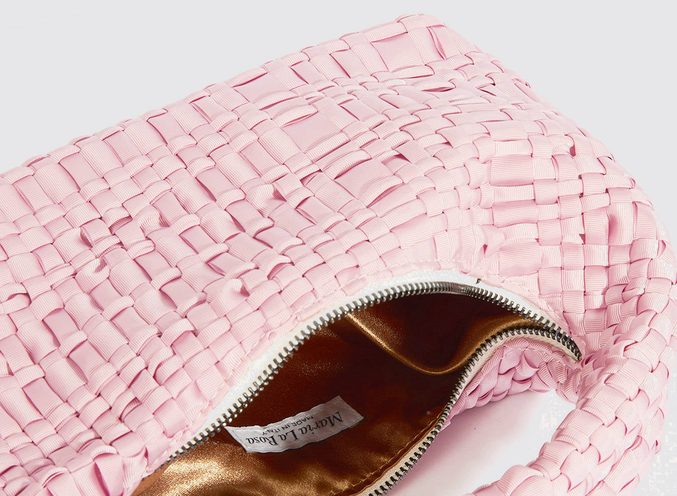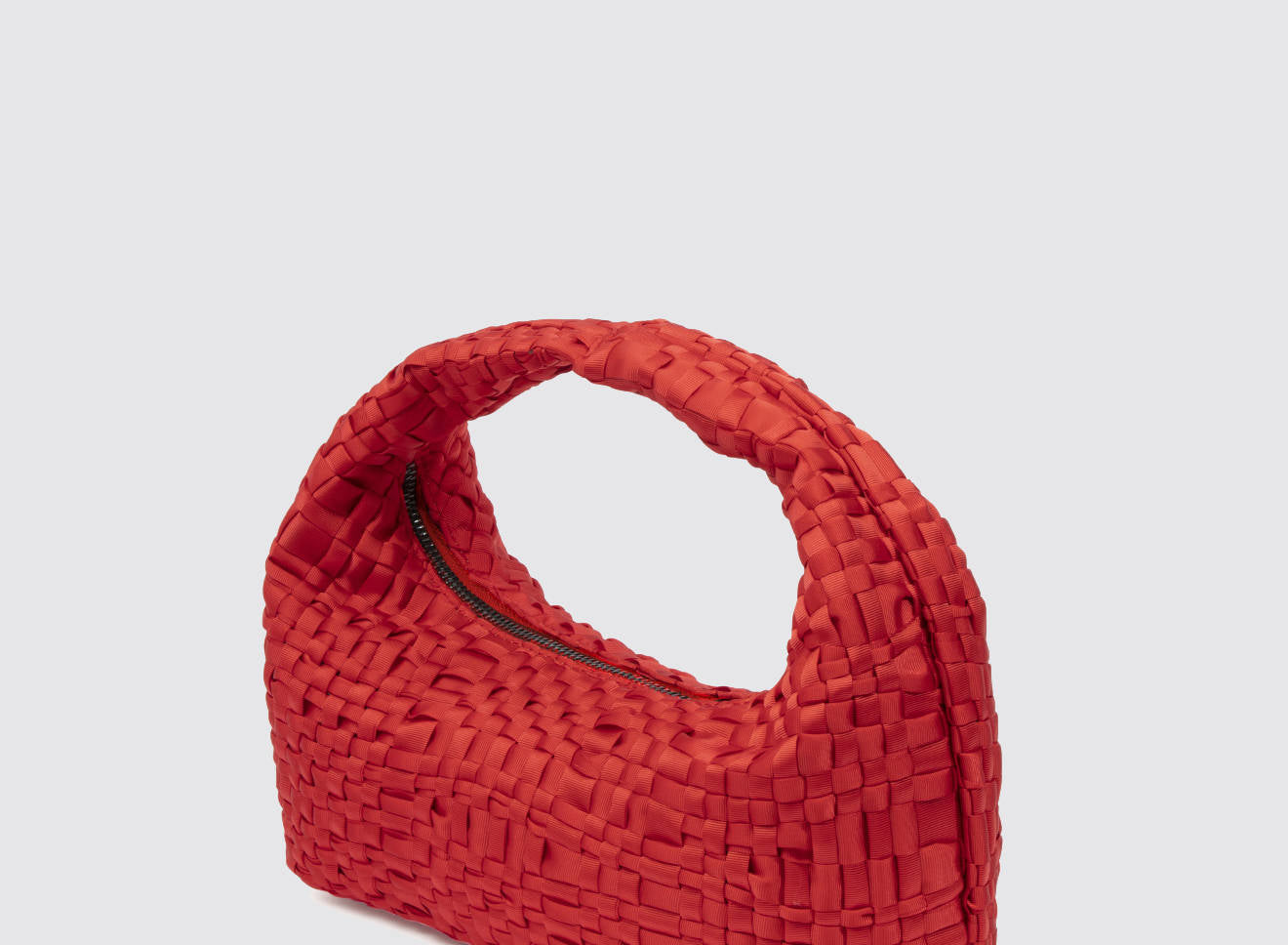 Borsa di piccole dimensioni in tessuto di nastro intrecciato, realizzato a mano su antichi telai. Dal design semplice, disponibile in diversi colori tinta unita, è perfetta per la stagione estiva. Dotata di chiusura a zip, manico a fusciacca con nodo, costituisce un modello compatto, dallo stile fresco e vivace. Interamente disegnata e prodotta in Italia.