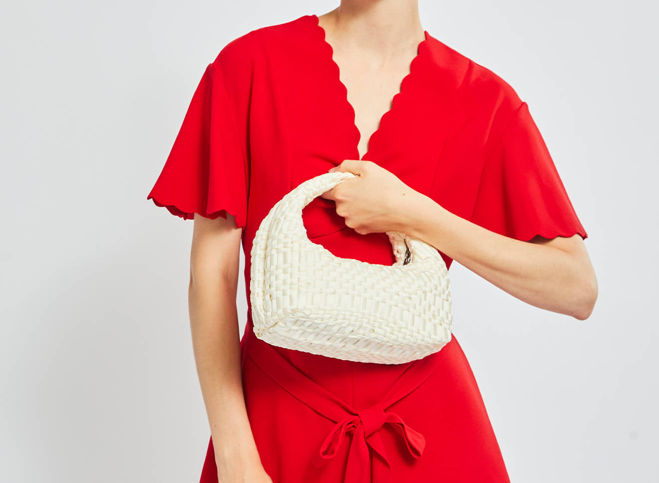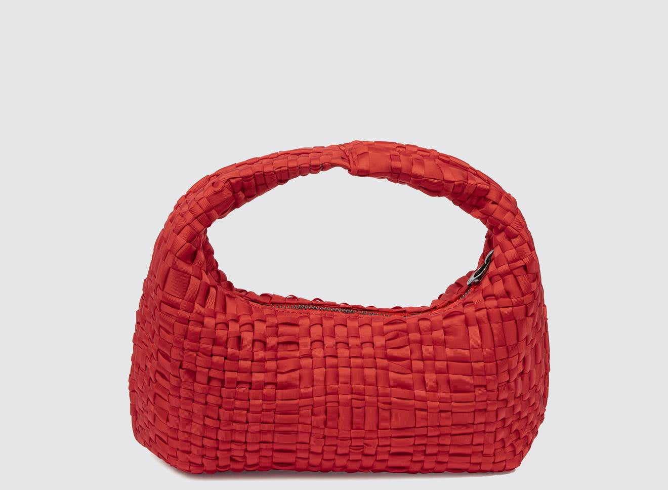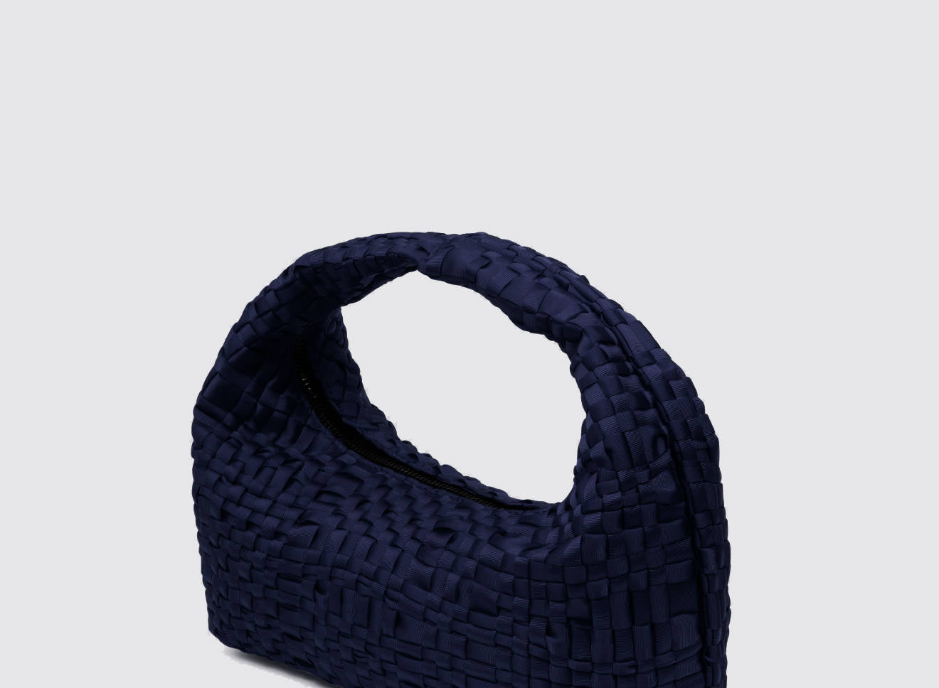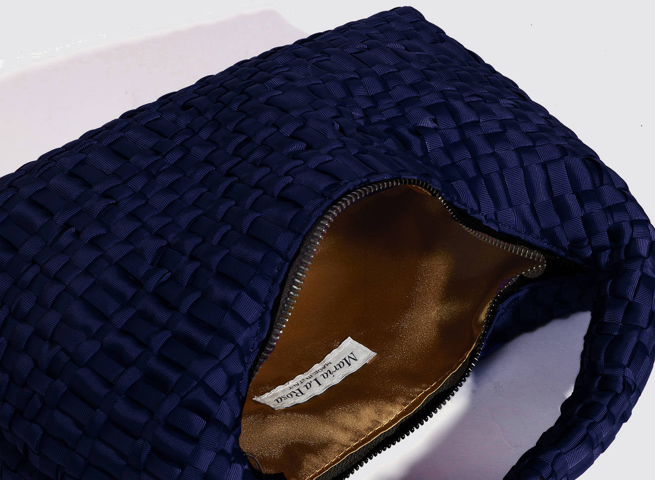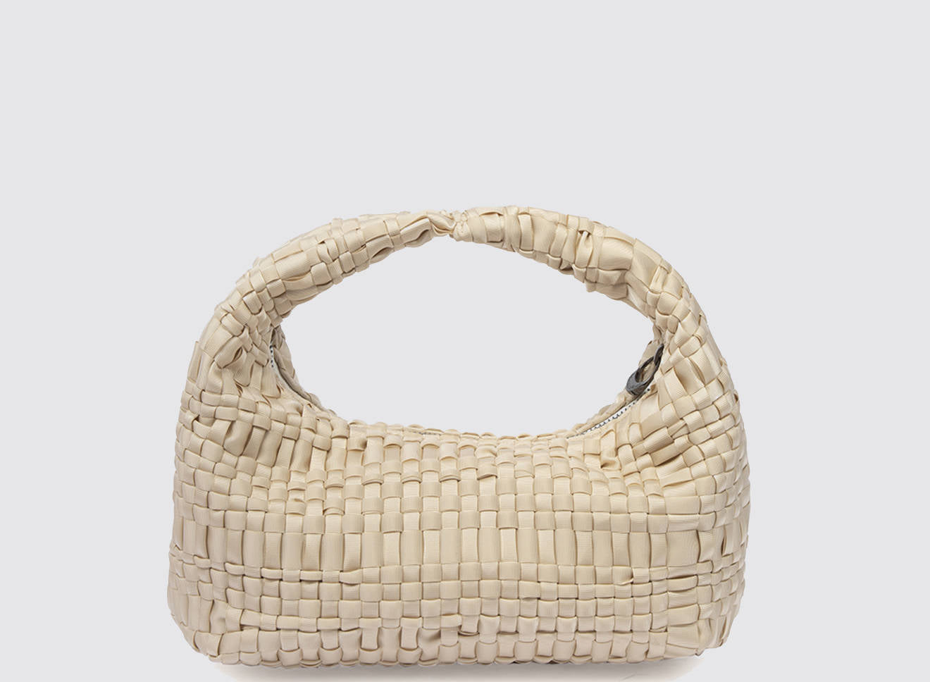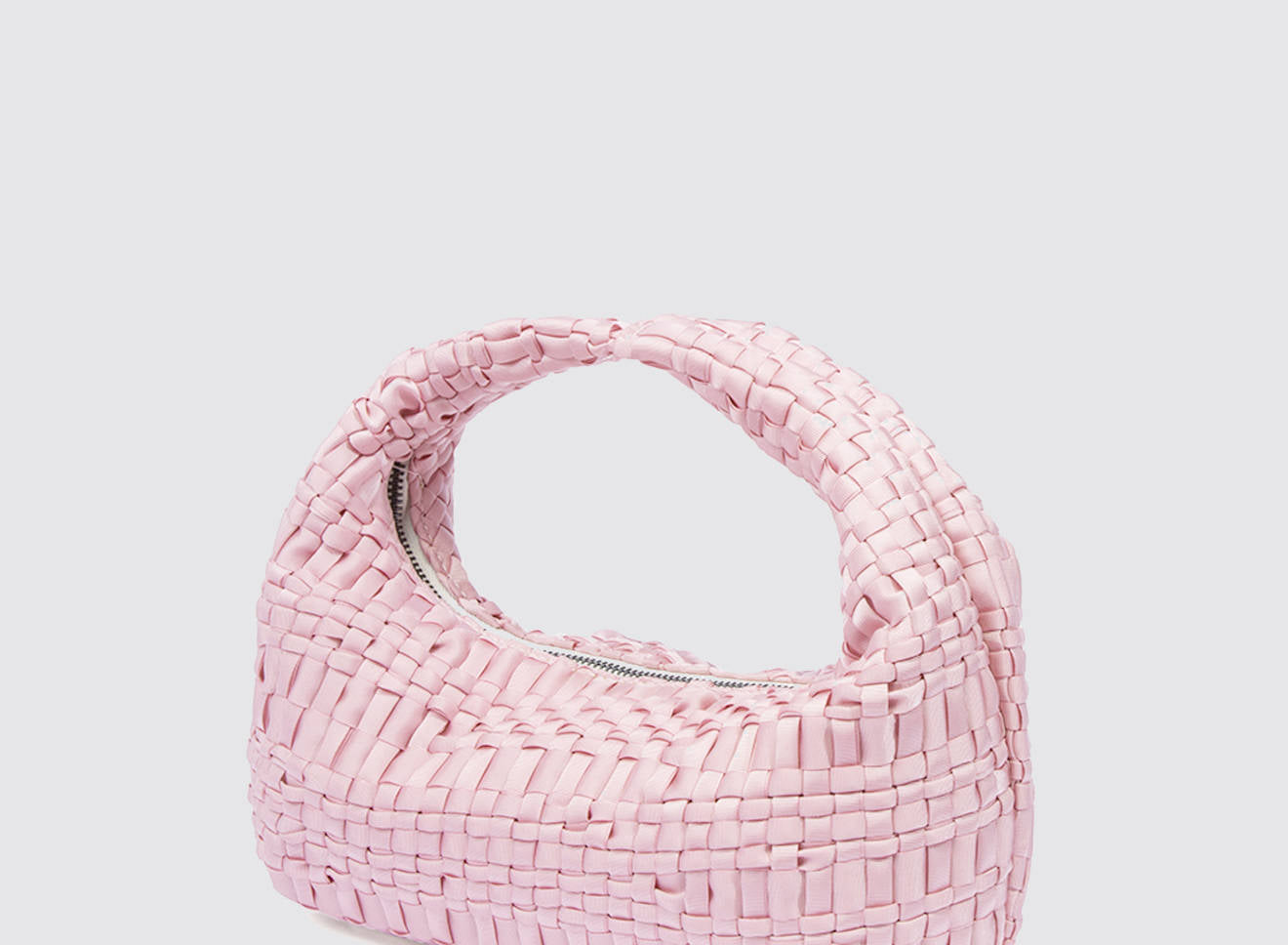 Borsa di piccole dimensioni in tessuto di nastro intrecciato, realizzato a mano su antichi telai. Dal design semplice, disponibile in diversi colori tinta unita, è perfetta per la stagione estiva. Dotata di chiusura a zip, manico a fusciacca con nodo, costituisce un modello compatto, dallo stile fresco e vivace. Interamente disegnata e prodotta in Italia.