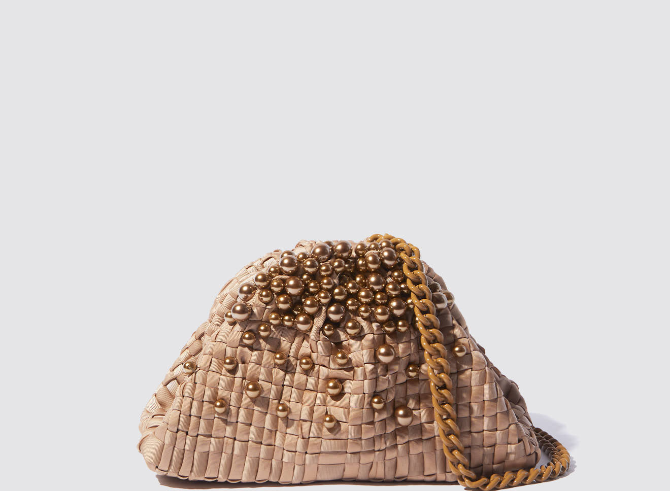 Clutch da donna di piccole dimensioni in tessuto di nastro intrecciato a mano su antichi telai. È arricchita da una cascata di perle color bronzo applicate a mano. È capiente quanto basta per portare con sé l'essenziale. Perfetta per tutte le stagioni, costituisce l’emblema di una nuova eleganza metropolitana. È dotata di catena ton sur ton per indossarla anche a tracolla.