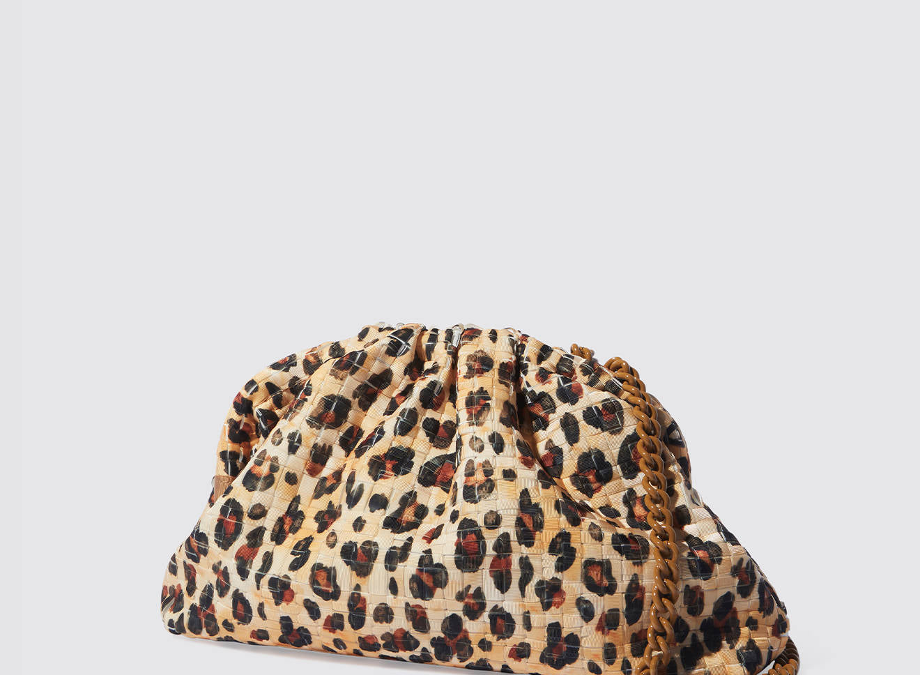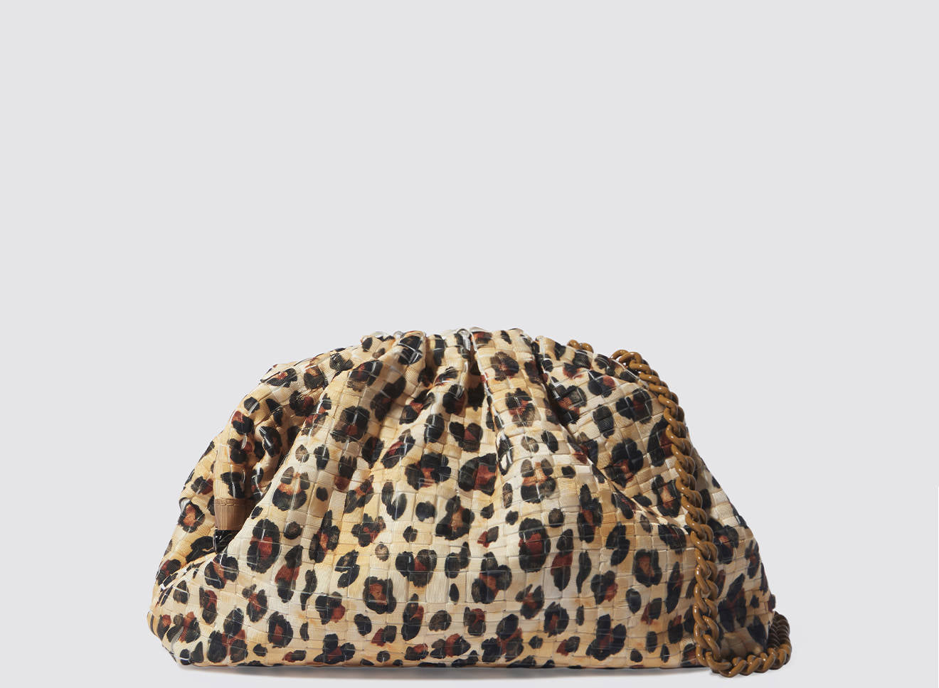 Decisa, sofisticata e d’impatto. Questa clutch è realizzata in nastro intrecciato a telaio, una lavorazione artigianale che unisce struttura e raffinatezza. La stampa animalier leopardata aggiunge un tocco audace e glam, perfetta per dare personalità anche al look più minimal.