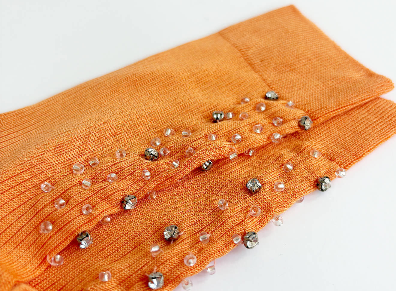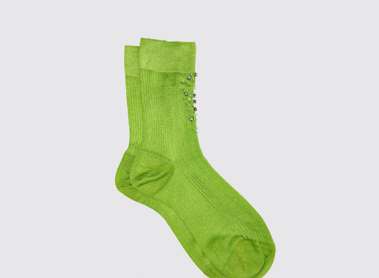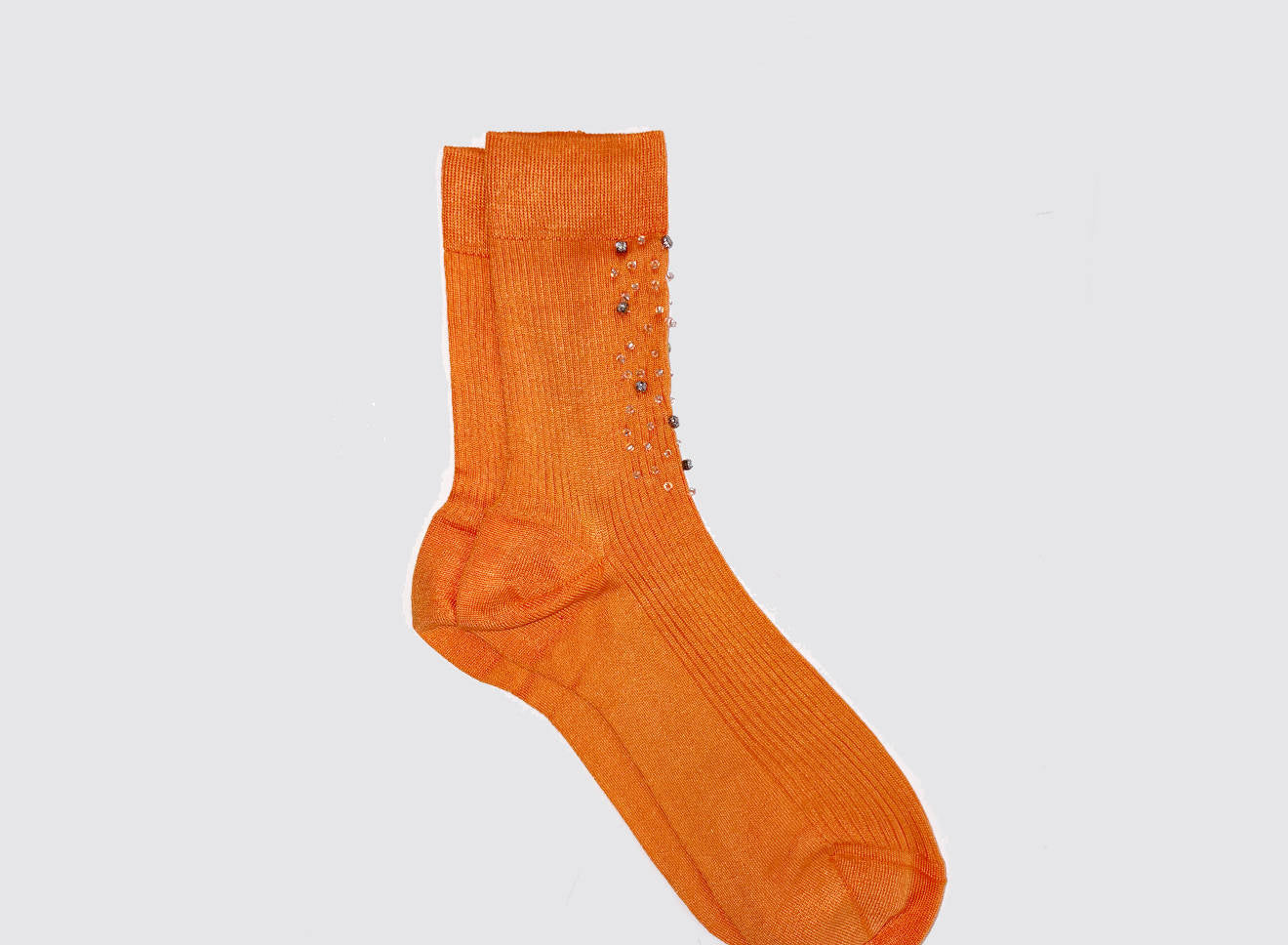 Un tocco di eleganza artigianale per ogni passo. Queste calze in seta pregiata si distinguono per la texture fine e confortevole, arricchita da un ricamo realizzato interamente a mano. Le delicate applicazioni donano luce e raffinatezza, rendendole perfette per aggiungere un dettaglio prezioso a ogni look.