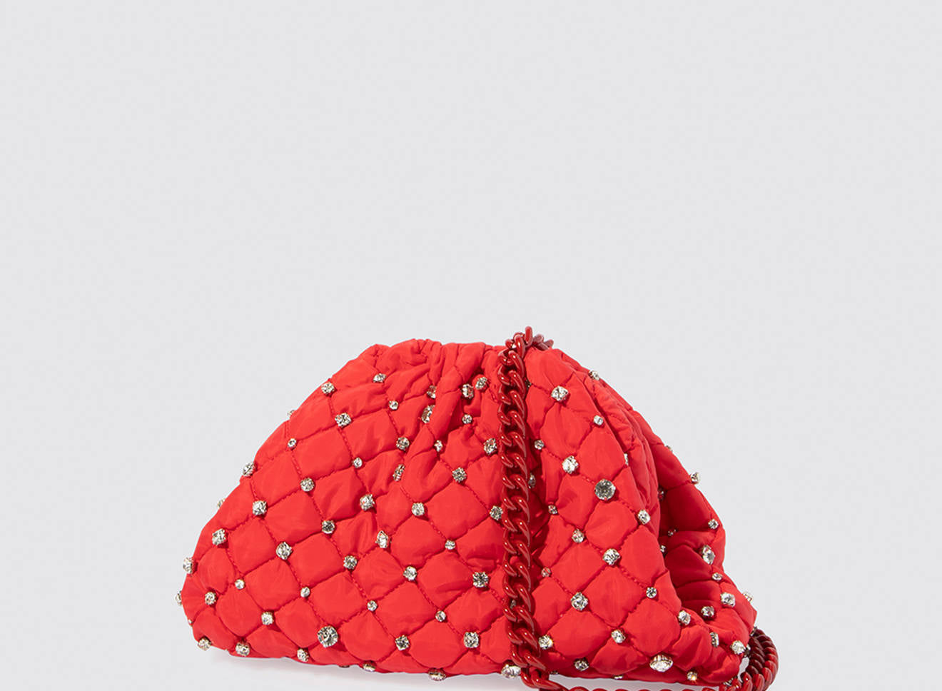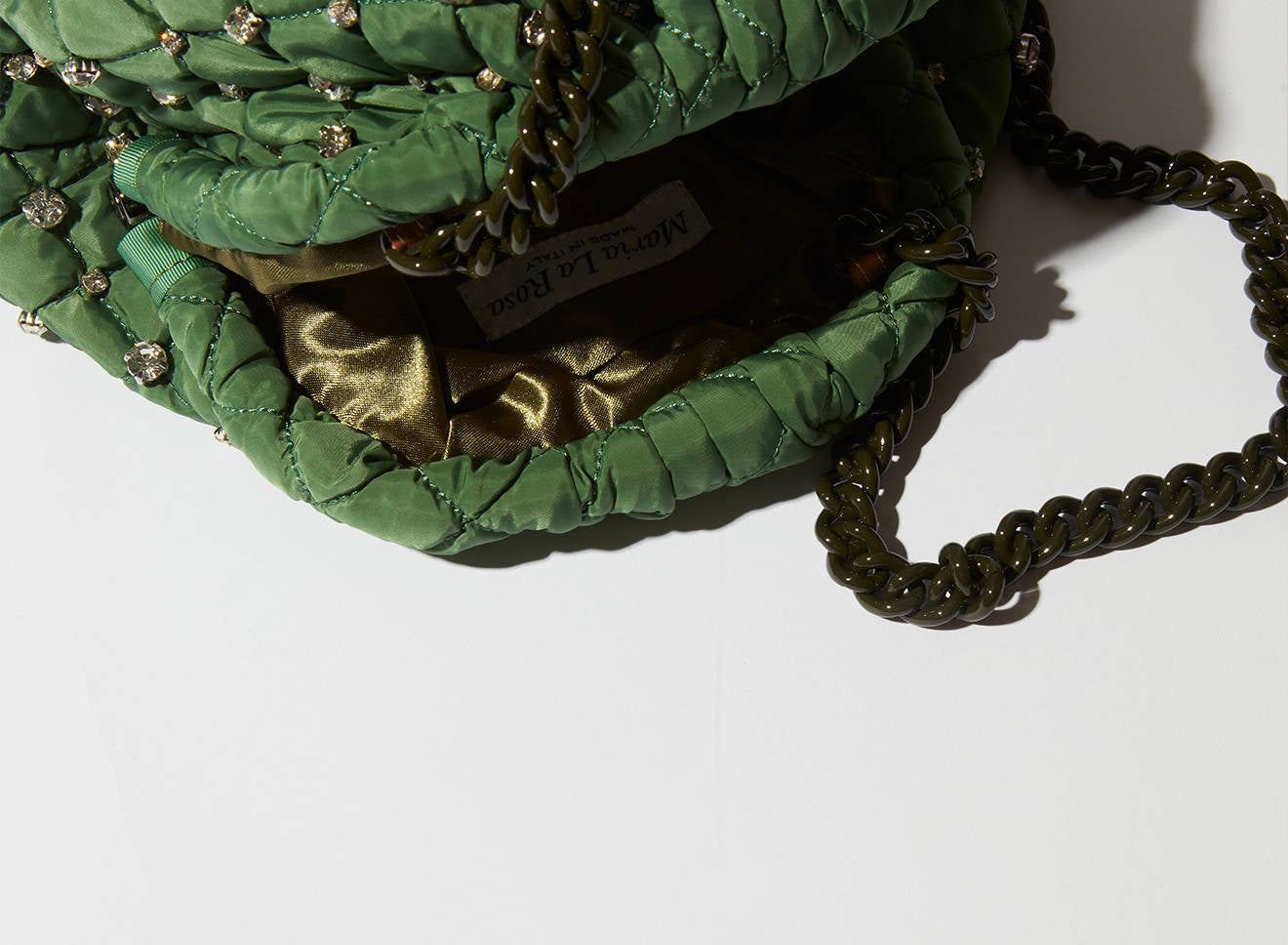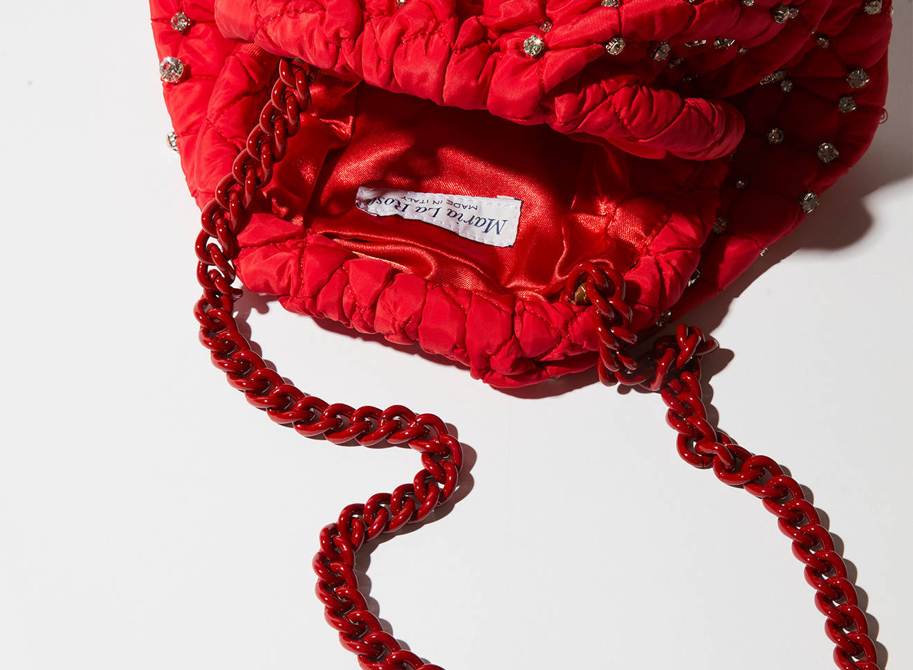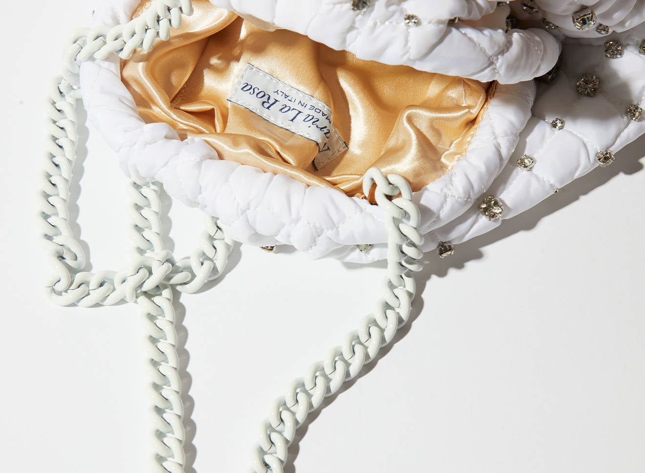 Clutch da donna di piccole dimensioni in tessuto matelassè con strass ricamati a mano. Questa inedita versione ridotta dell’icon bag Maria La Rosa, è capiente quanto basta per portare con sé l'essenziale. Perfetta per la stagione invernale, costituisce l’emblema di una nuova eleganza metropolitana. È dotata di catena ton sur ton per indossarla anche a tracolla.